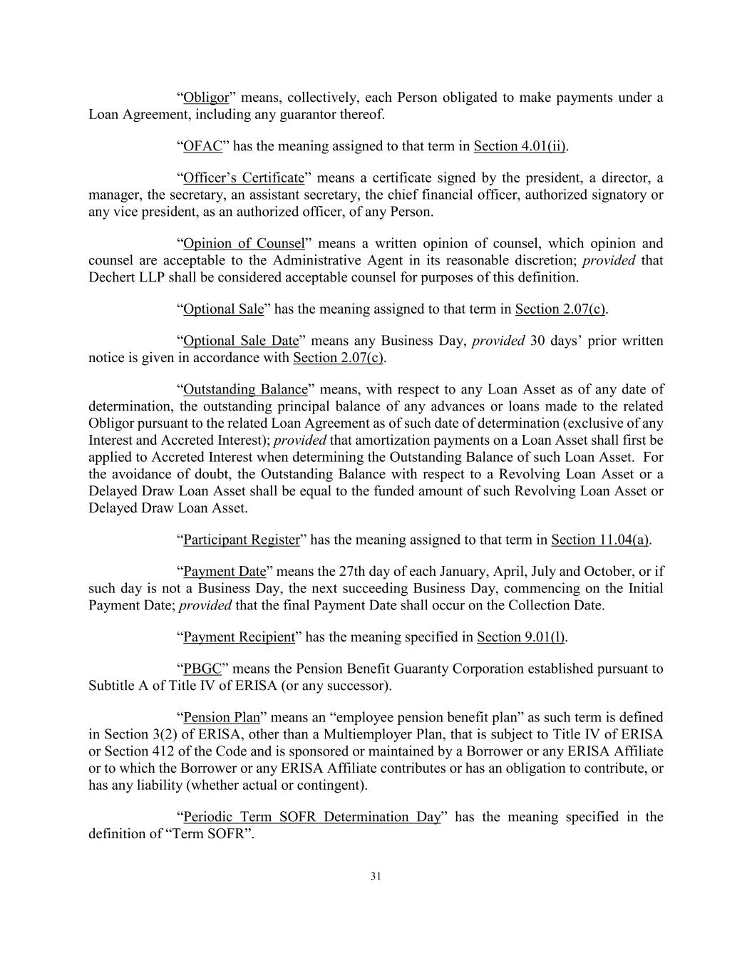 31 “Obligor” means, collectively, each Person obligated to make payments under a Loan Agreement, including any guarantor thereof. “OFAC” has the meaning assigned to that term in Section 4.01(ii). “Officer’s Certificate” means a certificate signed by the president, a director, a manager, the secretary, an assistant secretary, the chief financial officer, authorized signatory or any vice president, as an authorized officer, of any Person. “Opinion of Counsel” means a written opinion of counsel, which opinion and counsel are acceptable to the Administrative Agent in its reasonable discretion; provided that Dechert LLP shall be considered acceptable counsel for purposes of this definition. “Optional Sale” has the meaning assigned to that term in Section 2.07(c). “Optional Sale Date” means any Business Day, provided 30 days’ prior written notice is given in accordance with Section 2.07(c). “Outstanding Balance” means, with respect to any Loan Asset as of any date of determination, the outstanding principal balance of any advances or loans made to the related Obligor pursuant to the related Loan Agreement as of such date of determination (exclusive of any Interest and Accreted Interest); provided that amortization payments on a Loan Asset shall first be applied to Accreted Interest when determining the Outstanding Balance of such Loan Asset. For the avoidance of doubt, the Outstanding Balance with respect to a Revolving Loan Asset or a Delayed Draw Loan Asset shall be equal to the funded amount of such Revolving Loan Asset or Delayed Draw Loan Asset. “Participant Register” has the meaning assigned to that term in Section 11.04(a). “Payment Date” means the 27th day of each January, April, July and October, or if such day is not a Business Day, the next succeeding Business Day, commencing on the Initial Payment Date; provided that the final Payment Date shall occur on the Collection Date. “Payment Recipient” has the meaning specified in Section 9.01(l). “PBGC” means the Pension Benefit Guaranty Corporation established pursuant to Subtitle A of Title IV of ERISA (or any successor). “Pension Plan” means an “employee pension benefit plan” as such term is defined in Section 3(2) of ERISA, other than a Multiemployer Plan, that is subject to Title IV of ERISA or Section 412 of the Code and is sponsored or maintained by a Borrower or any ERISA Affiliate or to which the Borrower or any ERISA Affiliate contributes or has an obligation to contribute, or has any liability (whether actual or contingent). “Periodic Term SOFR Determination Day” has the meaning specified in the definition of “Term SOFR”.