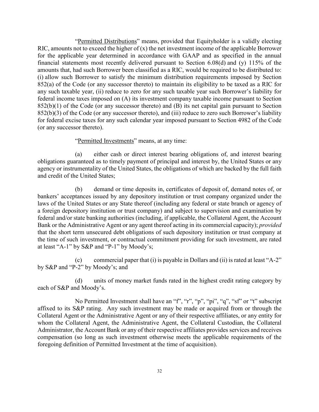 32 “Permitted Distributions” means, provided that Equityholder is a validly electing RIC, amounts not to exceed the higher of (x) the net investment income of the applicable Borrower for the applicable year determined in accordance with GAAP and as specified in the annual financial statements most recently delivered pursuant to Section 6.08(d) and (y) 115% of the amounts that, had such Borrower been classified as a RIC, would be required to be distributed to: (i) allow such Borrower to satisfy the minimum distribution requirements imposed by Section 852(a) of the Code (or any successor thereto) to maintain its eligibility to be taxed as a RIC for any such taxable year, (ii) reduce to zero for any such taxable year such Borrower’s liability for federal income taxes imposed on (A) its investment company taxable income pursuant to Section 852(b)(1) of the Code (or any successor thereto) and (B) its net capital gain pursuant to Section 852(b)(3) of the Code (or any successor thereto), and (iii) reduce to zero such Borrower’s liability for federal excise taxes for any such calendar year imposed pursuant to Section 4982 of the Code (or any successor thereto). “Permitted Investments” means, at any time: (a) either cash or direct interest bearing obligations of, and interest bearing obligations guaranteed as to timely payment of principal and interest by, the United States or any agency or instrumentality of the United States, the obligations of which are backed by the full faith and credit of the United States; (b) demand or time deposits in, certificates of deposit of, demand notes of, or bankers’ acceptances issued by any depository institution or trust company organized under the laws of the United States or any State thereof (including any federal or state branch or agency of a foreign depository institution or trust company) and subject to supervision and examination by federal and/or state banking authorities (including, if applicable, the Collateral Agent, the Account Bank or the Administrative Agent or any agent thereof acting in its commercial capacity); provided that the short term unsecured debt obligations of such depository institution or trust company at the time of such investment, or contractual commitment providing for such investment, are rated at least “A-1” by S&P and “P-1” by Moody’s; (c) commercial paper that (i) is payable in Dollars and (ii) is rated at least “A-2” by S&P and “P-2” by Moody’s; and (d) units of money market funds rated in the highest credit rating category by each of S&P and Moody’s. No Permitted Investment shall have an “f”, “r”, “p”, “pi”, “q”, “sf” or “t” subscript affixed to its S&P rating. Any such investment may be made or acquired from or through the Collateral Agent or the Administrative Agent or any of their respective affiliates, or any entity for whom the Collateral Agent, the Administrative Agent, the Collateral Custodian, the Collateral Administrator, the Account Bank or any of their respective affiliates provides services and receives compensation (so long as such investment otherwise meets the applicable requirements of the foregoing definition of Permitted Investment at the time of acquisition).