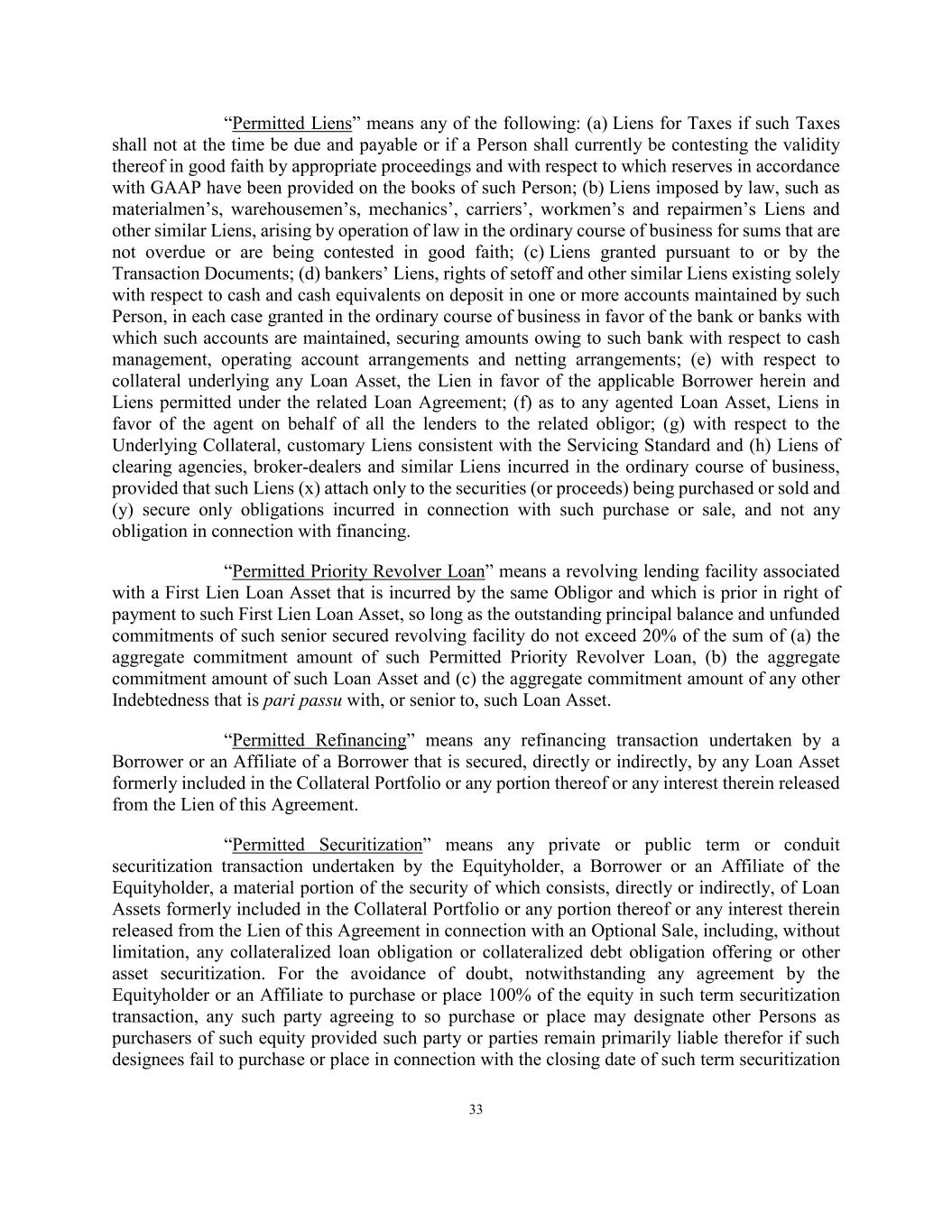 33 “Permitted Liens” means any of the following: (a) Liens for Taxes if such Taxes shall not at the time be due and payable or if a Person shall currently be contesting the validity thereof in good faith by appropriate proceedings and with respect to which reserves in accordance with GAAP have been provided on the books of such Person; (b) Liens imposed by law, such as materialmen’s, warehousemen’s, mechanics’, carriers’, workmen’s and repairmen’s Liens and other similar Liens, arising by operation of law in the ordinary course of business for sums that are not overdue or are being contested in good faith; (c) Liens granted pursuant to or by the Transaction Documents; (d) bankers’ Liens, rights of setoff and other similar Liens existing solely with respect to cash and cash equivalents on deposit in one or more accounts maintained by such Person, in each case granted in the ordinary course of business in favor of the bank or banks with which such accounts are maintained, securing amounts owing to such bank with respect to cash management, operating account arrangements and netting arrangements; (e) with respect to collateral underlying any Loan Asset, the Lien in favor of the applicable Borrower herein and Liens permitted under the related Loan Agreement; (f) as to any agented Loan Asset, Liens in favor of the agent on behalf of all the lenders to the related obligor; (g) with respect to the Underlying Collateral, customary Liens consistent with the Servicing Standard and (h) Liens of clearing agencies, broker-dealers and similar Liens incurred in the ordinary course of business, provided that such Liens (x) attach only to the securities (or proceeds) being purchased or sold and (y) secure only obligations incurred in connection with such purchase or sale, and not any obligation in connection with financing. “Permitted Priority Revolver Loan” means a revolving lending facility associated with a First Lien Loan Asset that is incurred by the same Obligor and which is prior in right of payment to such First Lien Loan Asset, so long as the outstanding principal balance and unfunded commitments of such senior secured revolving facility do not exceed 20% of the sum of (a) the aggregate commitment amount of such Permitted Priority Revolver Loan, (b) the aggregate commitment amount of such Loan Asset and (c) the aggregate commitment amount of any other Indebtedness that is pari passu with, or senior to, such Loan Asset. “Permitted Refinancing” means any refinancing transaction undertaken by a Borrower or an Affiliate of a Borrower that is secured, directly or indirectly, by any Loan Asset formerly included in the Collateral Portfolio or any portion thereof or any interest therein released from the Lien of this Agreement. “Permitted Securitization” means any private or public term or conduit securitization transaction undertaken by the Equityholder, a Borrower or an Affiliate of the Equityholder, a material portion of the security of which consists, directly or indirectly, of Loan Assets formerly included in the Collateral Portfolio or any portion thereof or any interest therein released from the Lien of this Agreement in connection with an Optional Sale, including, without limitation, any collateralized loan obligation or collateralized debt obligation offering or other asset securitization. For the avoidance of doubt, notwithstanding any agreement by the Equityholder or an Affiliate to purchase or place 100% of the equity in such term securitization transaction, any such party agreeing to so purchase or place may designate other Persons as purchasers of such equity provided such party or parties remain primarily liable therefor if such designees fail to purchase or place in connection with the closing date of such term securitization