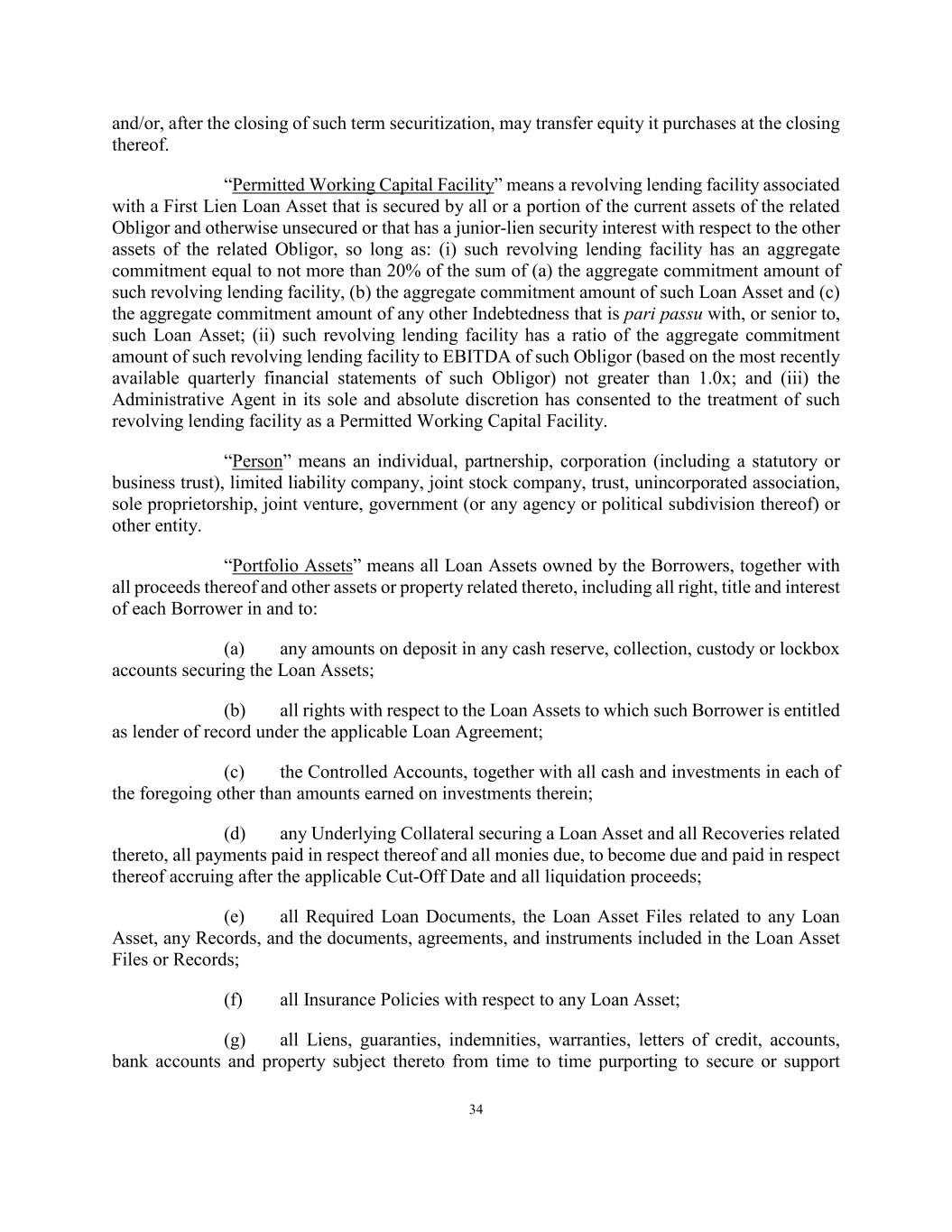 34 and/or, after the closing of such term securitization, may transfer equity it purchases at the closing thereof. “Permitted Working Capital Facility” means a revolving lending facility associated with a First Lien Loan Asset that is secured by all or a portion of the current assets of the related Obligor and otherwise unsecured or that has a junior-lien security interest with respect to the other assets of the related Obligor, so long as: (i) such revolving lending facility has an aggregate commitment equal to not more than 20% of the sum of (a) the aggregate commitment amount of such revolving lending facility, (b) the aggregate commitment amount of such Loan Asset and (c) the aggregate commitment amount of any other Indebtedness that is pari passu with, or senior to, such Loan Asset; (ii) such revolving lending facility has a ratio of the aggregate commitment amount of such revolving lending facility to EBITDA of such Obligor (based on the most recently available quarterly financial statements of such Obligor) not greater than 1.0x; and (iii) the Administrative Agent in its sole and absolute discretion has consented to the treatment of such revolving lending facility as a Permitted Working Capital Facility. “Person” means an individual, partnership, corporation (including a statutory or business trust), limited liability company, joint stock company, trust, unincorporated association, sole proprietorship, joint venture, government (or any agency or political subdivision thereof) or other entity. “Portfolio Assets” means all Loan Assets owned by the Borrowers, together with all proceeds thereof and other assets or property related thereto, including all right, title and interest of each Borrower in and to: (a) any amounts on deposit in any cash reserve, collection, custody or lockbox accounts securing the Loan Assets; (b) all rights with respect to the Loan Assets to which such Borrower is entitled as lender of record under the applicable Loan Agreement; (c) the Controlled Accounts, together with all cash and investments in each of the foregoing other than amounts earned on investments therein; (d) any Underlying Collateral securing a Loan Asset and all Recoveries related thereto, all payments paid in respect thereof and all monies due, to become due and paid in respect thereof accruing after the applicable Cut-Off Date and all liquidation proceeds; (e) all Required Loan Documents, the Loan Asset Files related to any Loan Asset, any Records, and the documents, agreements, and instruments included in the Loan Asset Files or Records; (f) all Insurance Policies with respect to any Loan Asset; (g) all Liens, guaranties, indemnities, warranties, letters of credit, accounts, bank accounts and property subject thereto from time to time purporting to secure or support