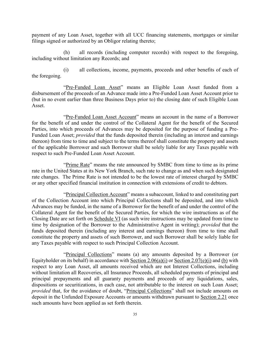 35 payment of any Loan Asset, together with all UCC financing statements, mortgages or similar filings signed or authorized by an Obligor relating thereto; (h) all records (including computer records) with respect to the foregoing, including without limitation any Records; and (i) all collections, income, payments, proceeds and other benefits of each of the foregoing. “Pre-Funded Loan Asset” means an Eligible Loan Asset funded from a disbursement of the proceeds of an Advance made into a Pre-Funded Loan Asset Account prior to (but in no event earlier than three Business Days prior to) the closing date of such Eligible Loan Asset. “Pre-Funded Loan Asset Account” means an account in the name of a Borrower for the benefit of and under the control of the Collateral Agent for the benefit of the Secured Parties, into which proceeds of Advances may be deposited for the purpose of funding a Pre- Funded Loan Asset; provided that the funds deposited therein (including an interest and earnings thereon) from time to time and subject to the terms thereof shall constitute the property and assets of the applicable Borrower and such Borrower shall be solely liable for any Taxes payable with respect to such Pre-Funded Loan Asset Account. “Prime Rate” means the rate announced by SMBC from time to time as its prime rate in the United States at its New York Branch, such rate to change as and when such designated rate changes. The Prime Rate is not intended to be the lowest rate of interest charged by SMBC or any other specified financial institution in connection with extensions of credit to debtors. “Principal Collection Account” means a subaccount, linked to and constituting part of the Collection Account into which Principal Collections shall be deposited, and into which Advances may be funded, in the name of a Borrower for the benefit of and under the control of the Collateral Agent for the benefit of the Secured Parties, for which the wire instructions as of the Closing Date are set forth on Schedule VI (as such wire instructions may be updated from time to time by designation of the Borrower to the Administrative Agent in writing); provided that the funds deposited therein (including any interest and earnings thereon) from time to time shall constitute the property and assets of such Borrower, and such Borrower shall be solely liable for any Taxes payable with respect to such Principal Collection Account. “Principal Collections” means (a) any amounts deposited by a Borrower (or Equityholder on its behalf) in accordance with Section 2.06(a)(i) or Section 2.07(e)(i) and (b) with respect to any Loan Asset, all amounts received which are not Interest Collections, including without limitation all Recoveries, all Insurance Proceeds, all scheduled payments of principal and principal prepayments and all guaranty payments and proceeds of any liquidations, sales, dispositions or securitizations, in each case, not attributable to the interest on such Loan Asset; provided that, for the avoidance of doubt, “Principal Collections” shall not include amounts on deposit in the Unfunded Exposure Accounts or amounts withdrawn pursuant to Section 2.21 once such amounts have been applied as set forth therein.