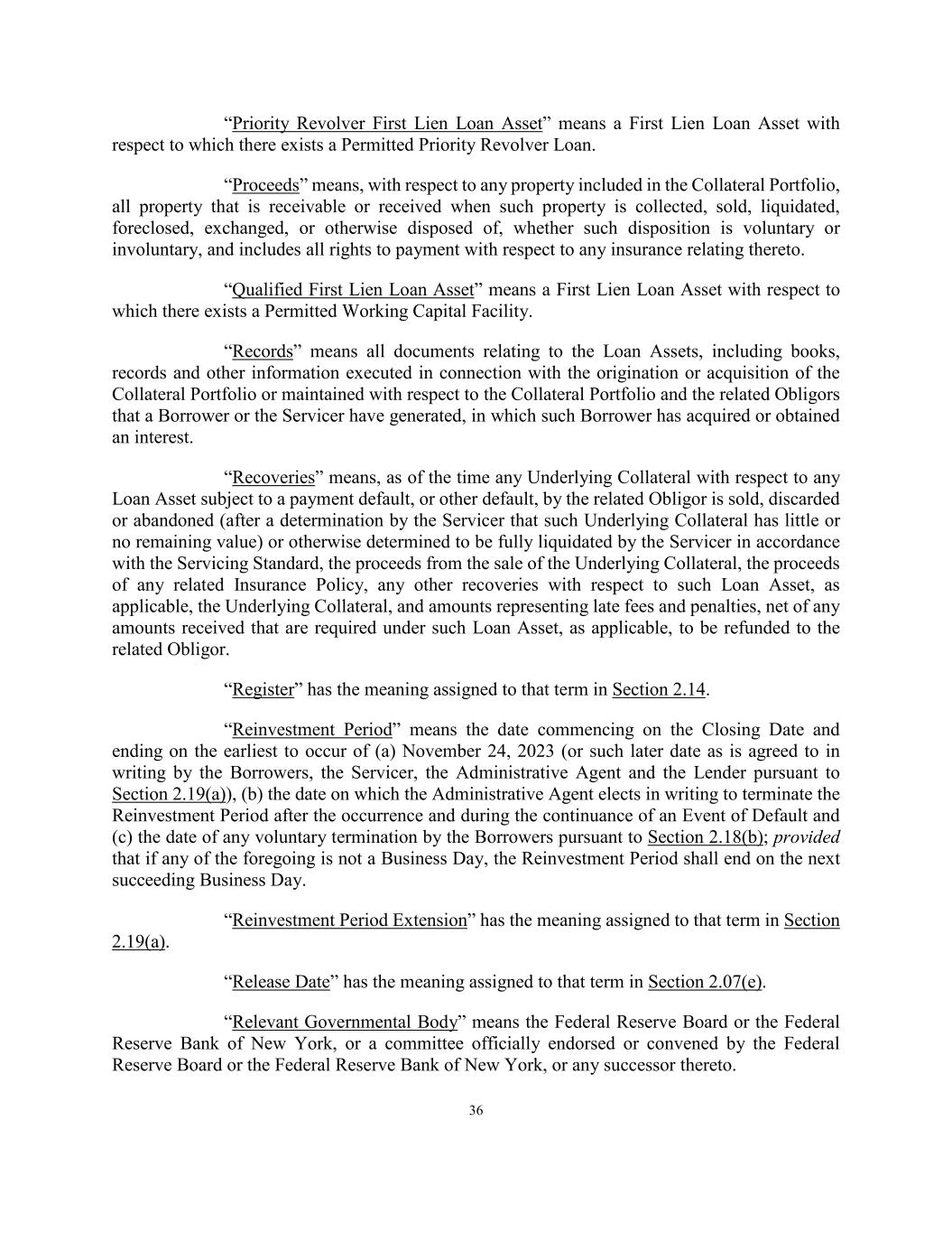 36 “Priority Revolver First Lien Loan Asset” means a First Lien Loan Asset with respect to which there exists a Permitted Priority Revolver Loan. “Proceeds” means, with respect to any property included in the Collateral Portfolio, all property that is receivable or received when such property is collected, sold, liquidated, foreclosed, exchanged, or otherwise disposed of, whether such disposition is voluntary or involuntary, and includes all rights to payment with respect to any insurance relating thereto. “Qualified First Lien Loan Asset” means a First Lien Loan Asset with respect to which there exists a Permitted Working Capital Facility. “Records” means all documents relating to the Loan Assets, including books, records and other information executed in connection with the origination or acquisition of the Collateral Portfolio or maintained with respect to the Collateral Portfolio and the related Obligors that a Borrower or the Servicer have generated, in which such Borrower has acquired or obtained an interest. “Recoveries” means, as of the time any Underlying Collateral with respect to any Loan Asset subject to a payment default, or other default, by the related Obligor is sold, discarded or abandoned (after a determination by the Servicer that such Underlying Collateral has little or no remaining value) or otherwise determined to be fully liquidated by the Servicer in accordance with the Servicing Standard, the proceeds from the sale of the Underlying Collateral, the proceeds of any related Insurance Policy, any other recoveries with respect to such Loan Asset, as applicable, the Underlying Collateral, and amounts representing late fees and penalties, net of any amounts received that are required under such Loan Asset, as applicable, to be refunded to the related Obligor. “Register” has the meaning assigned to that term in Section 2.14. “Reinvestment Period” means the date commencing on the Closing Date and ending on the earliest to occur of (a) November 24, 2023 (or such later date as is agreed to in writing by the Borrowers, the Servicer, the Administrative Agent and the Lender pursuant to Section 2.19(a)), (b) the date on which the Administrative Agent elects in writing to terminate the Reinvestment Period after the occurrence and during the continuance of an Event of Default and (c) the date of any voluntary termination by the Borrowers pursuant to Section 2.18(b); provided that if any of the foregoing is not a Business Day, the Reinvestment Period shall end on the next succeeding Business Day. “Reinvestment Period Extension” has the meaning assigned to that term in Section 2.19(a). “Release Date” has the meaning assigned to that term in Section 2.07(e). “Relevant Governmental Body” means the Federal Reserve Board or the Federal Reserve Bank of New York, or a committee officially endorsed or convened by the Federal Reserve Board or the Federal Reserve Bank of New York, or any successor thereto.