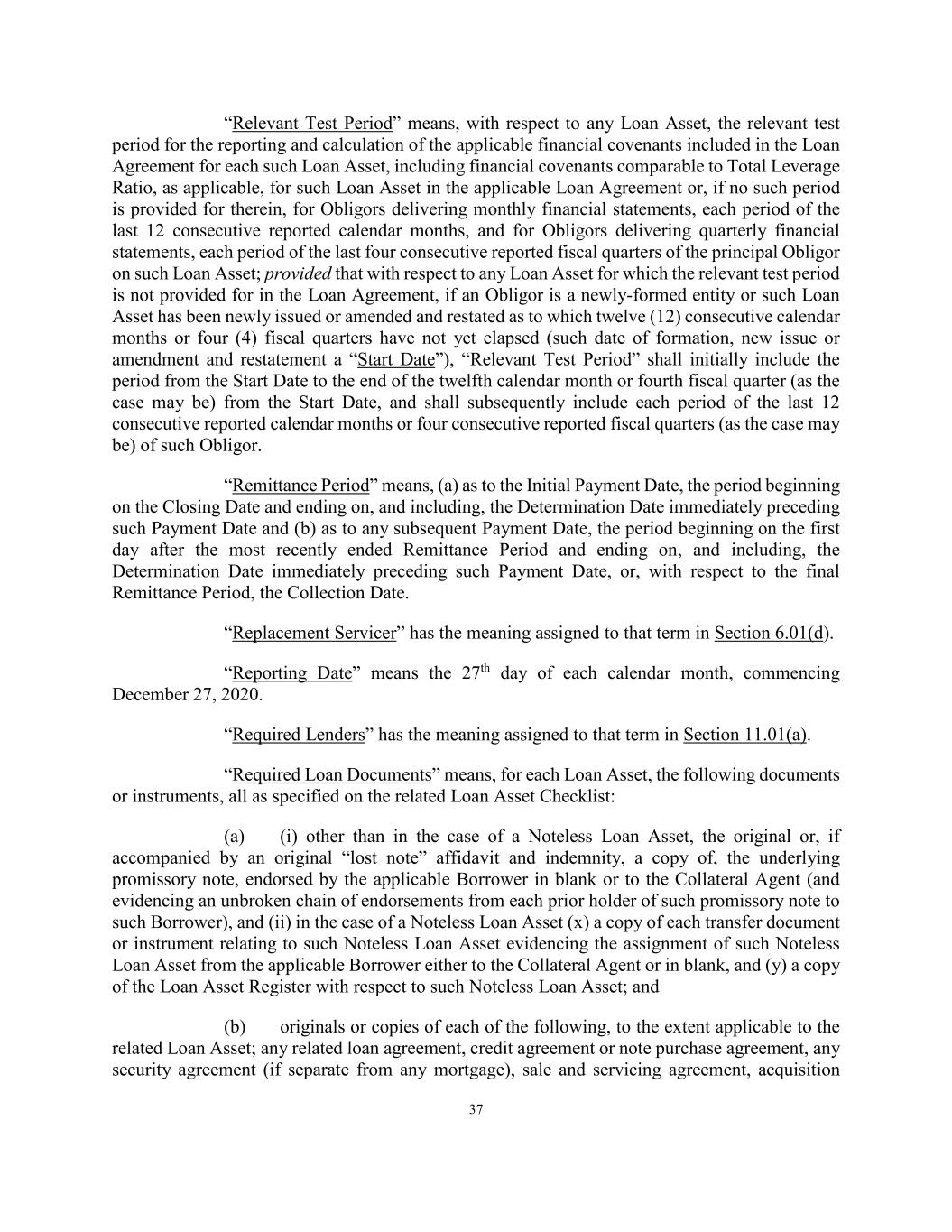 37 “Relevant Test Period” means, with respect to any Loan Asset, the relevant test period for the reporting and calculation of the applicable financial covenants included in the Loan Agreement for each such Loan Asset, including financial covenants comparable to Total Leverage Ratio, as applicable, for such Loan Asset in the applicable Loan Agreement or, if no such period is provided for therein, for Obligors delivering monthly financial statements, each period of the last 12 consecutive reported calendar months, and for Obligors delivering quarterly financial statements, each period of the last four consecutive reported fiscal quarters of the principal Obligor on such Loan Asset; provided that with respect to any Loan Asset for which the relevant test period is not provided for in the Loan Agreement, if an Obligor is a newly-formed entity or such Loan Asset has been newly issued or amended and restated as to which twelve (12) consecutive calendar months or four (4) fiscal quarters have not yet elapsed (such date of formation, new issue or amendment and restatement a “Start Date”), “Relevant Test Period” shall initially include the period from the Start Date to the end of the twelfth calendar month or fourth fiscal quarter (as the case may be) from the Start Date, and shall subsequently include each period of the last 12 consecutive reported calendar months or four consecutive reported fiscal quarters (as the case may be) of such Obligor. “Remittance Period” means, (a) as to the Initial Payment Date, the period beginning on the Closing Date and ending on, and including, the Determination Date immediately preceding such Payment Date and (b) as to any subsequent Payment Date, the period beginning on the first day after the most recently ended Remittance Period and ending on, and including, the Determination Date immediately preceding such Payment Date, or, with respect to the final Remittance Period, the Collection Date. “Replacement Servicer” has the meaning assigned to that term in Section 6.01(d). “Reporting Date” means the 27th day of each calendar month, commencing December 27, 2020. “Required Lenders” has the meaning assigned to that term in Section 11.01(a). “Required Loan Documents” means, for each Loan Asset, the following documents or instruments, all as specified on the related Loan Asset Checklist: (a) (i) other than in the case of a Noteless Loan Asset, the original or, if accompanied by an original “lost note” affidavit and indemnity, a copy of, the underlying promissory note, endorsed by the applicable Borrower in blank or to the Collateral Agent (and evidencing an unbroken chain of endorsements from each prior holder of such promissory note to such Borrower), and (ii) in the case of a Noteless Loan Asset (x) a copy of each transfer document or instrument relating to such Noteless Loan Asset evidencing the assignment of such Noteless Loan Asset from the applicable Borrower either to the Collateral Agent or in blank, and (y) a copy of the Loan Asset Register with respect to such Noteless Loan Asset; and (b) originals or copies of each of the following, to the extent applicable to the related Loan Asset; any related loan agreement, credit agreement or note purchase agreement, any security agreement (if separate from any mortgage), sale and servicing agreement, acquisition