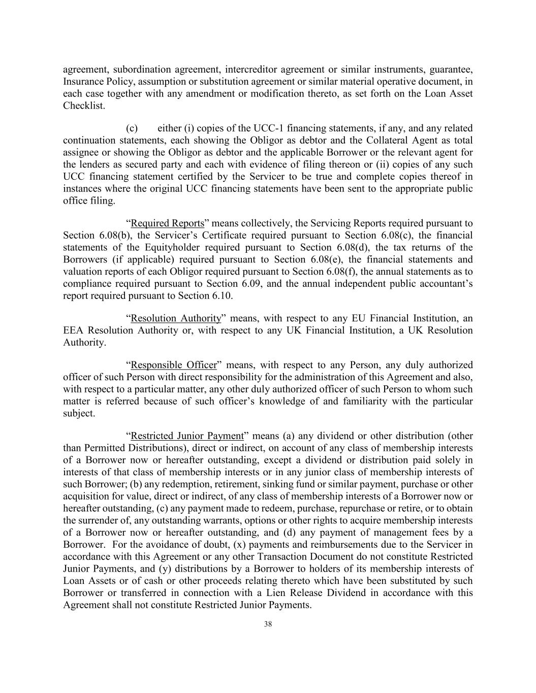 38 agreement, subordination agreement, intercreditor agreement or similar instruments, guarantee, Insurance Policy, assumption or substitution agreement or similar material operative document, in each case together with any amendment or modification thereto, as set forth on the Loan Asset Checklist. (c) either (i) copies of the UCC-1 financing statements, if any, and any related continuation statements, each showing the Obligor as debtor and the Collateral Agent as total assignee or showing the Obligor as debtor and the applicable Borrower or the relevant agent for the lenders as secured party and each with evidence of filing thereon or (ii) copies of any such UCC financing statement certified by the Servicer to be true and complete copies thereof in instances where the original UCC financing statements have been sent to the appropriate public office filing. “Required Reports” means collectively, the Servicing Reports required pursuant to Section 6.08(b), the Servicer’s Certificate required pursuant to Section 6.08(c), the financial statements of the Equityholder required pursuant to Section 6.08(d), the tax returns of the Borrowers (if applicable) required pursuant to Section 6.08(e), the financial statements and valuation reports of each Obligor required pursuant to Section 6.08(f), the annual statements as to compliance required pursuant to Section 6.09, and the annual independent public accountant’s report required pursuant to Section 6.10. “Resolution Authority” means, with respect to any EU Financial Institution, an EEA Resolution Authority or, with respect to any UK Financial Institution, a UK Resolution Authority. “Responsible Officer” means, with respect to any Person, any duly authorized officer of such Person with direct responsibility for the administration of this Agreement and also, with respect to a particular matter, any other duly authorized officer of such Person to whom such matter is referred because of such officer’s knowledge of and familiarity with the particular subject. “Restricted Junior Payment” means (a) any dividend or other distribution (other than Permitted Distributions), direct or indirect, on account of any class of membership interests of a Borrower now or hereafter outstanding, except a dividend or distribution paid solely in interests of that class of membership interests or in any junior class of membership interests of such Borrower; (b) any redemption, retirement, sinking fund or similar payment, purchase or other acquisition for value, direct or indirect, of any class of membership interests of a Borrower now or hereafter outstanding, (c) any payment made to redeem, purchase, repurchase or retire, or to obtain the surrender of, any outstanding warrants, options or other rights to acquire membership interests of a Borrower now or hereafter outstanding, and (d) any payment of management fees by a Borrower. For the avoidance of doubt, (x) payments and reimbursements due to the Servicer in accordance with this Agreement or any other Transaction Document do not constitute Restricted Junior Payments, and (y) distributions by a Borrower to holders of its membership interests of Loan Assets or of cash or other proceeds relating thereto which have been substituted by such Borrower or transferred in connection with a Lien Release Dividend in accordance with this Agreement shall not constitute Restricted Junior Payments.
