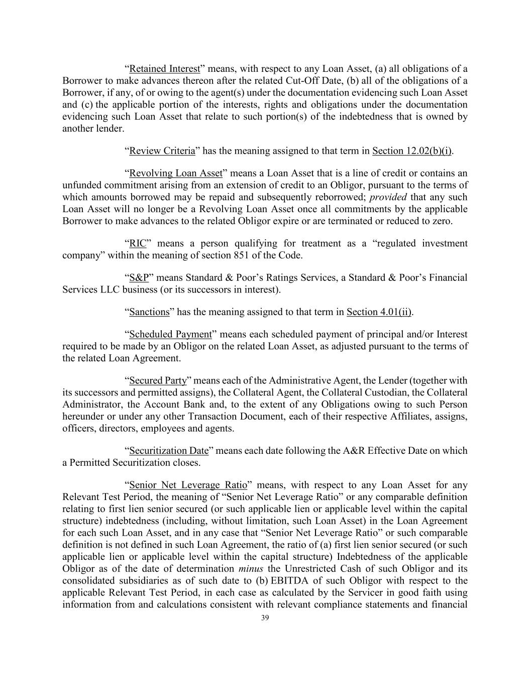 39 “Retained Interest” means, with respect to any Loan Asset, (a) all obligations of a Borrower to make advances thereon after the related Cut-Off Date, (b) all of the obligations of a Borrower, if any, of or owing to the agent(s) under the documentation evidencing such Loan Asset and (c) the applicable portion of the interests, rights and obligations under the documentation evidencing such Loan Asset that relate to such portion(s) of the indebtedness that is owned by another lender. “Review Criteria” has the meaning assigned to that term in Section 12.02(b)(i). “Revolving Loan Asset” means a Loan Asset that is a line of credit or contains an unfunded commitment arising from an extension of credit to an Obligor, pursuant to the terms of which amounts borrowed may be repaid and subsequently reborrowed; provided that any such Loan Asset will no longer be a Revolving Loan Asset once all commitments by the applicable Borrower to make advances to the related Obligor expire or are terminated or reduced to zero. “RIC” means a person qualifying for treatment as a “regulated investment company” within the meaning of section 851 of the Code. “S&P” means Standard & Poor’s Ratings Services, a Standard & Poor’s Financial Services LLC business (or its successors in interest). “Sanctions” has the meaning assigned to that term in Section 4.01(ii). “Scheduled Payment” means each scheduled payment of principal and/or Interest required to be made by an Obligor on the related Loan Asset, as adjusted pursuant to the terms of the related Loan Agreement. “Secured Party” means each of the Administrative Agent, the Lender (together with its successors and permitted assigns), the Collateral Agent, the Collateral Custodian, the Collateral Administrator, the Account Bank and, to the extent of any Obligations owing to such Person hereunder or under any other Transaction Document, each of their respective Affiliates, assigns, officers, directors, employees and agents. “Securitization Date” means each date following the A&R Effective Date on which a Permitted Securitization closes. “Senior Net Leverage Ratio” means, with respect to any Loan Asset for any Relevant Test Period, the meaning of “Senior Net Leverage Ratio” or any comparable definition relating to first lien senior secured (or such applicable lien or applicable level within the capital structure) indebtedness (including, without limitation, such Loan Asset) in the Loan Agreement for each such Loan Asset, and in any case that “Senior Net Leverage Ratio” or such comparable definition is not defined in such Loan Agreement, the ratio of (a) first lien senior secured (or such applicable lien or applicable level within the capital structure) Indebtedness of the applicable Obligor as of the date of determination minus the Unrestricted Cash of such Obligor and its consolidated subsidiaries as of such date to (b) EBITDA of such Obligor with respect to the applicable Relevant Test Period, in each case as calculated by the Servicer in good faith using information from and calculations consistent with relevant compliance statements and financial