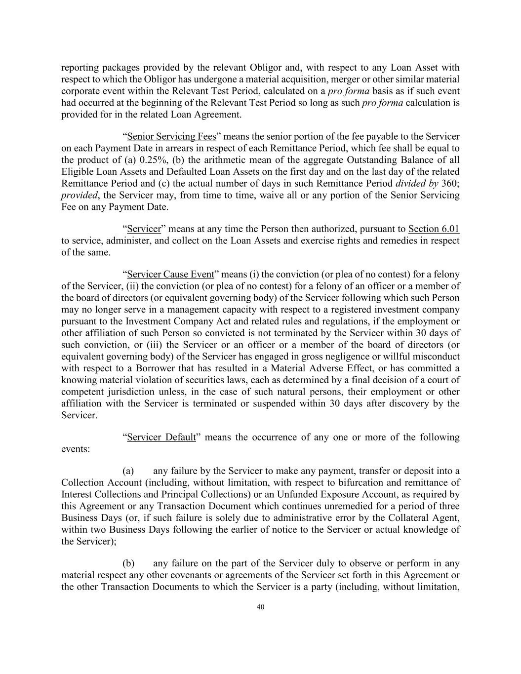 40 reporting packages provided by the relevant Obligor and, with respect to any Loan Asset with respect to which the Obligor has undergone a material acquisition, merger or other similar material corporate event within the Relevant Test Period, calculated on a pro forma basis as if such event had occurred at the beginning of the Relevant Test Period so long as such pro forma calculation is provided for in the related Loan Agreement. “Senior Servicing Fees” means the senior portion of the fee payable to the Servicer on each Payment Date in arrears in respect of each Remittance Period, which fee shall be equal to the product of (a) 0.25%, (b) the arithmetic mean of the aggregate Outstanding Balance of all Eligible Loan Assets and Defaulted Loan Assets on the first day and on the last day of the related Remittance Period and (c) the actual number of days in such Remittance Period divided by 360; provided, the Servicer may, from time to time, waive all or any portion of the Senior Servicing Fee on any Payment Date. “Servicer” means at any time the Person then authorized, pursuant to Section 6.01 to service, administer, and collect on the Loan Assets and exercise rights and remedies in respect of the same. “Servicer Cause Event” means (i) the conviction (or plea of no contest) for a felony of the Servicer, (ii) the conviction (or plea of no contest) for a felony of an officer or a member of the board of directors (or equivalent governing body) of the Servicer following which such Person may no longer serve in a management capacity with respect to a registered investment company pursuant to the Investment Company Act and related rules and regulations, if the employment or other affiliation of such Person so convicted is not terminated by the Servicer within 30 days of such conviction, or (iii) the Servicer or an officer or a member of the board of directors (or equivalent governing body) of the Servicer has engaged in gross negligence or willful misconduct with respect to a Borrower that has resulted in a Material Adverse Effect, or has committed a knowing material violation of securities laws, each as determined by a final decision of a court of competent jurisdiction unless, in the case of such natural persons, their employment or other affiliation with the Servicer is terminated or suspended within 30 days after discovery by the Servicer. “Servicer Default” means the occurrence of any one or more of the following events: (a) any failure by the Servicer to make any payment, transfer or deposit into a Collection Account (including, without limitation, with respect to bifurcation and remittance of Interest Collections and Principal Collections) or an Unfunded Exposure Account, as required by this Agreement or any Transaction Document which continues unremedied for a period of three Business Days (or, if such failure is solely due to administrative error by the Collateral Agent, within two Business Days following the earlier of notice to the Servicer or actual knowledge of the Servicer); (b) any failure on the part of the Servicer duly to observe or perform in any material respect any other covenants or agreements of the Servicer set forth in this Agreement or the other Transaction Documents to which the Servicer is a party (including, without limitation,