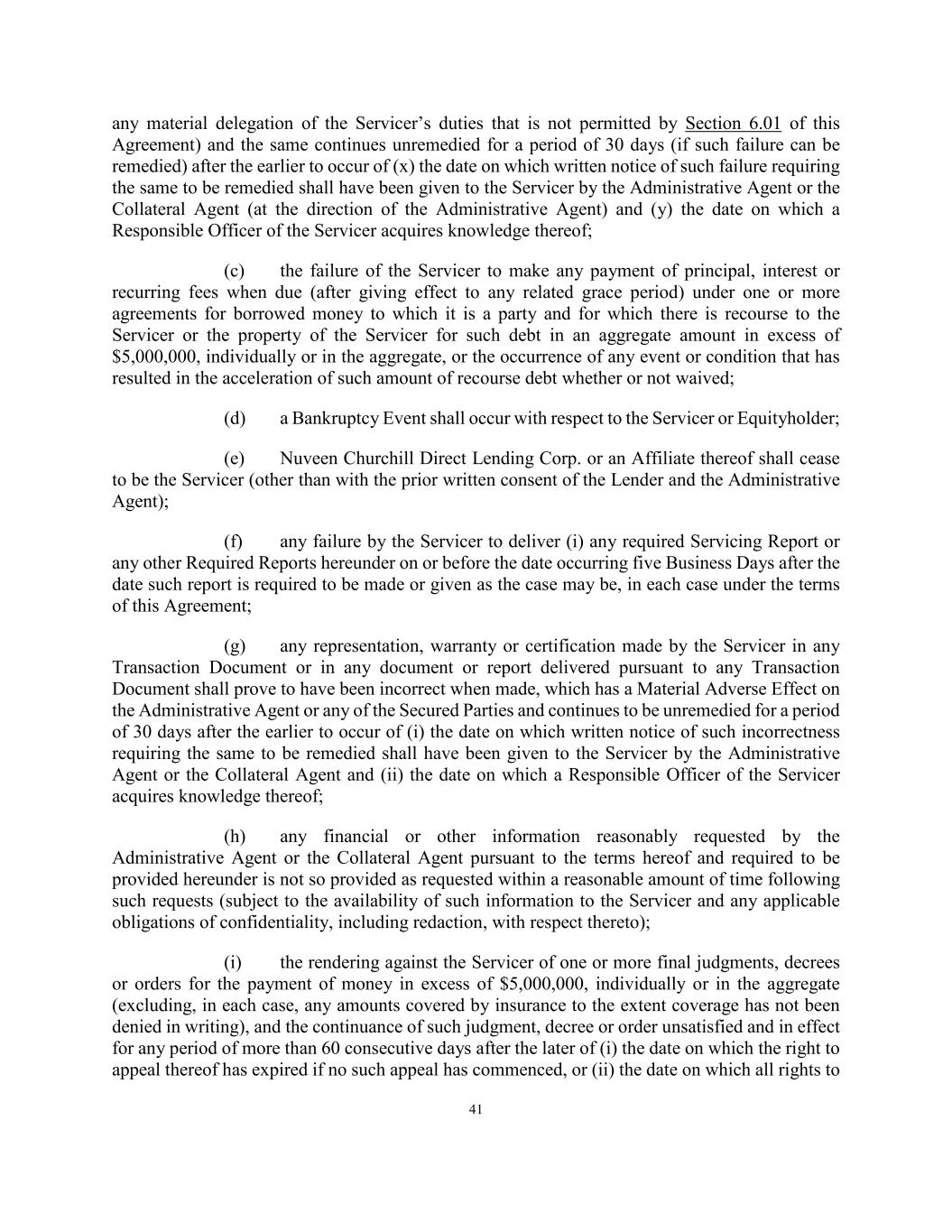 41 any material delegation of the Servicer’s duties that is not permitted by Section 6.01 of this Agreement) and the same continues unremedied for a period of 30 days (if such failure can be remedied) after the earlier to occur of (x) the date on which written notice of such failure requiring the same to be remedied shall have been given to the Servicer by the Administrative Agent or the Collateral Agent (at the direction of the Administrative Agent) and (y) the date on which a Responsible Officer of the Servicer acquires knowledge thereof; (c) the failure of the Servicer to make any payment of principal, interest or recurring fees when due (after giving effect to any related grace period) under one or more agreements for borrowed money to which it is a party and for which there is recourse to the Servicer or the property of the Servicer for such debt in an aggregate amount in excess of $5,000,000, individually or in the aggregate, or the occurrence of any event or condition that has resulted in the acceleration of such amount of recourse debt whether or not waived; (d) a Bankruptcy Event shall occur with respect to the Servicer or Equityholder; (e) Nuveen Churchill Direct Lending Corp. or an Affiliate thereof shall cease to be the Servicer (other than with the prior written consent of the Lender and the Administrative Agent); (f) any failure by the Servicer to deliver (i) any required Servicing Report or any other Required Reports hereunder on or before the date occurring five Business Days after the date such report is required to be made or given as the case may be, in each case under the terms of this Agreement; (g) any representation, warranty or certification made by the Servicer in any Transaction Document or in any document or report delivered pursuant to any Transaction Document shall prove to have been incorrect when made, which has a Material Adverse Effect on the Administrative Agent or any of the Secured Parties and continues to be unremedied for a period of 30 days after the earlier to occur of (i) the date on which written notice of such incorrectness requiring the same to be remedied shall have been given to the Servicer by the Administrative Agent or the Collateral Agent and (ii) the date on which a Responsible Officer of the Servicer acquires knowledge thereof; (h) any financial or other information reasonably requested by the Administrative Agent or the Collateral Agent pursuant to the terms hereof and required to be provided hereunder is not so provided as requested within a reasonable amount of time following such requests (subject to the availability of such information to the Servicer and any applicable obligations of confidentiality, including redaction, with respect thereto); (i) the rendering against the Servicer of one or more final judgments, decrees or orders for the payment of money in excess of $5,000,000, individually or in the aggregate (excluding, in each case, any amounts covered by insurance to the extent coverage has not been denied in writing), and the continuance of such judgment, decree or order unsatisfied and in effect for any period of more than 60 consecutive days after the later of (i) the date on which the right to appeal thereof has expired if no such appeal has commenced, or (ii) the date on which all rights to