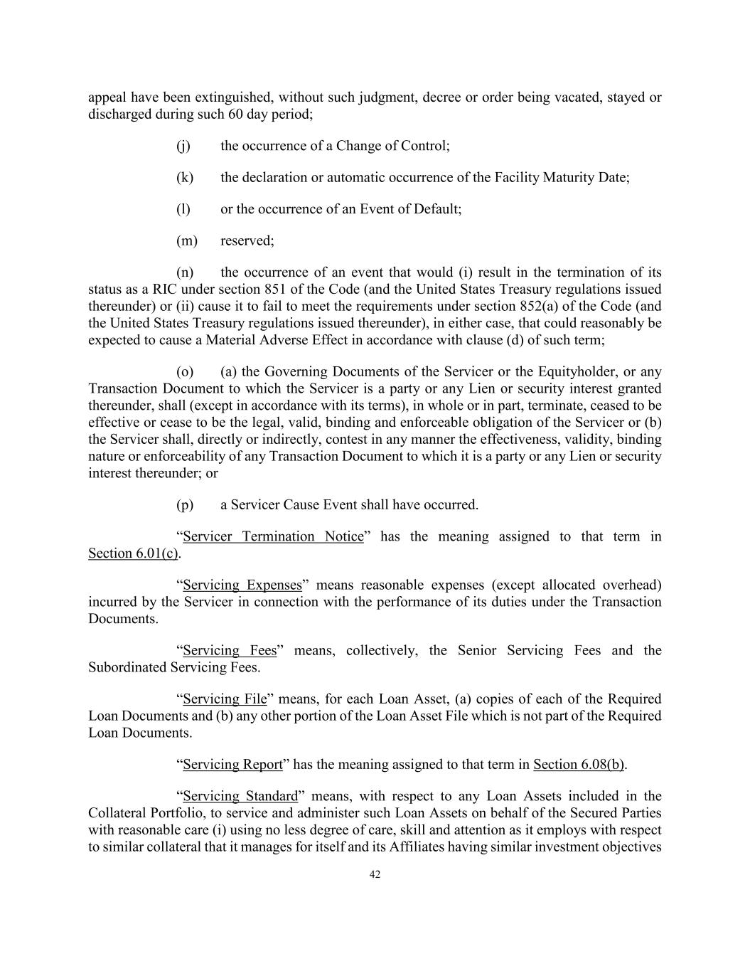 42 appeal have been extinguished, without such judgment, decree or order being vacated, stayed or discharged during such 60 day period; (j) the occurrence of a Change of Control; (k) the declaration or automatic occurrence of the Facility Maturity Date; (l) or the occurrence of an Event of Default; (m) reserved; (n) the occurrence of an event that would (i) result in the termination of its status as a RIC under section 851 of the Code (and the United States Treasury regulations issued thereunder) or (ii) cause it to fail to meet the requirements under section 852(a) of the Code (and the United States Treasury regulations issued thereunder), in either case, that could reasonably be expected to cause a Material Adverse Effect in accordance with clause (d) of such term; (o) (a) the Governing Documents of the Servicer or the Equityholder, or any Transaction Document to which the Servicer is a party or any Lien or security interest granted thereunder, shall (except in accordance with its terms), in whole or in part, terminate, ceased to be effective or cease to be the legal, valid, binding and enforceable obligation of the Servicer or (b) the Servicer shall, directly or indirectly, contest in any manner the effectiveness, validity, binding nature or enforceability of any Transaction Document to which it is a party or any Lien or security interest thereunder; or (p) a Servicer Cause Event shall have occurred. “Servicer Termination Notice” has the meaning assigned to that term in Section 6.01(c). “Servicing Expenses” means reasonable expenses (except allocated overhead) incurred by the Servicer in connection with the performance of its duties under the Transaction Documents. “Servicing Fees” means, collectively, the Senior Servicing Fees and the Subordinated Servicing Fees. “Servicing File” means, for each Loan Asset, (a) copies of each of the Required Loan Documents and (b) any other portion of the Loan Asset File which is not part of the Required Loan Documents. “Servicing Report” has the meaning assigned to that term in Section 6.08(b). “Servicing Standard” means, with respect to any Loan Assets included in the Collateral Portfolio, to service and administer such Loan Assets on behalf of the Secured Parties with reasonable care (i) using no less degree of care, skill and attention as it employs with respect to similar collateral that it manages for itself and its Affiliates having similar investment objectives