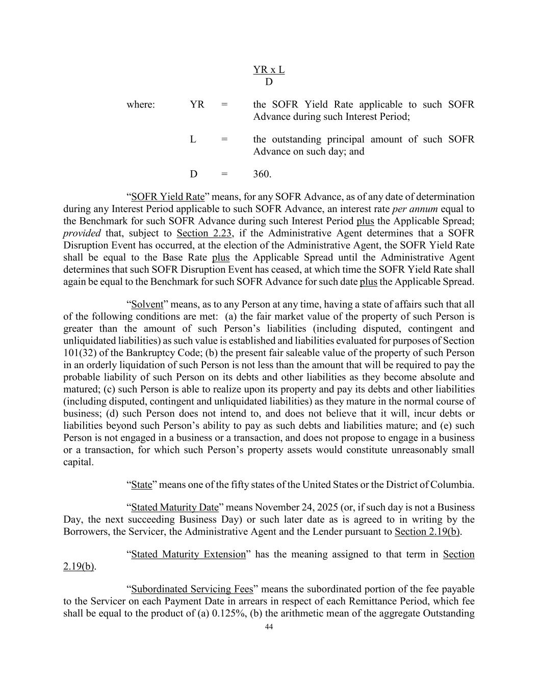 44 YR x L D where: YR = the SOFR Yield Rate applicable to such SOFR Advance during such Interest Period; L = the outstanding principal amount of such SOFR Advance on such day; and D = 360. “SOFR Yield Rate” means, for any SOFR Advance, as of any date of determination during any Interest Period applicable to such SOFR Advance, an interest rate per annum equal to the Benchmark for such SOFR Advance during such Interest Period plus the Applicable Spread; provided that, subject to Section 2.23, if the Administrative Agent determines that a SOFR Disruption Event has occurred, at the election of the Administrative Agent, the SOFR Yield Rate shall be equal to the Base Rate plus the Applicable Spread until the Administrative Agent determines that such SOFR Disruption Event has ceased, at which time the SOFR Yield Rate shall again be equal to the Benchmark for such SOFR Advance for such date plus the Applicable Spread. “Solvent” means, as to any Person at any time, having a state of affairs such that all of the following conditions are met: (a) the fair market value of the property of such Person is greater than the amount of such Person’s liabilities (including disputed, contingent and unliquidated liabilities) as such value is established and liabilities evaluated for purposes of Section 101(32) of the Bankruptcy Code; (b) the present fair saleable value of the property of such Person in an orderly liquidation of such Person is not less than the amount that will be required to pay the probable liability of such Person on its debts and other liabilities as they become absolute and matured; (c) such Person is able to realize upon its property and pay its debts and other liabilities (including disputed, contingent and unliquidated liabilities) as they mature in the normal course of business; (d) such Person does not intend to, and does not believe that it will, incur debts or liabilities beyond such Person’s ability to pay as such debts and liabilities mature; and (e) such Person is not engaged in a business or a transaction, and does not propose to engage in a business or a transaction, for which such Person’s property assets would constitute unreasonably small capital. “State” means one of the fifty states of the United States or the District of Columbia. “Stated Maturity Date” means November 24, 2025 (or, if such day is not a Business Day, the next succeeding Business Day) or such later date as is agreed to in writing by the Borrowers, the Servicer, the Administrative Agent and the Lender pursuant to Section 2.19(b). “Stated Maturity Extension” has the meaning assigned to that term in Section 2.19(b). “Subordinated Servicing Fees” means the subordinated portion of the fee payable to the Servicer on each Payment Date in arrears in respect of each Remittance Period, which fee shall be equal to the product of (a) 0.125%, (b) the arithmetic mean of the aggregate Outstanding