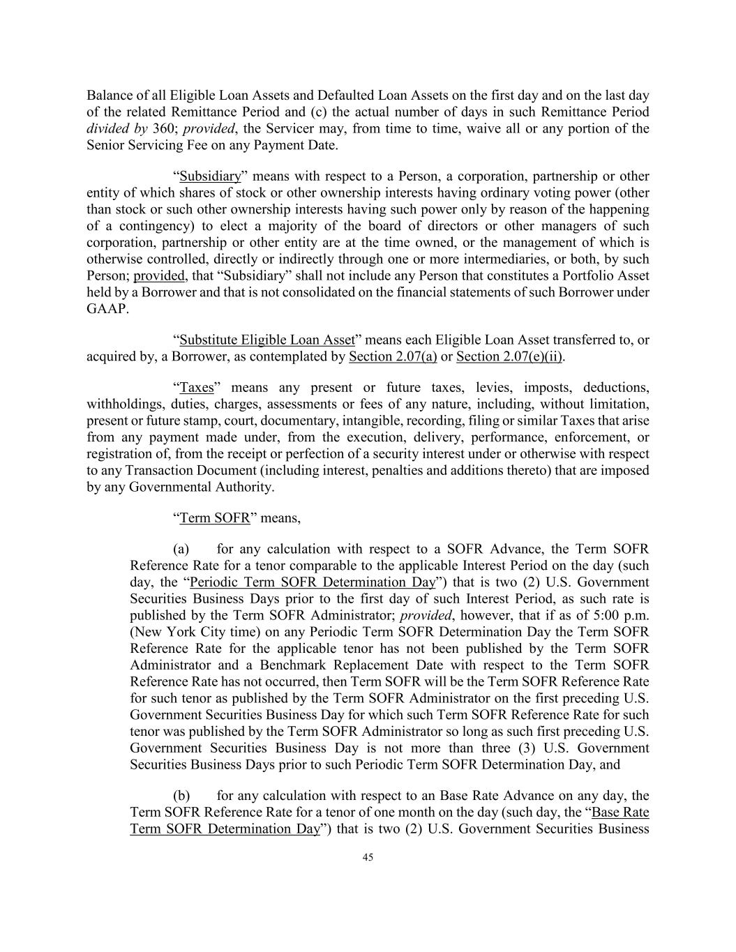 45 Balance of all Eligible Loan Assets and Defaulted Loan Assets on the first day and on the last day of the related Remittance Period and (c) the actual number of days in such Remittance Period divided by 360; provided, the Servicer may, from time to time, waive all or any portion of the Senior Servicing Fee on any Payment Date. “Subsidiary” means with respect to a Person, a corporation, partnership or other entity of which shares of stock or other ownership interests having ordinary voting power (other than stock or such other ownership interests having such power only by reason of the happening of a contingency) to elect a majority of the board of directors or other managers of such corporation, partnership or other entity are at the time owned, or the management of which is otherwise controlled, directly or indirectly through one or more intermediaries, or both, by such Person; provided, that “Subsidiary” shall not include any Person that constitutes a Portfolio Asset held by a Borrower and that is not consolidated on the financial statements of such Borrower under GAAP. “Substitute Eligible Loan Asset” means each Eligible Loan Asset transferred to, or acquired by, a Borrower, as contemplated by Section 2.07(a) or Section 2.07(e)(ii). “Taxes” means any present or future taxes, levies, imposts, deductions, withholdings, duties, charges, assessments or fees of any nature, including, without limitation, present or future stamp, court, documentary, intangible, recording, filing or similar Taxes that arise from any payment made under, from the execution, delivery, performance, enforcement, or registration of, from the receipt or perfection of a security interest under or otherwise with respect to any Transaction Document (including interest, penalties and additions thereto) that are imposed by any Governmental Authority. “Term SOFR” means, (a) for any calculation with respect to a SOFR Advance, the Term SOFR Reference Rate for a tenor comparable to the applicable Interest Period on the day (such day, the “Periodic Term SOFR Determination Day”) that is two (2) U.S. Government Securities Business Days prior to the first day of such Interest Period, as such rate is published by the Term SOFR Administrator; provided, however, that if as of 5:00 p.m. (New York City time) on any Periodic Term SOFR Determination Day the Term SOFR Reference Rate for the applicable tenor has not been published by the Term SOFR Administrator and a Benchmark Replacement Date with respect to the Term SOFR Reference Rate has not occurred, then Term SOFR will be the Term SOFR Reference Rate for such tenor as published by the Term SOFR Administrator on the first preceding U.S. Government Securities Business Day for which such Term SOFR Reference Rate for such tenor was published by the Term SOFR Administrator so long as such first preceding U.S. Government Securities Business Day is not more than three (3) U.S. Government Securities Business Days prior to such Periodic Term SOFR Determination Day, and (b) for any calculation with respect to an Base Rate Advance on any day, the Term SOFR Reference Rate for a tenor of one month on the day (such day, the “Base Rate Term SOFR Determination Day”) that is two (2) U.S. Government Securities Business