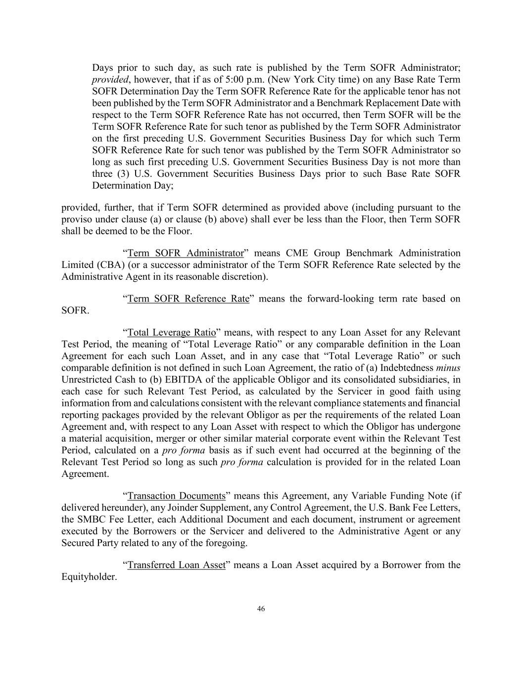 46 Days prior to such day, as such rate is published by the Term SOFR Administrator; provided, however, that if as of 5:00 p.m. (New York City time) on any Base Rate Term SOFR Determination Day the Term SOFR Reference Rate for the applicable tenor has not been published by the Term SOFR Administrator and a Benchmark Replacement Date with respect to the Term SOFR Reference Rate has not occurred, then Term SOFR will be the Term SOFR Reference Rate for such tenor as published by the Term SOFR Administrator on the first preceding U.S. Government Securities Business Day for which such Term SOFR Reference Rate for such tenor was published by the Term SOFR Administrator so long as such first preceding U.S. Government Securities Business Day is not more than three (3) U.S. Government Securities Business Days prior to such Base Rate SOFR Determination Day; provided, further, that if Term SOFR determined as provided above (including pursuant to the proviso under clause (a) or clause (b) above) shall ever be less than the Floor, then Term SOFR shall be deemed to be the Floor. “Term SOFR Administrator” means CME Group Benchmark Administration Limited (CBA) (or a successor administrator of the Term SOFR Reference Rate selected by the Administrative Agent in its reasonable discretion). “Term SOFR Reference Rate” means the forward-looking term rate based on SOFR. “Total Leverage Ratio” means, with respect to any Loan Asset for any Relevant Test Period, the meaning of “Total Leverage Ratio” or any comparable definition in the Loan Agreement for each such Loan Asset, and in any case that “Total Leverage Ratio” or such comparable definition is not defined in such Loan Agreement, the ratio of (a) Indebtedness minus Unrestricted Cash to (b) EBITDA of the applicable Obligor and its consolidated subsidiaries, in each case for such Relevant Test Period, as calculated by the Servicer in good faith using information from and calculations consistent with the relevant compliance statements and financial reporting packages provided by the relevant Obligor as per the requirements of the related Loan Agreement and, with respect to any Loan Asset with respect to which the Obligor has undergone a material acquisition, merger or other similar material corporate event within the Relevant Test Period, calculated on a pro forma basis as if such event had occurred at the beginning of the Relevant Test Period so long as such pro forma calculation is provided for in the related Loan Agreement. “Transaction Documents” means this Agreement, any Variable Funding Note (if delivered hereunder), any Joinder Supplement, any Control Agreement, the U.S. Bank Fee Letters, the SMBC Fee Letter, each Additional Document and each document, instrument or agreement executed by the Borrowers or the Servicer and delivered to the Administrative Agent or any Secured Party related to any of the foregoing. “Transferred Loan Asset” means a Loan Asset acquired by a Borrower from the Equityholder.