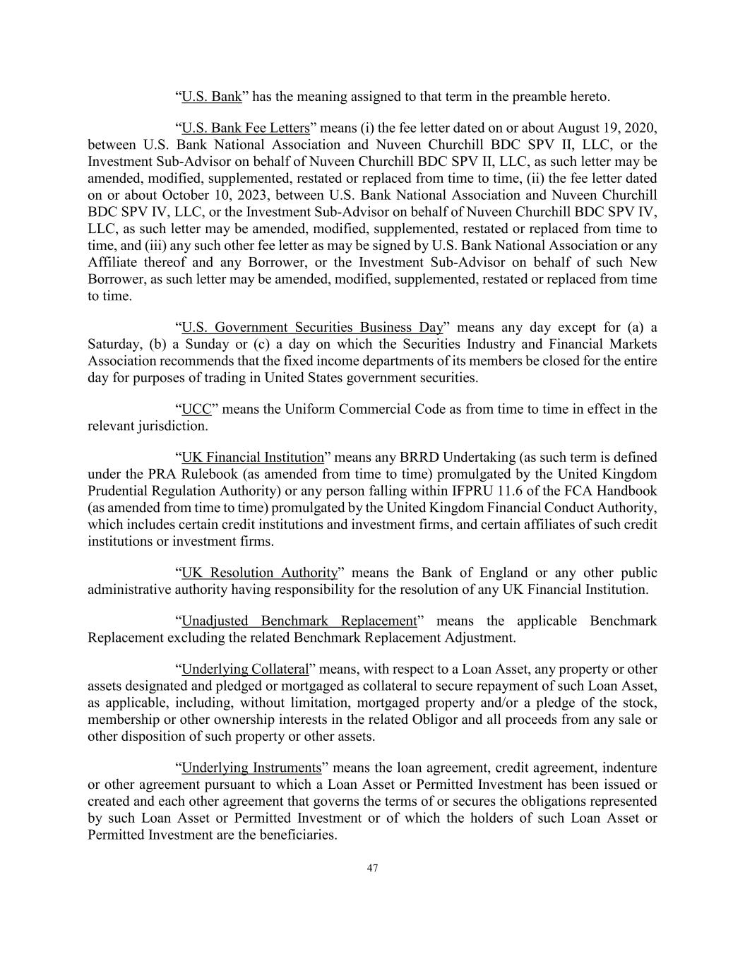 47 “U.S. Bank” has the meaning assigned to that term in the preamble hereto. “U.S. Bank Fee Letters” means (i) the fee letter dated on or about August 19, 2020, between U.S. Bank National Association and Nuveen Churchill BDC SPV II, LLC, or the Investment Sub-Advisor on behalf of Nuveen Churchill BDC SPV II, LLC, as such letter may be amended, modified, supplemented, restated or replaced from time to time, (ii) the fee letter dated on or about October 10, 2023, between U.S. Bank National Association and Nuveen Churchill BDC SPV IV, LLC, or the Investment Sub-Advisor on behalf of Nuveen Churchill BDC SPV IV, LLC, as such letter may be amended, modified, supplemented, restated or replaced from time to time, and (iii) any such other fee letter as may be signed by U.S. Bank National Association or any Affiliate thereof and any Borrower, or the Investment Sub-Advisor on behalf of such New Borrower, as such letter may be amended, modified, supplemented, restated or replaced from time to time. “U.S. Government Securities Business Day” means any day except for (a) a Saturday, (b) a Sunday or (c) a day on which the Securities Industry and Financial Markets Association recommends that the fixed income departments of its members be closed for the entire day for purposes of trading in United States government securities. “UCC” means the Uniform Commercial Code as from time to time in effect in the relevant jurisdiction. “UK Financial Institution” means any BRRD Undertaking (as such term is defined under the PRA Rulebook (as amended from time to time) promulgated by the United Kingdom Prudential Regulation Authority) or any person falling within IFPRU 11.6 of the FCA Handbook (as amended from time to time) promulgated by the United Kingdom Financial Conduct Authority, which includes certain credit institutions and investment firms, and certain affiliates of such credit institutions or investment firms. “UK Resolution Authority” means the Bank of England or any other public administrative authority having responsibility for the resolution of any UK Financial Institution. “Unadjusted Benchmark Replacement” means the applicable Benchmark Replacement excluding the related Benchmark Replacement Adjustment. “Underlying Collateral” means, with respect to a Loan Asset, any property or other assets designated and pledged or mortgaged as collateral to secure repayment of such Loan Asset, as applicable, including, without limitation, mortgaged property and/or a pledge of the stock, membership or other ownership interests in the related Obligor and all proceeds from any sale or other disposition of such property or other assets. “Underlying Instruments” means the loan agreement, credit agreement, indenture or other agreement pursuant to which a Loan Asset or Permitted Investment has been issued or created and each other agreement that governs the terms of or secures the obligations represented by such Loan Asset or Permitted Investment or of which the holders of such Loan Asset or Permitted Investment are the beneficiaries.