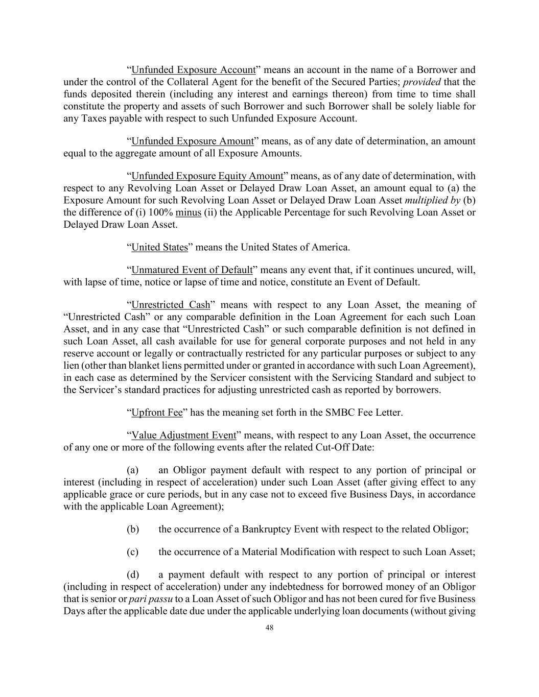 48 “Unfunded Exposure Account” means an account in the name of a Borrower and under the control of the Collateral Agent for the benefit of the Secured Parties; provided that the funds deposited therein (including any interest and earnings thereon) from time to time shall constitute the property and assets of such Borrower and such Borrower shall be solely liable for any Taxes payable with respect to such Unfunded Exposure Account. “Unfunded Exposure Amount” means, as of any date of determination, an amount equal to the aggregate amount of all Exposure Amounts. “Unfunded Exposure Equity Amount” means, as of any date of determination, with respect to any Revolving Loan Asset or Delayed Draw Loan Asset, an amount equal to (a) the Exposure Amount for such Revolving Loan Asset or Delayed Draw Loan Asset multiplied by (b) the difference of (i) 100% minus (ii) the Applicable Percentage for such Revolving Loan Asset or Delayed Draw Loan Asset. “United States” means the United States of America. “Unmatured Event of Default” means any event that, if it continues uncured, will, with lapse of time, notice or lapse of time and notice, constitute an Event of Default. “Unrestricted Cash” means with respect to any Loan Asset, the meaning of “Unrestricted Cash” or any comparable definition in the Loan Agreement for each such Loan Asset, and in any case that “Unrestricted Cash” or such comparable definition is not defined in such Loan Asset, all cash available for use for general corporate purposes and not held in any reserve account or legally or contractually restricted for any particular purposes or subject to any lien (other than blanket liens permitted under or granted in accordance with such Loan Agreement), in each case as determined by the Servicer consistent with the Servicing Standard and subject to the Servicer’s standard practices for adjusting unrestricted cash as reported by borrowers. “Upfront Fee” has the meaning set forth in the SMBC Fee Letter. “Value Adjustment Event” means, with respect to any Loan Asset, the occurrence of any one or more of the following events after the related Cut-Off Date: (a) an Obligor payment default with respect to any portion of principal or interest (including in respect of acceleration) under such Loan Asset (after giving effect to any applicable grace or cure periods, but in any case not to exceed five Business Days, in accordance with the applicable Loan Agreement); (b) the occurrence of a Bankruptcy Event with respect to the related Obligor; (c) the occurrence of a Material Modification with respect to such Loan Asset; (d) a payment default with respect to any portion of principal or interest (including in respect of acceleration) under any indebtedness for borrowed money of an Obligor that is senior or pari passu to a Loan Asset of such Obligor and has not been cured for five Business Days after the applicable date due under the applicable underlying loan documents (without giving