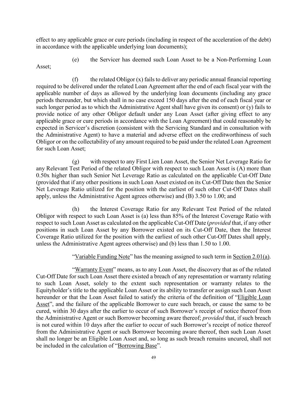 49 effect to any applicable grace or cure periods (including in respect of the acceleration of the debt) in accordance with the applicable underlying loan documents); (e) the Servicer has deemed such Loan Asset to be a Non-Performing Loan Asset; (f) the related Obligor (x) fails to deliver any periodic annual financial reporting required to be delivered under the related Loan Agreement after the end of each fiscal year with the applicable number of days as allowed by the underlying loan documents (including any grace periods thereunder, but which shall in no case exceed 150 days after the end of each fiscal year or such longer period as to which the Administrative Agent shall have given its consent) or (y) fails to provide notice of any other Obligor default under any Loan Asset (after giving effect to any applicable grace or cure periods in accordance with the Loan Agreement) that could reasonably be expected in Servicer’s discretion (consistent with the Servicing Standard and in consultation with the Administrative Agent) to have a material and adverse effect on the creditworthiness of such Obligor or on the collectability of any amount required to be paid under the related Loan Agreement for such Loan Asset; (g) with respect to any First Lien Loan Asset, the Senior Net Leverage Ratio for any Relevant Test Period of the related Obligor with respect to such Loan Asset is (A) more than 0.50x higher than such Senior Net Leverage Ratio as calculated on the applicable Cut-Off Date (provided that if any other positions in such Loan Asset existed on its Cut-Off Date then the Senior Net Leverage Ratio utilized for the position with the earliest of such other Cut-Off Dates shall apply, unless the Administrative Agent agrees otherwise) and (B) 3.50 to 1.00; and (h) the Interest Coverage Ratio for any Relevant Test Period of the related Obligor with respect to such Loan Asset is (a) less than 85% of the Interest Coverage Ratio with respect to such Loan Asset as calculated on the applicable Cut-Off Date (provided that, if any other positions in such Loan Asset by any Borrower existed on its Cut-Off Date, then the Interest Coverage Ratio utilized for the position with the earliest of such other Cut-Off Dates shall apply, unless the Administrative Agent agrees otherwise) and (b) less than 1.50 to 1.00. “Variable Funding Note” has the meaning assigned to such term in Section 2.01(a). “Warranty Event” means, as to any Loan Asset, the discovery that as of the related Cut-Off Date for such Loan Asset there existed a breach of any representation or warranty relating to such Loan Asset, solely to the extent such representation or warranty relates to the Equityholder’s title to the applicable Loan Asset or its ability to transfer or assign such Loan Asset hereunder or that the Loan Asset failed to satisfy the criteria of the definition of “Eligible Loan Asset”, and the failure of the applicable Borrower to cure such breach, or cause the same to be cured, within 30 days after the earlier to occur of such Borrower’s receipt of notice thereof from the Administrative Agent or such Borrower becoming aware thereof; provided that, if such breach is not cured within 10 days after the earlier to occur of such Borrower’s receipt of notice thereof from the Administrative Agent or such Borrower becoming aware thereof, then such Loan Asset shall no longer be an Eligible Loan Asset and, so long as such breach remains uncured, shall not be included in the calculation of “Borrowing Base”.