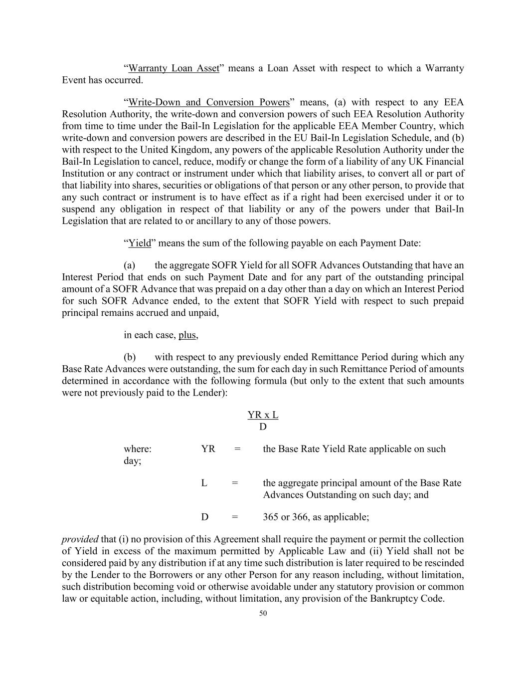 50 “Warranty Loan Asset” means a Loan Asset with respect to which a Warranty Event has occurred. “Write-Down and Conversion Powers” means, (a) with respect to any EEA Resolution Authority, the write-down and conversion powers of such EEA Resolution Authority from time to time under the Bail-In Legislation for the applicable EEA Member Country, which write-down and conversion powers are described in the EU Bail-In Legislation Schedule, and (b) with respect to the United Kingdom, any powers of the applicable Resolution Authority under the Bail-In Legislation to cancel, reduce, modify or change the form of a liability of any UK Financial Institution or any contract or instrument under which that liability arises, to convert all or part of that liability into shares, securities or obligations of that person or any other person, to provide that any such contract or instrument is to have effect as if a right had been exercised under it or to suspend any obligation in respect of that liability or any of the powers under that Bail-In Legislation that are related to or ancillary to any of those powers. “Yield” means the sum of the following payable on each Payment Date: (a) the aggregate SOFR Yield for all SOFR Advances Outstanding that have an Interest Period that ends on such Payment Date and for any part of the outstanding principal amount of a SOFR Advance that was prepaid on a day other than a day on which an Interest Period for such SOFR Advance ended, to the extent that SOFR Yield with respect to such prepaid principal remains accrued and unpaid, in each case, plus, (b) with respect to any previously ended Remittance Period during which any Base Rate Advances were outstanding, the sum for each day in such Remittance Period of amounts determined in accordance with the following formula (but only to the extent that such amounts were not previously paid to the Lender): YR x L D where: YR = the Base Rate Yield Rate applicable on such day; L = the aggregate principal amount of the Base Rate Advances Outstanding on such day; and D = 365 or 366, as applicable; provided that (i) no provision of this Agreement shall require the payment or permit the collection of Yield in excess of the maximum permitted by Applicable Law and (ii) Yield shall not be considered paid by any distribution if at any time such distribution is later required to be rescinded by the Lender to the Borrowers or any other Person for any reason including, without limitation, such distribution becoming void or otherwise avoidable under any statutory provision or common law or equitable action, including, without limitation, any provision of the Bankruptcy Code.