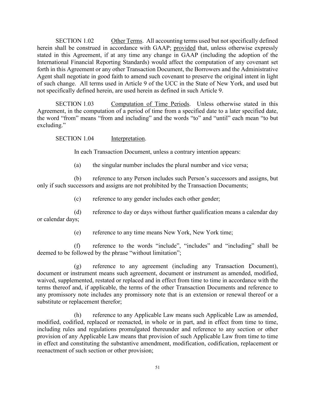 51 SECTION 1.02 Other Terms. All accounting terms used but not specifically defined herein shall be construed in accordance with GAAP; provided that, unless otherwise expressly stated in this Agreement, if at any time any change in GAAP (including the adoption of the International Financial Reporting Standards) would affect the computation of any covenant set forth in this Agreement or any other Transaction Document, the Borrowers and the Administrative Agent shall negotiate in good faith to amend such covenant to preserve the original intent in light of such change. All terms used in Article 9 of the UCC in the State of New York, and used but not specifically defined herein, are used herein as defined in such Article 9. SECTION 1.03 Computation of Time Periods. Unless otherwise stated in this Agreement, in the computation of a period of time from a specified date to a later specified date, the word “from” means “from and including” and the words “to” and “until” each mean “to but excluding.” SECTION 1.04 Interpretation. In each Transaction Document, unless a contrary intention appears: (a) the singular number includes the plural number and vice versa; (b) reference to any Person includes such Person’s successors and assigns, but only if such successors and assigns are not prohibited by the Transaction Documents; (c) reference to any gender includes each other gender; (d) reference to day or days without further qualification means a calendar day or calendar days; (e) reference to any time means New York, New York time; (f) reference to the words “include”, “includes” and “including” shall be deemed to be followed by the phrase “without limitation”; (g) reference to any agreement (including any Transaction Document), document or instrument means such agreement, document or instrument as amended, modified, waived, supplemented, restated or replaced and in effect from time to time in accordance with the terms thereof and, if applicable, the terms of the other Transaction Documents and reference to any promissory note includes any promissory note that is an extension or renewal thereof or a substitute or replacement therefor; (h) reference to any Applicable Law means such Applicable Law as amended, modified, codified, replaced or reenacted, in whole or in part, and in effect from time to time, including rules and regulations promulgated thereunder and reference to any section or other provision of any Applicable Law means that provision of such Applicable Law from time to time in effect and constituting the substantive amendment, modification, codification, replacement or reenactment of such section or other provision;