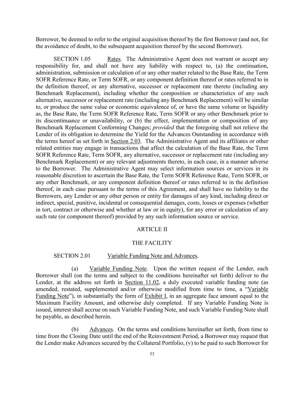 53 Borrower, be deemed to refer to the original acquisition thereof by the first Borrower (and not, for the avoidance of doubt, to the subsequent acquisition thereof by the second Borrower). SECTION 1.05 Rates. The Administrative Agent does not warrant or accept any responsibility for, and shall not have any liability with respect to, (a) the continuation, administration, submission or calculation of or any other matter related to the Base Rate, the Term SOFR Reference Rate, or Term SOFR, or any component definition thereof or rates referred to in the definition thereof, or any alternative, successor or replacement rate thereto (including any Benchmark Replacement), including whether the composition or characteristics of any such alternative, successor or replacement rate (including any Benchmark Replacement) will be similar to, or produce the same value or economic equivalence of, or have the same volume or liquidity as, the Base Rate, the Term SOFR Reference Rate, Term SOFR or any other Benchmark prior to its discontinuance or unavailability, or (b) the effect, implementation or composition of any Benchmark Replacement Conforming Changes; provided that the foregoing shall not relieve the Lender of its obligation to determine the Yield for the Advances Outstanding in accordance with the terms hereof as set forth in Section 2.03. The Administrative Agent and its affiliates or other related entities may engage in transactions that affect the calculation of the Base Rate, the Term SOFR Reference Rate, Term SOFR, any alternative, successor or replacement rate (including any Benchmark Replacement) or any relevant adjustments thereto, in each case, in a manner adverse to the Borrower. The Administrative Agent may select information sources or services in its reasonable discretion to ascertain the Base Rate, the Term SOFR Reference Rate, Term SOFR, or any other Benchmark, or any component definition thereof or rates referred to in the definition thereof, in each case pursuant to the terms of this Agreement, and shall have no liability to the Borrowers, any Lender or any other person or entity for damages of any kind, including direct or indirect, special, punitive, incidental or consequential damages, costs, losses or expenses (whether in tort, contract or otherwise and whether at law or in equity), for any error or calculation of any such rate (or component thereof) provided by any such information source or service. ARTICLE II THE FACILITY SECTION 2.01 Variable Funding Note and Advances. (a) Variable Funding Note. Upon the written request of the Lender, each Borrower shall (on the terms and subject to the conditions hereinafter set forth) deliver to the Lender, at the address set forth in Section 11.02, a duly executed variable funding note (as amended, restated, supplemented and/or otherwise modified from time to time, a “Variable Funding Note”), in substantially the form of Exhibit I, in an aggregate face amount equal to the Maximum Facility Amount, and otherwise duly completed. If any Variable Funding Note is issued, interest shall accrue on such Variable Funding Note, and such Variable Funding Note shall be payable, as described herein. (b) Advances. On the terms and conditions hereinafter set forth, from time to time from the Closing Date until the end of the Reinvestment Period, a Borrower may request that the Lender make Advances secured by the Collateral Portfolio, (v) to be paid to such Borrower for