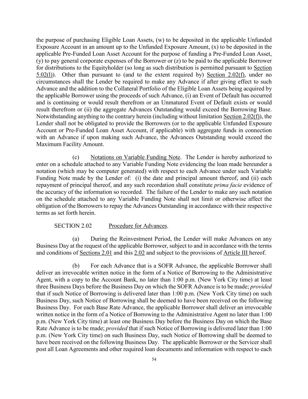 54 the purpose of purchasing Eligible Loan Assets, (w) to be deposited in the applicable Unfunded Exposure Account in an amount up to the Unfunded Exposure Amount, (x) to be deposited in the applicable Pre-Funded Loan Asset Account for the purpose of funding a Pre-Funded Loan Asset, (y) to pay general corporate expenses of the Borrower or (z) to be paid to the applicable Borrower for distributions to the Equityholder (so long as such distribution is permitted pursuant to Section 5.02(l)). Other than pursuant to (and to the extent required by) Section 2.02(f), under no circumstances shall the Lender be required to make any Advance if after giving effect to such Advance and the addition to the Collateral Portfolio of the Eligible Loan Assets being acquired by the applicable Borrower using the proceeds of such Advance, (i) an Event of Default has occurred and is continuing or would result therefrom or an Unmatured Event of Default exists or would result therefrom or (ii) the aggregate Advances Outstanding would exceed the Borrowing Base. Notwithstanding anything to the contrary herein (including without limitation Section 2.02(f)), the Lender shall not be obligated to provide the Borrowers (or to the applicable Unfunded Exposure Account or Pre-Funded Loan Asset Account, if applicable) with aggregate funds in connection with an Advance if upon making such Advance, the Advances Outstanding would exceed the Maximum Facility Amount. (c) Notations on Variable Funding Note. The Lender is hereby authorized to enter on a schedule attached to any Variable Funding Note evidencing the loan made hereunder a notation (which may be computer generated) with respect to each Advance under such Variable Funding Note made by the Lender of: (i) the date and principal amount thereof, and (ii) each repayment of principal thereof, and any such recordation shall constitute prima facie evidence of the accuracy of the information so recorded. The failure of the Lender to make any such notation on the schedule attached to any Variable Funding Note shall not limit or otherwise affect the obligation of the Borrowers to repay the Advances Outstanding in accordance with their respective terms as set forth herein. SECTION 2.02 Procedure for Advances. (a) During the Reinvestment Period, the Lender will make Advances on any Business Day at the request of the applicable Borrower, subject to and in accordance with the terms and conditions of Sections 2.01 and this 2.02 and subject to the provisions of Article III hereof. (b) For each Advance that is a SOFR Advance, the applicable Borrower shall deliver an irrevocable written notice in the form of a Notice of Borrowing to the Administrative Agent, with a copy to the Account Bank, no later than 1:00 p.m. (New York City time) at least three Business Days before the Business Day on which the SOFR Advance is to be made; provided that if such Notice of Borrowing is delivered later than 1:00 p.m. (New York City time) on such Business Day, such Notice of Borrowing shall be deemed to have been received on the following Business Day. For each Base Rate Advance, the applicable Borrower shall deliver an irrevocable written notice in the form of a Notice of Borrowing to the Administrative Agent no later than 1:00 p.m. (New York City time) at least one Business Day before the Business Day on which the Base Rate Advance is to be made; provided that if such Notice of Borrowing is delivered later than 1:00 p.m. (New York City time) on such Business Day, such Notice of Borrowing shall be deemed to have been received on the following Business Day. The applicable Borrower or the Servicer shall post all Loan Agreements and other required loan documents and information with respect to each