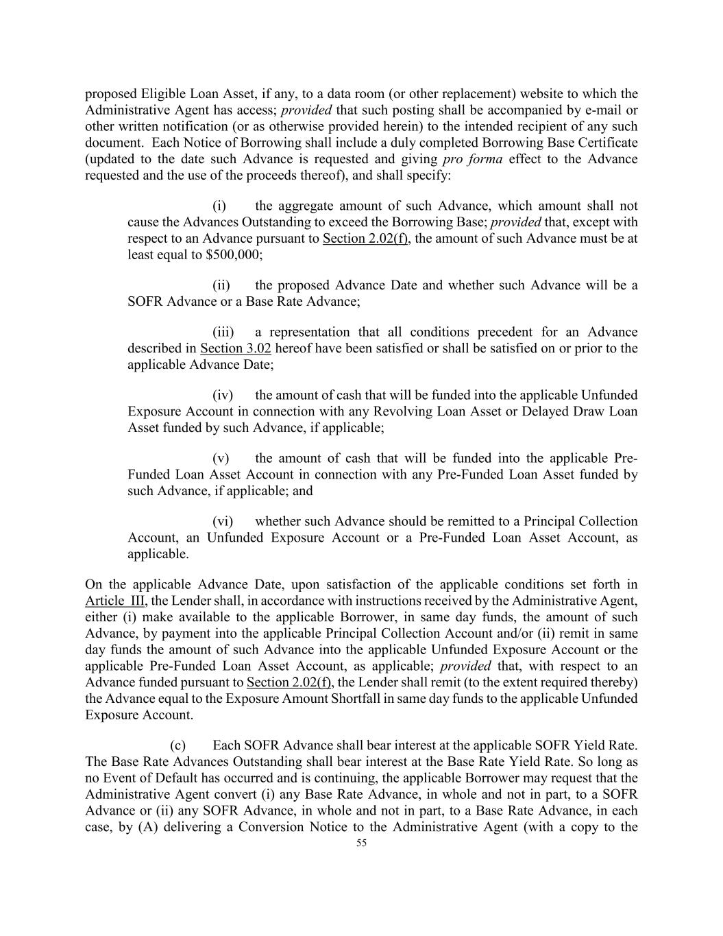 55 proposed Eligible Loan Asset, if any, to a data room (or other replacement) website to which the Administrative Agent has access; provided that such posting shall be accompanied by e-mail or other written notification (or as otherwise provided herein) to the intended recipient of any such document. Each Notice of Borrowing shall include a duly completed Borrowing Base Certificate (updated to the date such Advance is requested and giving pro forma effect to the Advance requested and the use of the proceeds thereof), and shall specify: (i) the aggregate amount of such Advance, which amount shall not cause the Advances Outstanding to exceed the Borrowing Base; provided that, except with respect to an Advance pursuant to Section 2.02(f), the amount of such Advance must be at least equal to $500,000; (ii) the proposed Advance Date and whether such Advance will be a SOFR Advance or a Base Rate Advance; (iii) a representation that all conditions precedent for an Advance described in Section 3.02 hereof have been satisfied or shall be satisfied on or prior to the applicable Advance Date; (iv) the amount of cash that will be funded into the applicable Unfunded Exposure Account in connection with any Revolving Loan Asset or Delayed Draw Loan Asset funded by such Advance, if applicable; (v) the amount of cash that will be funded into the applicable Pre- Funded Loan Asset Account in connection with any Pre-Funded Loan Asset funded by such Advance, if applicable; and (vi) whether such Advance should be remitted to a Principal Collection Account, an Unfunded Exposure Account or a Pre-Funded Loan Asset Account, as applicable. On the applicable Advance Date, upon satisfaction of the applicable conditions set forth in Article III, the Lender shall, in accordance with instructions received by the Administrative Agent, either (i) make available to the applicable Borrower, in same day funds, the amount of such Advance, by payment into the applicable Principal Collection Account and/or (ii) remit in same day funds the amount of such Advance into the applicable Unfunded Exposure Account or the applicable Pre-Funded Loan Asset Account, as applicable; provided that, with respect to an Advance funded pursuant to Section 2.02(f), the Lender shall remit (to the extent required thereby) the Advance equal to the Exposure Amount Shortfall in same day funds to the applicable Unfunded Exposure Account. (c) Each SOFR Advance shall bear interest at the applicable SOFR Yield Rate. The Base Rate Advances Outstanding shall bear interest at the Base Rate Yield Rate. So long as no Event of Default has occurred and is continuing, the applicable Borrower may request that the Administrative Agent convert (i) any Base Rate Advance, in whole and not in part, to a SOFR Advance or (ii) any SOFR Advance, in whole and not in part, to a Base Rate Advance, in each case, by (A) delivering a Conversion Notice to the Administrative Agent (with a copy to the
