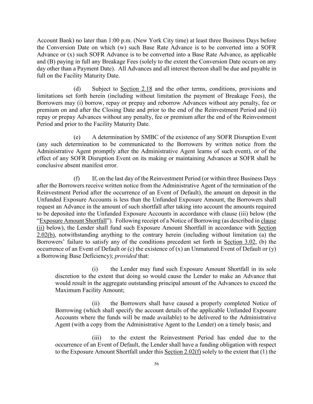 56 Account Bank) no later than 1:00 p.m. (New York City time) at least three Business Days before the Conversion Date on which (w) such Base Rate Advance is to be converted into a SOFR Advance or (x) such SOFR Advance is to be converted into a Base Rate Advance, as applicable and (B) paying in full any Breakage Fees (solely to the extent the Conversion Date occurs on any day other than a Payment Date). All Advances and all interest thereon shall be due and payable in full on the Facility Maturity Date. (d) Subject to Section 2.18 and the other terms, conditions, provisions and limitations set forth herein (including without limitation the payment of Breakage Fees), the Borrowers may (i) borrow, repay or prepay and reborrow Advances without any penalty, fee or premium on and after the Closing Date and prior to the end of the Reinvestment Period and (ii) repay or prepay Advances without any penalty, fee or premium after the end of the Reinvestment Period and prior to the Facility Maturity Date. (e) A determination by SMBC of the existence of any SOFR Disruption Event (any such determination to be communicated to the Borrowers by written notice from the Administrative Agent promptly after the Administrative Agent learns of such event), or of the effect of any SOFR Disruption Event on its making or maintaining Advances at SOFR shall be conclusive absent manifest error. (f) If, on the last day of the Reinvestment Period (or within three Business Days after the Borrowers receive written notice from the Administrative Agent of the termination of the Reinvestment Period after the occurrence of an Event of Default), the amount on deposit in the Unfunded Exposure Accounts is less than the Unfunded Exposure Amount, the Borrowers shall request an Advance in the amount of such shortfall after taking into account the amounts required to be deposited into the Unfunded Exposure Accounts in accordance with clause (iii) below (the “Exposure Amount Shortfall”). Following receipt of a Notice of Borrowing (as described in clause (ii) below), the Lender shall fund such Exposure Amount Shortfall in accordance with Section 2.02(b), notwithstanding anything to the contrary herein (including without limitation (a) the Borrowers’ failure to satisfy any of the conditions precedent set forth in Section 3.02, (b) the occurrence of an Event of Default or (c) the existence of (x) an Unmatured Event of Default or (y) a Borrowing Base Deficiency); provided that: (i) the Lender may fund such Exposure Amount Shortfall in its sole discretion to the extent that doing so would cause the Lender to make an Advance that would result in the aggregate outstanding principal amount of the Advances to exceed the Maximum Facility Amount; (ii) the Borrowers shall have caused a properly completed Notice of Borrowing (which shall specify the account details of the applicable Unfunded Exposure Accounts where the funds will be made available) to be delivered to the Administrative Agent (with a copy from the Administrative Agent to the Lender) on a timely basis; and (iii) to the extent the Reinvestment Period has ended due to the occurrence of an Event of Default, the Lender shall have a funding obligation with respect to the Exposure Amount Shortfall under this Section 2.02(f) solely to the extent that (1) the