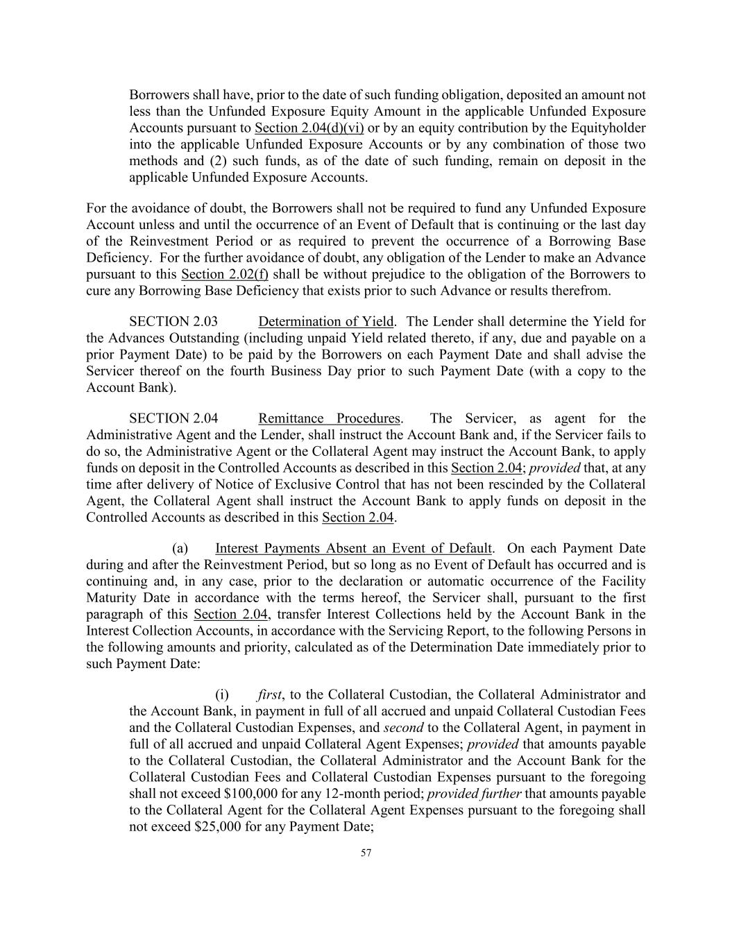 57 Borrowers shall have, prior to the date of such funding obligation, deposited an amount not less than the Unfunded Exposure Equity Amount in the applicable Unfunded Exposure Accounts pursuant to Section 2.04(d)(vi) or by an equity contribution by the Equityholder into the applicable Unfunded Exposure Accounts or by any combination of those two methods and (2) such funds, as of the date of such funding, remain on deposit in the applicable Unfunded Exposure Accounts. For the avoidance of doubt, the Borrowers shall not be required to fund any Unfunded Exposure Account unless and until the occurrence of an Event of Default that is continuing or the last day of the Reinvestment Period or as required to prevent the occurrence of a Borrowing Base Deficiency. For the further avoidance of doubt, any obligation of the Lender to make an Advance pursuant to this Section 2.02(f) shall be without prejudice to the obligation of the Borrowers to cure any Borrowing Base Deficiency that exists prior to such Advance or results therefrom. SECTION 2.03 Determination of Yield. The Lender shall determine the Yield for the Advances Outstanding (including unpaid Yield related thereto, if any, due and payable on a prior Payment Date) to be paid by the Borrowers on each Payment Date and shall advise the Servicer thereof on the fourth Business Day prior to such Payment Date (with a copy to the Account Bank). SECTION 2.04 Remittance Procedures. The Servicer, as agent for the Administrative Agent and the Lender, shall instruct the Account Bank and, if the Servicer fails to do so, the Administrative Agent or the Collateral Agent may instruct the Account Bank, to apply funds on deposit in the Controlled Accounts as described in this Section 2.04; provided that, at any time after delivery of Notice of Exclusive Control that has not been rescinded by the Collateral Agent, the Collateral Agent shall instruct the Account Bank to apply funds on deposit in the Controlled Accounts as described in this Section 2.04. (a) Interest Payments Absent an Event of Default. On each Payment Date during and after the Reinvestment Period, but so long as no Event of Default has occurred and is continuing and, in any case, prior to the declaration or automatic occurrence of the Facility Maturity Date in accordance with the terms hereof, the Servicer shall, pursuant to the first paragraph of this Section 2.04, transfer Interest Collections held by the Account Bank in the Interest Collection Accounts, in accordance with the Servicing Report, to the following Persons in the following amounts and priority, calculated as of the Determination Date immediately prior to such Payment Date: (i) first, to the Collateral Custodian, the Collateral Administrator and the Account Bank, in payment in full of all accrued and unpaid Collateral Custodian Fees and the Collateral Custodian Expenses, and second to the Collateral Agent, in payment in full of all accrued and unpaid Collateral Agent Expenses; provided that amounts payable to the Collateral Custodian, the Collateral Administrator and the Account Bank for the Collateral Custodian Fees and Collateral Custodian Expenses pursuant to the foregoing shall not exceed $100,000 for any 12-month period; provided further that amounts payable to the Collateral Agent for the Collateral Agent Expenses pursuant to the foregoing shall not exceed $25,000 for any Payment Date;