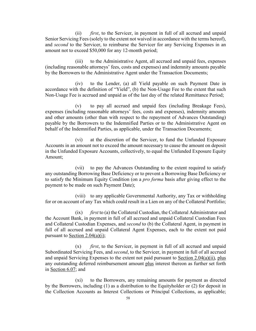 58 (ii) first, to the Servicer, in payment in full of all accrued and unpaid Senior Servicing Fees (solely to the extent not waived in accordance with the terms hereof), and second to the Servicer, to reimburse the Servicer for any Servicing Expenses in an amount not to exceed $50,000 for any 12-month period; (iii) to the Administrative Agent, all accrued and unpaid fees, expenses (including reasonable attorneys’ fees, costs and expenses) and indemnity amounts payable by the Borrowers to the Administrative Agent under the Transaction Documents; (iv) to the Lender, (a) all Yield payable on such Payment Date in accordance with the definition of “Yield”, (b) the Non-Usage Fee to the extent that such Non-Usage Fee is accrued and unpaid as of the last day of the related Remittance Period; (v) to pay all accrued and unpaid fees (including Breakage Fees), expenses (including reasonable attorneys’ fees, costs and expenses), indemnity amounts and other amounts (other than with respect to the repayment of Advances Outstanding) payable by the Borrowers to the Indemnified Parties or to the Administrative Agent on behalf of the Indemnified Parties, as applicable, under the Transaction Documents; (vi) at the discretion of the Servicer, to fund the Unfunded Exposure Accounts in an amount not to exceed the amount necessary to cause the amount on deposit in the Unfunded Exposure Accounts, collectively, to equal the Unfunded Exposure Equity Amount; (vii) to pay the Advances Outstanding to the extent required to satisfy any outstanding Borrowing Base Deficiency or to prevent a Borrowing Base Deficiency or to satisfy the Minimum Equity Condition (on a pro forma basis after giving effect to the payment to be made on such Payment Date); (viii) to any applicable Governmental Authority, any Tax or withholding for or on account of any Tax which could result in a Lien on any of the Collateral Portfolio; (ix) first to (a) the Collateral Custodian, the Collateral Administrator and the Account Bank, in payment in full of all accrued and unpaid Collateral Custodian Fees and Collateral Custodian Expenses, and second to (b) the Collateral Agent, in payment in full of all accrued and unpaid Collateral Agent Expenses, each to the extent not paid pursuant to Section 2.04(a)(i); (x) first, to the Servicer, in payment in full of all accrued and unpaid Subordinated Servicing Fees, and second, to the Servicer, in payment in full of all accrued and unpaid Servicing Expenses to the extent not paid pursuant to Section 2.04(a)(ii), plus any outstanding deferred reimbursement amount plus interest thereon as further set forth in Section 6.07; and (xi) to the Borrowers, any remaining amounts for payment as directed by the Borrowers, including (1) as a distribution to the Equityholder or (2) for deposit in the Collection Accounts as Interest Collections or Principal Collections, as applicable;