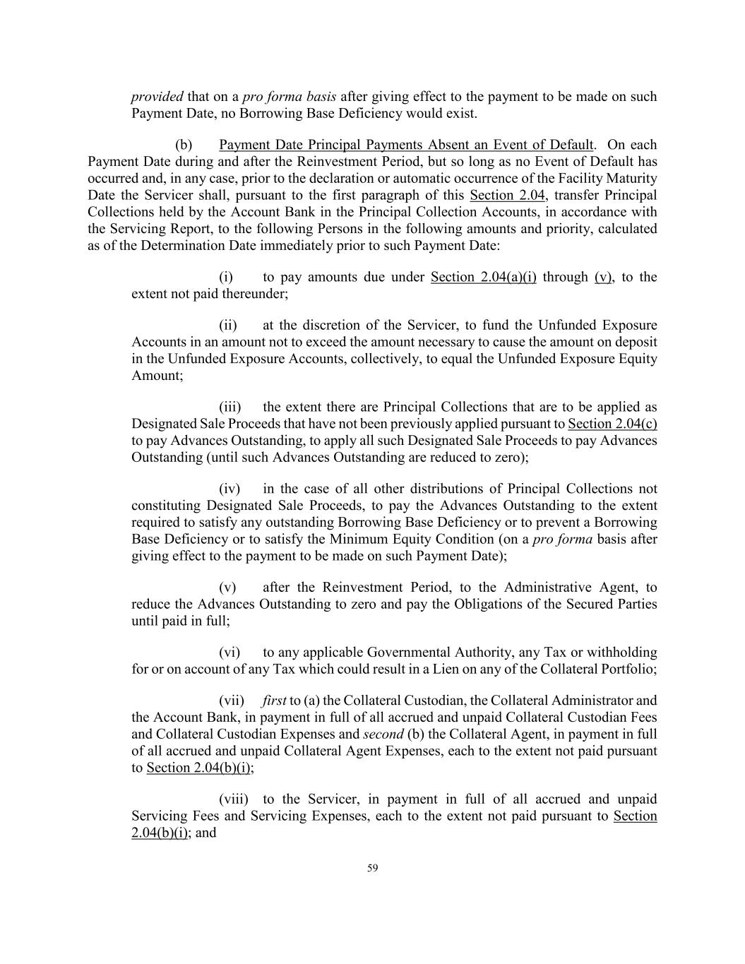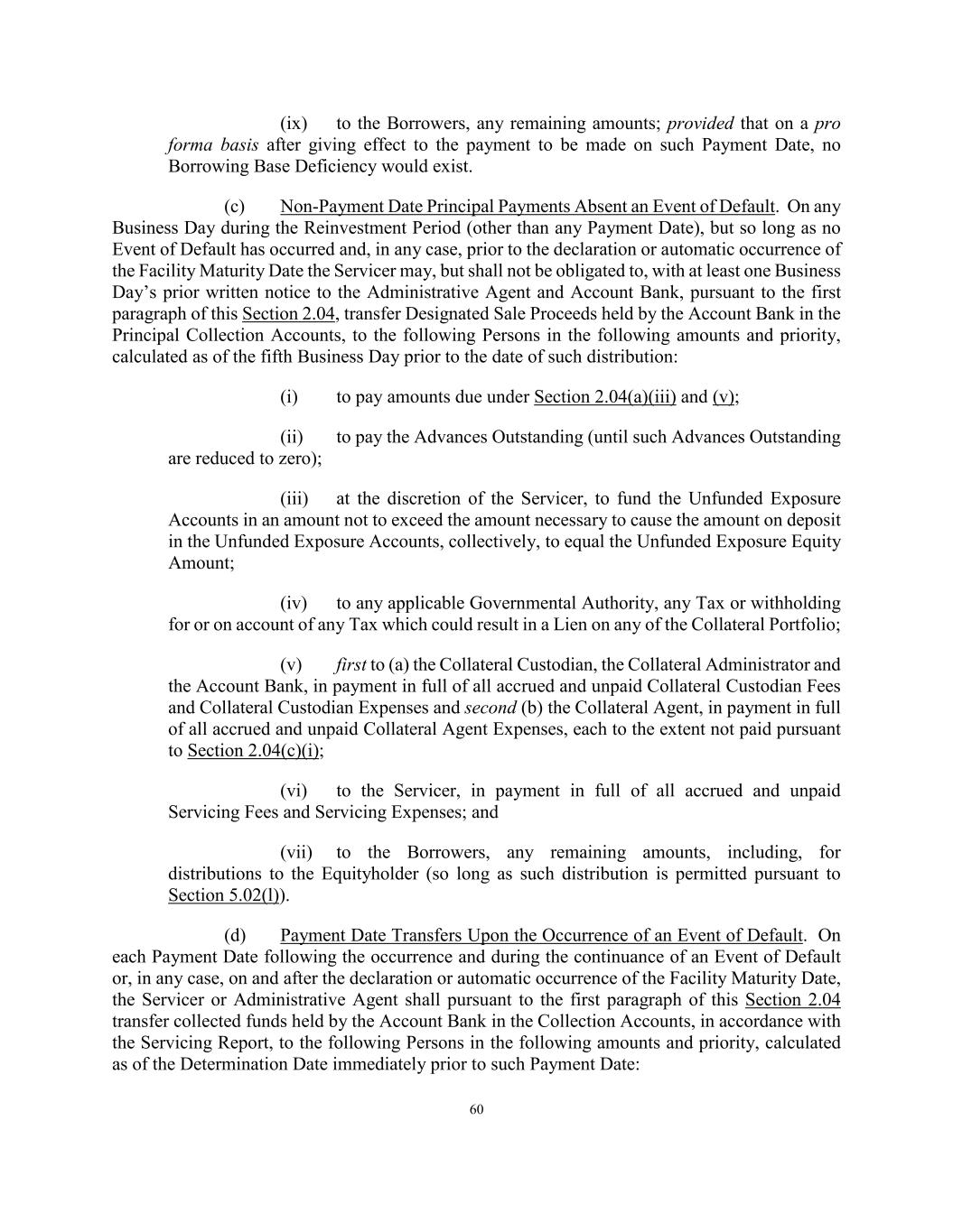 59 provided that on a pro forma basis after giving effect to the payment to be made on such Payment Date, no Borrowing Base Deficiency would exist. (b) Payment Date Principal Payments Absent an Event of Default. On each Payment Date during and after the Reinvestment Period, but so long as no Event of Default has occurred and, in any case, prior to the declaration or automatic occurrence of the Facility Maturity Date the Servicer shall, pursuant to the first paragraph of this Section 2.04, transfer Principal Collections held by the Account Bank in the Principal Collection Accounts, in accordance with the Servicing Report, to the following Persons in the following amounts and priority, calculated as of the Determination Date immediately prior to such Payment Date: (i) to pay amounts due under Section 2.04(a)(i) through (v), to the extent not paid thereunder; (ii) at the discretion of the Servicer, to fund the Unfunded Exposure Accounts in an amount not to exceed the amount necessary to cause the amount on deposit in the Unfunded Exposure Accounts, collectively, to equal the Unfunded Exposure Equity Amount; (iii) the extent there are Principal Collections that are to be applied as Designated Sale Proceeds that have not been previously applied pursuant to Section 2.04(c) to pay Advances Outstanding, to apply all such Designated Sale Proceeds to pay Advances Outstanding (until such Advances Outstanding are reduced to zero); (iv) in the case of all other distributions of Principal Collections not constituting Designated Sale Proceeds, to pay the Advances Outstanding to the extent required to satisfy any outstanding Borrowing Base Deficiency or to prevent a Borrowing Base Deficiency or to satisfy the Minimum Equity Condition (on a pro forma basis after giving effect to the payment to be made on such Payment Date); (v) after the Reinvestment Period, to the Administrative Agent, to reduce the Advances Outstanding to zero and pay the Obligations of the Secured Parties until paid in full; (vi) to any applicable Governmental Authority, any Tax or withholding for or on account of any Tax which could result in a Lien on any of the Collateral Portfolio; (vii) first to (a) the Collateral Custodian, the Collateral Administrator and the Account Bank, in payment in full of all accrued and unpaid Collateral Custodian Fees and Collateral Custodian Expenses and second (b) the Collateral Agent, in payment in full of all accrued and unpaid Collateral Agent Expenses, each to the extent not paid pursuant to Section 2.04(b)(i); (viii) to the Servicer, in payment in full of all accrued and unpaid Servicing Fees and Servicing Expenses, each to the extent not paid pursuant to Section 2.04(b)(i); and