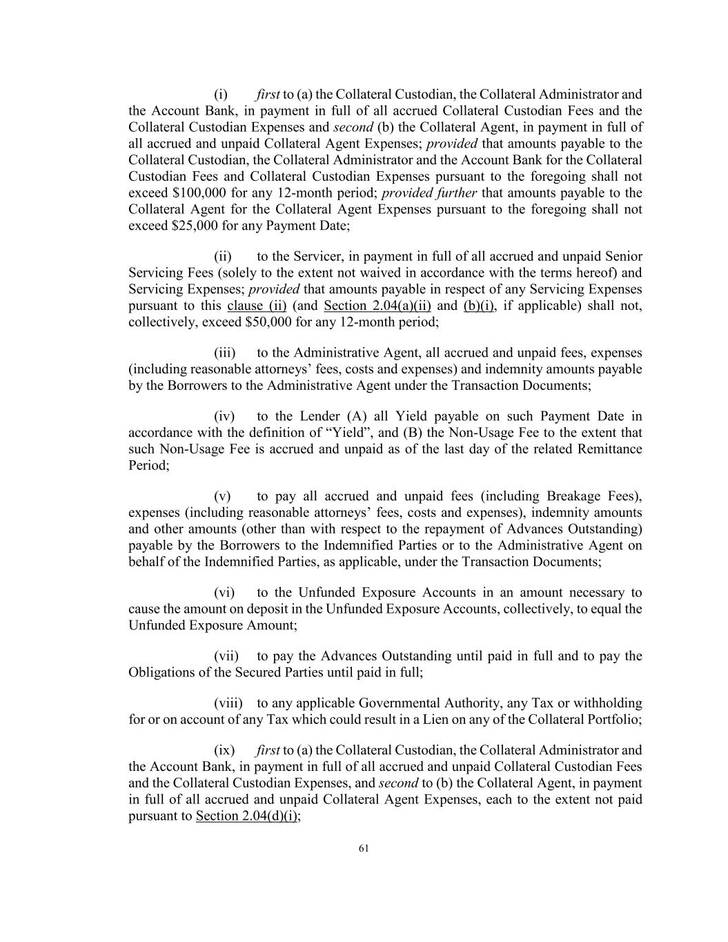 61 (i) first to (a) the Collateral Custodian, the Collateral Administrator and the Account Bank, in payment in full of all accrued Collateral Custodian Fees and the Collateral Custodian Expenses and second (b) the Collateral Agent, in payment in full of all accrued and unpaid Collateral Agent Expenses; provided that amounts payable to the Collateral Custodian, the Collateral Administrator and the Account Bank for the Collateral Custodian Fees and Collateral Custodian Expenses pursuant to the foregoing shall not exceed $100,000 for any 12-month period; provided further that amounts payable to the Collateral Agent for the Collateral Agent Expenses pursuant to the foregoing shall not exceed $25,000 for any Payment Date; (ii) to the Servicer, in payment in full of all accrued and unpaid Senior Servicing Fees (solely to the extent not waived in accordance with the terms hereof) and Servicing Expenses; provided that amounts payable in respect of any Servicing Expenses pursuant to this clause (ii) (and Section 2.04(a)(ii) and (b)(i), if applicable) shall not, collectively, exceed $50,000 for any 12-month period; (iii) to the Administrative Agent, all accrued and unpaid fees, expenses (including reasonable attorneys’ fees, costs and expenses) and indemnity amounts payable by the Borrowers to the Administrative Agent under the Transaction Documents; (iv) to the Lender (A) all Yield payable on such Payment Date in accordance with the definition of “Yield”, and (B) the Non-Usage Fee to the extent that such Non-Usage Fee is accrued and unpaid as of the last day of the related Remittance Period; (v) to pay all accrued and unpaid fees (including Breakage Fees), expenses (including reasonable attorneys’ fees, costs and expenses), indemnity amounts and other amounts (other than with respect to the repayment of Advances Outstanding) payable by the Borrowers to the Indemnified Parties or to the Administrative Agent on behalf of the Indemnified Parties, as applicable, under the Transaction Documents; (vi) to the Unfunded Exposure Accounts in an amount necessary to cause the amount on deposit in the Unfunded Exposure Accounts, collectively, to equal the Unfunded Exposure Amount; (vii) to pay the Advances Outstanding until paid in full and to pay the Obligations of the Secured Parties until paid in full; (viii) to any applicable Governmental Authority, any Tax or withholding for or on account of any Tax which could result in a Lien on any of the Collateral Portfolio; (ix) first to (a) the Collateral Custodian, the Collateral Administrator and the Account Bank, in payment in full of all accrued and unpaid Collateral Custodian Fees and the Collateral Custodian Expenses, and second to (b) the Collateral Agent, in payment in full of all accrued and unpaid Collateral Agent Expenses, each to the extent not paid pursuant to Section 2.04(d)(i);