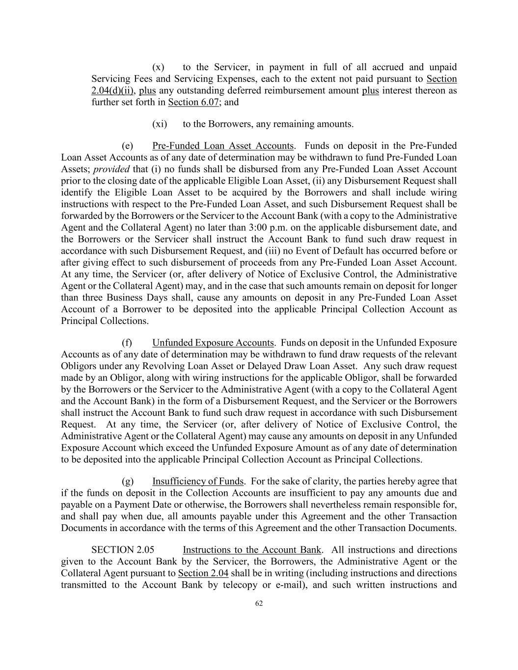 62 (x) to the Servicer, in payment in full of all accrued and unpaid Servicing Fees and Servicing Expenses, each to the extent not paid pursuant to Section 2.04(d)(ii), plus any outstanding deferred reimbursement amount plus interest thereon as further set forth in Section 6.07; and (xi) to the Borrowers, any remaining amounts. (e) Pre-Funded Loan Asset Accounts. Funds on deposit in the Pre-Funded Loan Asset Accounts as of any date of determination may be withdrawn to fund Pre-Funded Loan Assets; provided that (i) no funds shall be disbursed from any Pre-Funded Loan Asset Account prior to the closing date of the applicable Eligible Loan Asset, (ii) any Disbursement Request shall identify the Eligible Loan Asset to be acquired by the Borrowers and shall include wiring instructions with respect to the Pre-Funded Loan Asset, and such Disbursement Request shall be forwarded by the Borrowers or the Servicer to the Account Bank (with a copy to the Administrative Agent and the Collateral Agent) no later than 3:00 p.m. on the applicable disbursement date, and the Borrowers or the Servicer shall instruct the Account Bank to fund such draw request in accordance with such Disbursement Request, and (iii) no Event of Default has occurred before or after giving effect to such disbursement of proceeds from any Pre-Funded Loan Asset Account. At any time, the Servicer (or, after delivery of Notice of Exclusive Control, the Administrative Agent or the Collateral Agent) may, and in the case that such amounts remain on deposit for longer than three Business Days shall, cause any amounts on deposit in any Pre-Funded Loan Asset Account of a Borrower to be deposited into the applicable Principal Collection Account as Principal Collections. (f) Unfunded Exposure Accounts. Funds on deposit in the Unfunded Exposure Accounts as of any date of determination may be withdrawn to fund draw requests of the relevant Obligors under any Revolving Loan Asset or Delayed Draw Loan Asset. Any such draw request made by an Obligor, along with wiring instructions for the applicable Obligor, shall be forwarded by the Borrowers or the Servicer to the Administrative Agent (with a copy to the Collateral Agent and the Account Bank) in the form of a Disbursement Request, and the Servicer or the Borrowers shall instruct the Account Bank to fund such draw request in accordance with such Disbursement Request. At any time, the Servicer (or, after delivery of Notice of Exclusive Control, the Administrative Agent or the Collateral Agent) may cause any amounts on deposit in any Unfunded Exposure Account which exceed the Unfunded Exposure Amount as of any date of determination to be deposited into the applicable Principal Collection Account as Principal Collections. (g) Insufficiency of Funds. For the sake of clarity, the parties hereby agree that if the funds on deposit in the Collection Accounts are insufficient to pay any amounts due and payable on a Payment Date or otherwise, the Borrowers shall nevertheless remain responsible for, and shall pay when due, all amounts payable under this Agreement and the other Transaction Documents in accordance with the terms of this Agreement and the other Transaction Documents. SECTION 2.05 Instructions to the Account Bank. All instructions and directions given to the Account Bank by the Servicer, the Borrowers, the Administrative Agent or the Collateral Agent pursuant to Section 2.04 shall be in writing (including instructions and directions transmitted to the Account Bank by telecopy or e-mail), and such written instructions and