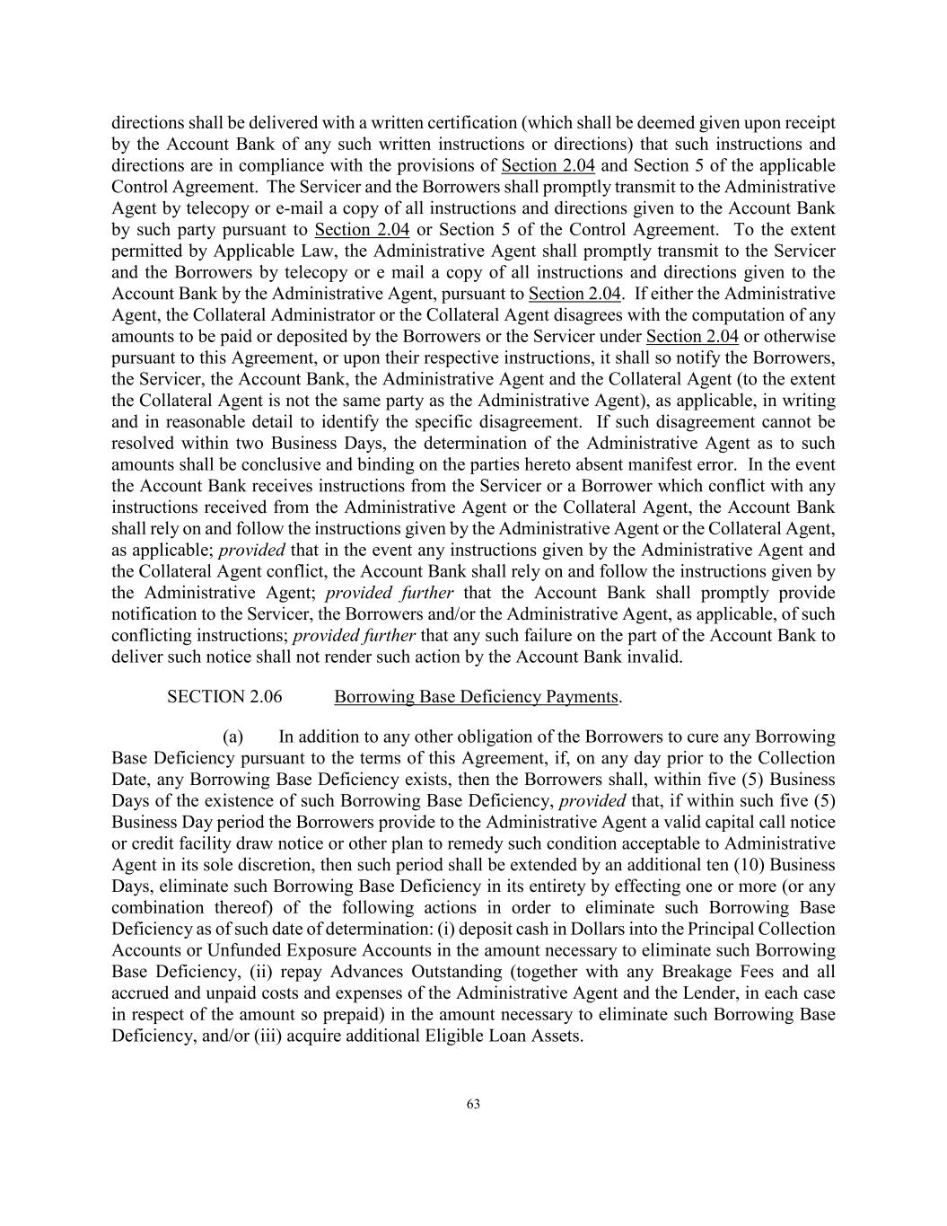63 directions shall be delivered with a written certification (which shall be deemed given upon receipt by the Account Bank of any such written instructions or directions) that such instructions and directions are in compliance with the provisions of Section 2.04 and Section 5 of the applicable Control Agreement. The Servicer and the Borrowers shall promptly transmit to the Administrative Agent by telecopy or e-mail a copy of all instructions and directions given to the Account Bank by such party pursuant to Section 2.04 or Section 5 of the Control Agreement. To the extent permitted by Applicable Law, the Administrative Agent shall promptly transmit to the Servicer and the Borrowers by telecopy or e mail a copy of all instructions and directions given to the Account Bank by the Administrative Agent, pursuant to Section 2.04. If either the Administrative Agent, the Collateral Administrator or the Collateral Agent disagrees with the computation of any amounts to be paid or deposited by the Borrowers or the Servicer under Section 2.04 or otherwise pursuant to this Agreement, or upon their respective instructions, it shall so notify the Borrowers, the Servicer, the Account Bank, the Administrative Agent and the Collateral Agent (to the extent the Collateral Agent is not the same party as the Administrative Agent), as applicable, in writing and in reasonable detail to identify the specific disagreement. If such disagreement cannot be resolved within two Business Days, the determination of the Administrative Agent as to such amounts shall be conclusive and binding on the parties hereto absent manifest error. In the event the Account Bank receives instructions from the Servicer or a Borrower which conflict with any instructions received from the Administrative Agent or the Collateral Agent, the Account Bank shall rely on and follow the instructions given by the Administrative Agent or the Collateral Agent, as applicable; provided that in the event any instructions given by the Administrative Agent and the Collateral Agent conflict, the Account Bank shall rely on and follow the instructions given by the Administrative Agent; provided further that the Account Bank shall promptly provide notification to the Servicer, the Borrowers and/or the Administrative Agent, as applicable, of such conflicting instructions; provided further that any such failure on the part of the Account Bank to deliver such notice shall not render such action by the Account Bank invalid. SECTION 2.06 Borrowing Base Deficiency Payments. (a) In addition to any other obligation of the Borrowers to cure any Borrowing Base Deficiency pursuant to the terms of this Agreement, if, on any day prior to the Collection Date, any Borrowing Base Deficiency exists, then the Borrowers shall, within five (5) Business Days of the existence of such Borrowing Base Deficiency, provided that, if within such five (5) Business Day period the Borrowers provide to the Administrative Agent a valid capital call notice or credit facility draw notice or other plan to remedy such condition acceptable to Administrative Agent in its sole discretion, then such period shall be extended by an additional ten (10) Business Days, eliminate such Borrowing Base Deficiency in its entirety by effecting one or more (or any combination thereof) of the following actions in order to eliminate such Borrowing Base Deficiency as of such date of determination: (i) deposit cash in Dollars into the Principal Collection Accounts or Unfunded Exposure Accounts in the amount necessary to eliminate such Borrowing Base Deficiency, (ii) repay Advances Outstanding (together with any Breakage Fees and all accrued and unpaid costs and expenses of the Administrative Agent and the Lender, in each case in respect of the amount so prepaid) in the amount necessary to eliminate such Borrowing Base Deficiency, and/or (iii) acquire additional Eligible Loan Assets.