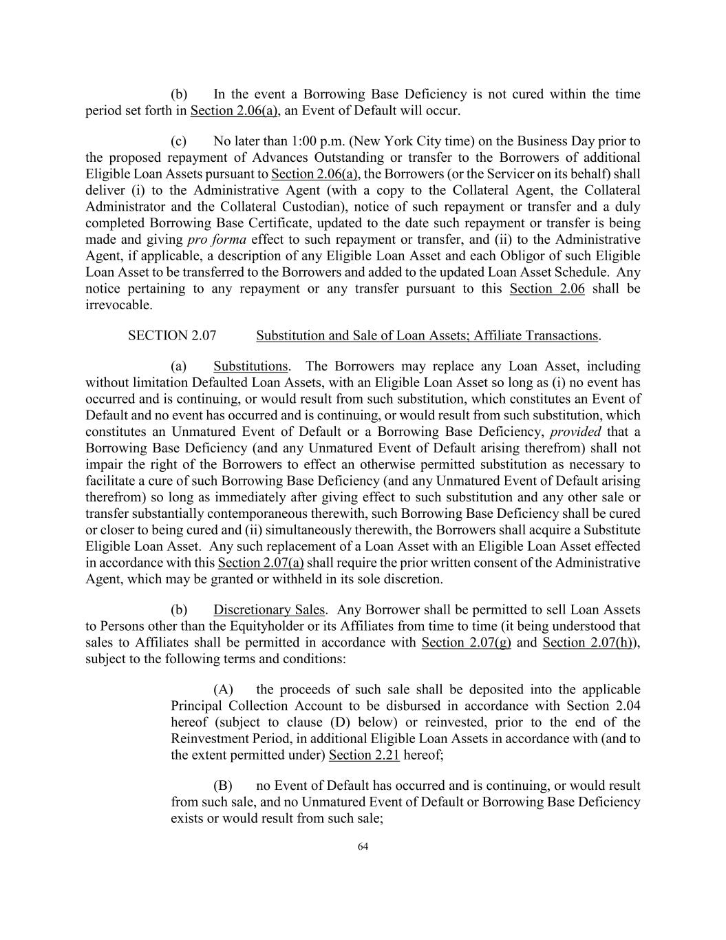64 (b) In the event a Borrowing Base Deficiency is not cured within the time period set forth in Section 2.06(a), an Event of Default will occur. (c) No later than 1:00 p.m. (New York City time) on the Business Day prior to the proposed repayment of Advances Outstanding or transfer to the Borrowers of additional Eligible Loan Assets pursuant to Section 2.06(a), the Borrowers (or the Servicer on its behalf) shall deliver (i) to the Administrative Agent (with a copy to the Collateral Agent, the Collateral Administrator and the Collateral Custodian), notice of such repayment or transfer and a duly completed Borrowing Base Certificate, updated to the date such repayment or transfer is being made and giving pro forma effect to such repayment or transfer, and (ii) to the Administrative Agent, if applicable, a description of any Eligible Loan Asset and each Obligor of such Eligible Loan Asset to be transferred to the Borrowers and added to the updated Loan Asset Schedule. Any notice pertaining to any repayment or any transfer pursuant to this Section 2.06 shall be irrevocable. SECTION 2.07 Substitution and Sale of Loan Assets; Affiliate Transactions. (a) Substitutions. The Borrowers may replace any Loan Asset, including without limitation Defaulted Loan Assets, with an Eligible Loan Asset so long as (i) no event has occurred and is continuing, or would result from such substitution, which constitutes an Event of Default and no event has occurred and is continuing, or would result from such substitution, which constitutes an Unmatured Event of Default or a Borrowing Base Deficiency, provided that a Borrowing Base Deficiency (and any Unmatured Event of Default arising therefrom) shall not impair the right of the Borrowers to effect an otherwise permitted substitution as necessary to facilitate a cure of such Borrowing Base Deficiency (and any Unmatured Event of Default arising therefrom) so long as immediately after giving effect to such substitution and any other sale or transfer substantially contemporaneous therewith, such Borrowing Base Deficiency shall be cured or closer to being cured and (ii) simultaneously therewith, the Borrowers shall acquire a Substitute Eligible Loan Asset. Any such replacement of a Loan Asset with an Eligible Loan Asset effected in accordance with this Section 2.07(a) shall require the prior written consent of the Administrative Agent, which may be granted or withheld in its sole discretion. (b) Discretionary Sales. Any Borrower shall be permitted to sell Loan Assets to Persons other than the Equityholder or its Affiliates from time to time (it being understood that sales to Affiliates shall be permitted in accordance with Section 2.07(g) and Section 2.07(h)), subject to the following terms and conditions: (A) the proceeds of such sale shall be deposited into the applicable Principal Collection Account to be disbursed in accordance with Section 2.04 hereof (subject to clause (D) below) or reinvested, prior to the end of the Reinvestment Period, in additional Eligible Loan Assets in accordance with (and to the extent permitted under) Section 2.21 hereof; (B) no Event of Default has occurred and is continuing, or would result from such sale, and no Unmatured Event of Default or Borrowing Base Deficiency exists or would result from such sale;