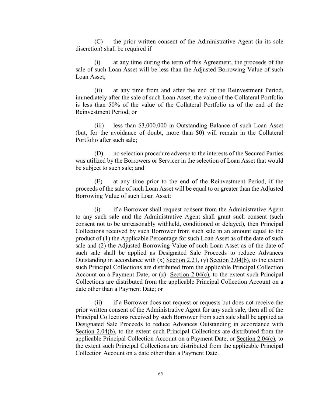65 (C) the prior written consent of the Administrative Agent (in its sole discretion) shall be required if (i) at any time during the term of this Agreement, the proceeds of the sale of such Loan Asset will be less than the Adjusted Borrowing Value of such Loan Asset; (ii) at any time from and after the end of the Reinvestment Period, immediately after the sale of such Loan Asset, the value of the Collateral Portfolio is less than 50% of the value of the Collateral Portfolio as of the end of the Reinvestment Period; or (iii) less than $3,000,000 in Outstanding Balance of such Loan Asset (but, for the avoidance of doubt, more than $0) will remain in the Collateral Portfolio after such sale; (D) no selection procedure adverse to the interests of the Secured Parties was utilized by the Borrowers or Servicer in the selection of Loan Asset that would be subject to such sale; and (E) at any time prior to the end of the Reinvestment Period, if the proceeds of the sale of such Loan Asset will be equal to or greater than the Adjusted Borrowing Value of such Loan Asset: (i) if a Borrower shall request consent from the Administrative Agent to any such sale and the Administrative Agent shall grant such consent (such consent not to be unreasonably withheld, conditioned or delayed), then Principal Collections received by such Borrower from such sale in an amount equal to the product of (1) the Applicable Percentage for such Loan Asset as of the date of such sale and (2) the Adjusted Borrowing Value of such Loan Asset as of the date of such sale shall be applied as Designated Sale Proceeds to reduce Advances Outstanding in accordance with (x) Section 2.21, (y) Section 2.04(b), to the extent such Principal Collections are distributed from the applicable Principal Collection Account on a Payment Date, or (z) Section 2.04(c), to the extent such Principal Collections are distributed from the applicable Principal Collection Account on a date other than a Payment Date; or (ii) if a Borrower does not request or requests but does not receive the prior written consent of the Administrative Agent for any such sale, then all of the Principal Collections received by such Borrower from such sale shall be applied as Designated Sale Proceeds to reduce Advances Outstanding in accordance with Section 2.04(b), to the extent such Principal Collections are distributed from the applicable Principal Collection Account on a Payment Date, or Section 2.04(c), to the extent such Principal Collections are distributed from the applicable Principal Collection Account on a date other than a Payment Date.