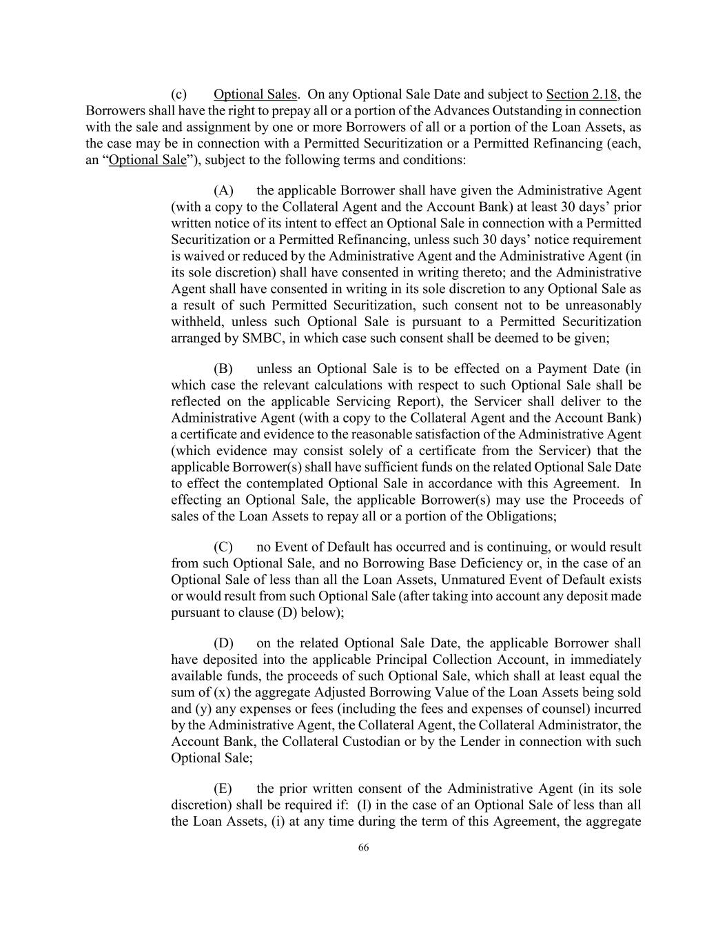 66 (c) Optional Sales. On any Optional Sale Date and subject to Section 2.18, the Borrowers shall have the right to prepay all or a portion of the Advances Outstanding in connection with the sale and assignment by one or more Borrowers of all or a portion of the Loan Assets, as the case may be in connection with a Permitted Securitization or a Permitted Refinancing (each, an “Optional Sale”), subject to the following terms and conditions: (A) the applicable Borrower shall have given the Administrative Agent (with a copy to the Collateral Agent and the Account Bank) at least 30 days’ prior written notice of its intent to effect an Optional Sale in connection with a Permitted Securitization or a Permitted Refinancing, unless such 30 days’ notice requirement is waived or reduced by the Administrative Agent and the Administrative Agent (in its sole discretion) shall have consented in writing thereto; and the Administrative Agent shall have consented in writing in its sole discretion to any Optional Sale as a result of such Permitted Securitization, such consent not to be unreasonably withheld, unless such Optional Sale is pursuant to a Permitted Securitization arranged by SMBC, in which case such consent shall be deemed to be given; (B) unless an Optional Sale is to be effected on a Payment Date (in which case the relevant calculations with respect to such Optional Sale shall be reflected on the applicable Servicing Report), the Servicer shall deliver to the Administrative Agent (with a copy to the Collateral Agent and the Account Bank) a certificate and evidence to the reasonable satisfaction of the Administrative Agent (which evidence may consist solely of a certificate from the Servicer) that the applicable Borrower(s) shall have sufficient funds on the related Optional Sale Date to effect the contemplated Optional Sale in accordance with this Agreement. In effecting an Optional Sale, the applicable Borrower(s) may use the Proceeds of sales of the Loan Assets to repay all or a portion of the Obligations; (C) no Event of Default has occurred and is continuing, or would result from such Optional Sale, and no Borrowing Base Deficiency or, in the case of an Optional Sale of less than all the Loan Assets, Unmatured Event of Default exists or would result from such Optional Sale (after taking into account any deposit made pursuant to clause (D) below); (D) on the related Optional Sale Date, the applicable Borrower shall have deposited into the applicable Principal Collection Account, in immediately available funds, the proceeds of such Optional Sale, which shall at least equal the sum of (x) the aggregate Adjusted Borrowing Value of the Loan Assets being sold and (y) any expenses or fees (including the fees and expenses of counsel) incurred by the Administrative Agent, the Collateral Agent, the Collateral Administrator, the Account Bank, the Collateral Custodian or by the Lender in connection with such Optional Sale; (E) the prior written consent of the Administrative Agent (in its sole discretion) shall be required if: (I) in the case of an Optional Sale of less than all the Loan Assets, (i) at any time during the term of this Agreement, the aggregate