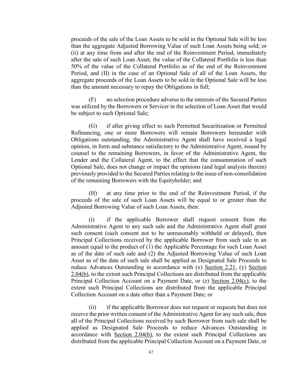 67 proceeds of the sale of the Loan Assets to be sold in the Optional Sale will be less than the aggregate Adjusted Borrowing Value of such Loan Assets being sold; or (ii) at any time from and after the end of the Reinvestment Period, immediately after the sale of such Loan Asset, the value of the Collateral Portfolio is less than 50% of the value of the Collateral Portfolio as of the end of the Reinvestment Period, and (II) in the case of an Optional Sale of all of the Loan Assets, the aggregate proceeds of the Loan Assets to be sold in the Optional Sale will be less than the amount necessary to repay the Obligations in full; (F) no selection procedure adverse to the interests of the Secured Parties was utilized by the Borrowers or Servicer in the selection of Loan Asset that would be subject to such Optional Sale; (G) if after giving effect to such Permitted Securitization or Permitted Refinancing, one or more Borrowers will remain Borrowers hereunder with Obligations outstanding, the Administrative Agent shall have received a legal opinion, in form and substance satisfactory to the Administrative Agent, issued by counsel to the remaining Borrowers, in favor of the Administrative Agent, the Lender and the Collateral Agent, to the effect that the consummation of such Optional Sale, does not change or impact the opinions (and legal analysis therein) previously provided to the Secured Parties relating to the issue of non-consolidation of the remaining Borrowers with the Equityholder; and (H) at any time prior to the end of the Reinvestment Period, if the proceeds of the sale of such Loan Assets will be equal to or greater than the Adjusted Borrowing Value of such Loan Assets, then: (i) if the applicable Borrower shall request consent from the Administrative Agent to any such sale and the Administrative Agent shall grant such consent (such consent not to be unreasonably withheld or delayed), then Principal Collections received by the applicable Borrower from such sale in an amount equal to the product of (1) the Applicable Percentage for such Loan Asset as of the date of such sale and (2) the Adjusted Borrowing Value of such Loan Asset as of the date of such sale shall be applied as Designated Sale Proceeds to reduce Advances Outstanding in accordance with (x) Section 2.21, (y) Section 2.04(b), to the extent such Principal Collections are distributed from the applicable Principal Collection Account on a Payment Date, or (z) Section 2.04(c), to the extent such Principal Collections are distributed from the applicable Principal Collection Account on a date other than a Payment Date; or (ii) if the applicable Borrower does not request or requests but does not receive the prior written consent of the Administrative Agent for any such sale, then all of the Principal Collections received by such Borrower from such sale shall be applied as Designated Sale Proceeds to reduce Advances Outstanding in accordance with Section 2.04(b), to the extent such Principal Collections are distributed from the applicable Principal Collection Account on a Payment Date, or