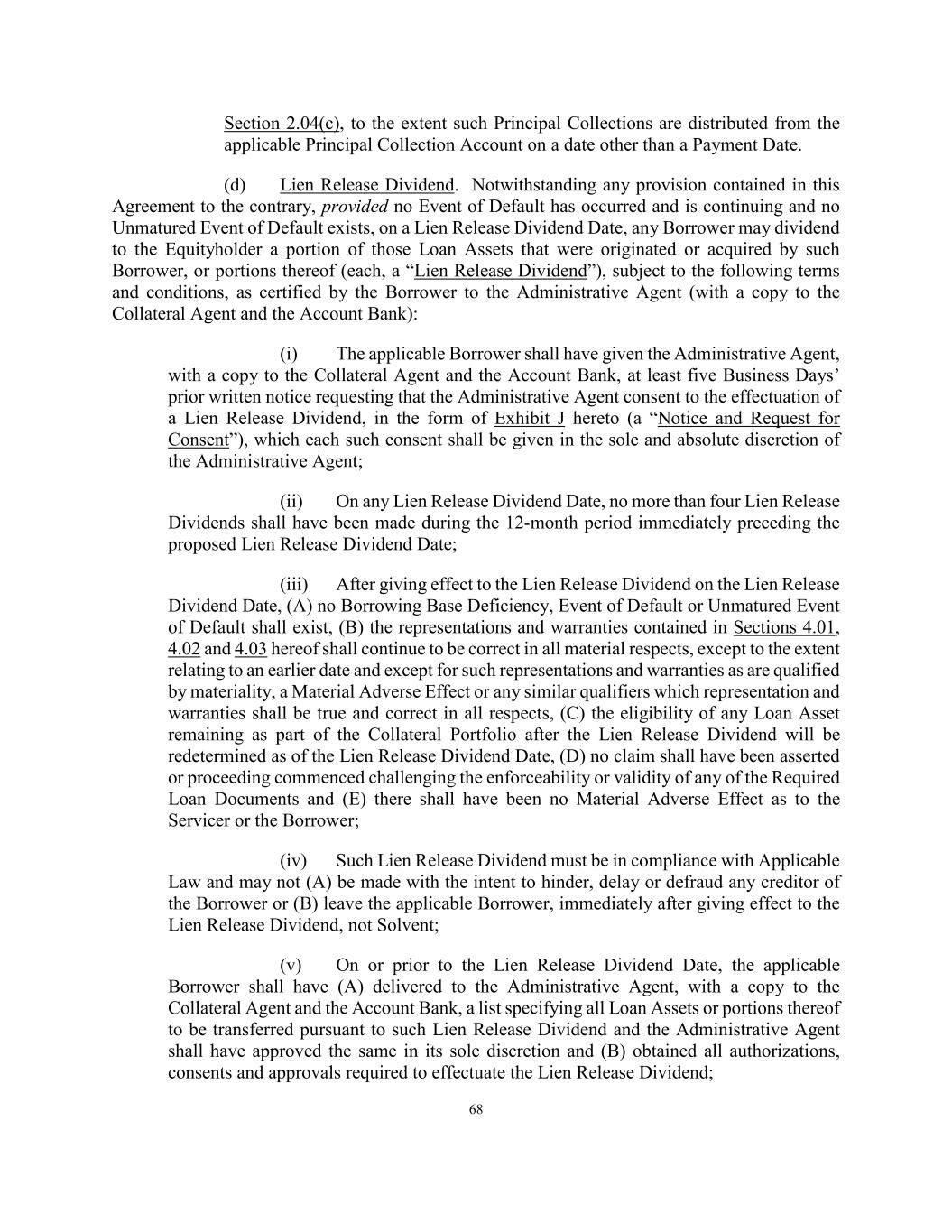 68 Section 2.04(c), to the extent such Principal Collections are distributed from the applicable Principal Collection Account on a date other than a Payment Date. (d) Lien Release Dividend. Notwithstanding any provision contained in this Agreement to the contrary, provided no Event of Default has occurred and is continuing and no Unmatured Event of Default exists, on a Lien Release Dividend Date, any Borrower may dividend to the Equityholder a portion of those Loan Assets that were originated or acquired by such Borrower, or portions thereof (each, a “Lien Release Dividend”), subject to the following terms and conditions, as certified by the Borrower to the Administrative Agent (with a copy to the Collateral Agent and the Account Bank): (i) The applicable Borrower shall have given the Administrative Agent, with a copy to the Collateral Agent and the Account Bank, at least five Business Days’ prior written notice requesting that the Administrative Agent consent to the effectuation of a Lien Release Dividend, in the form of Exhibit J hereto (a “Notice and Request for Consent”), which each such consent shall be given in the sole and absolute discretion of the Administrative Agent; (ii) On any Lien Release Dividend Date, no more than four Lien Release Dividends shall have been made during the 12-month period immediately preceding the proposed Lien Release Dividend Date; (iii) After giving effect to the Lien Release Dividend on the Lien Release Dividend Date, (A) no Borrowing Base Deficiency, Event of Default or Unmatured Event of Default shall exist, (B) the representations and warranties contained in Sections 4.01, 4.02 and 4.03 hereof shall continue to be correct in all material respects, except to the extent relating to an earlier date and except for such representations and warranties as are qualified by materiality, a Material Adverse Effect or any similar qualifiers which representation and warranties shall be true and correct in all respects, (C) the eligibility of any Loan Asset remaining as part of the Collateral Portfolio after the Lien Release Dividend will be redetermined as of the Lien Release Dividend Date, (D) no claim shall have been asserted or proceeding commenced challenging the enforceability or validity of any of the Required Loan Documents and (E) there shall have been no Material Adverse Effect as to the Servicer or the Borrower; (iv) Such Lien Release Dividend must be in compliance with Applicable Law and may not (A) be made with the intent to hinder, delay or defraud any creditor of the Borrower or (B) leave the applicable Borrower, immediately after giving effect to the Lien Release Dividend, not Solvent; (v) On or prior to the Lien Release Dividend Date, the applicable Borrower shall have (A) delivered to the Administrative Agent, with a copy to the Collateral Agent and the Account Bank, a list specifying all Loan Assets or portions thereof to be transferred pursuant to such Lien Release Dividend and the Administrative Agent shall have approved the same in its sole discretion and (B) obtained all authorizations, consents and approvals required to effectuate the Lien Release Dividend;