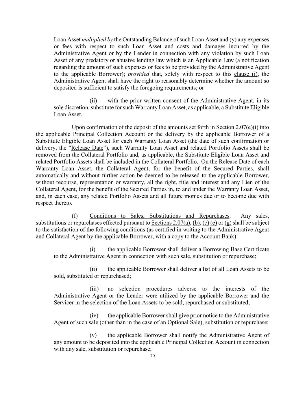 70 Loan Asset multiplied by the Outstanding Balance of such Loan Asset and (y) any expenses or fees with respect to such Loan Asset and costs and damages incurred by the Administrative Agent or by the Lender in connection with any violation by such Loan Asset of any predatory or abusive lending law which is an Applicable Law (a notification regarding the amount of such expenses or fees to be provided by the Administrative Agent to the applicable Borrower); provided that, solely with respect to this clause (i), the Administrative Agent shall have the right to reasonably determine whether the amount so deposited is sufficient to satisfy the foregoing requirements; or (ii) with the prior written consent of the Administrative Agent, in its sole discretion, substitute for such Warranty Loan Asset, as applicable, a Substitute Eligible Loan Asset. Upon confirmation of the deposit of the amounts set forth in Section 2.07(e)(i) into the applicable Principal Collection Account or the delivery by the applicable Borrower of a Substitute Eligible Loan Asset for each Warranty Loan Asset (the date of such confirmation or delivery, the “Release Date”), such Warranty Loan Asset and related Portfolio Assets shall be removed from the Collateral Portfolio and, as applicable, the Substitute Eligible Loan Asset and related Portfolio Assets shall be included in the Collateral Portfolio. On the Release Date of each Warranty Loan Asset, the Collateral Agent, for the benefit of the Secured Parties, shall automatically and without further action be deemed to be released to the applicable Borrower, without recourse, representation or warranty, all the right, title and interest and any Lien of the Collateral Agent, for the benefit of the Secured Parties in, to and under the Warranty Loan Asset, and, in each case, any related Portfolio Assets and all future monies due or to become due with respect thereto. (f) Conditions to Sales, Substitutions and Repurchases. Any sales, substitutions or repurchases effected pursuant to Sections 2.07(a), (b), (c) (e) or (g) shall be subject to the satisfaction of the following conditions (as certified in writing to the Administrative Agent and Collateral Agent by the applicable Borrower, with a copy to the Account Bank): (i) the applicable Borrower shall deliver a Borrowing Base Certificate to the Administrative Agent in connection with such sale, substitution or repurchase; (ii) the applicable Borrower shall deliver a list of all Loan Assets to be sold, substituted or repurchased; (iii) no selection procedures adverse to the interests of the Administrative Agent or the Lender were utilized by the applicable Borrower and the Servicer in the selection of the Loan Assets to be sold, repurchased or substituted; (iv) the applicable Borrower shall give prior notice to the Administrative Agent of such sale (other than in the case of an Optional Sale), substitution or repurchase; (v) the applicable Borrower shall notify the Administrative Agent of any amount to be deposited into the applicable Principal Collection Account in connection with any sale, substitution or repurchase;