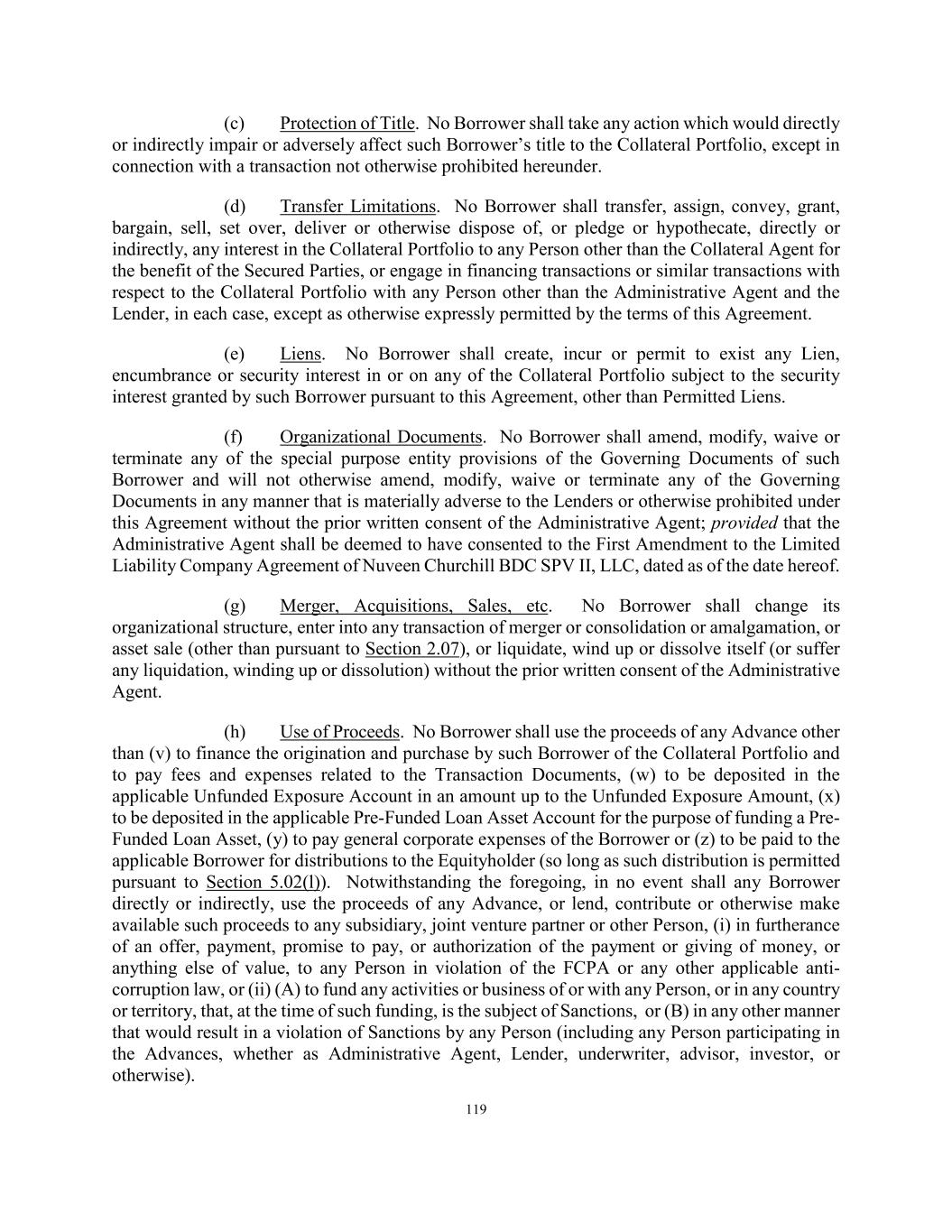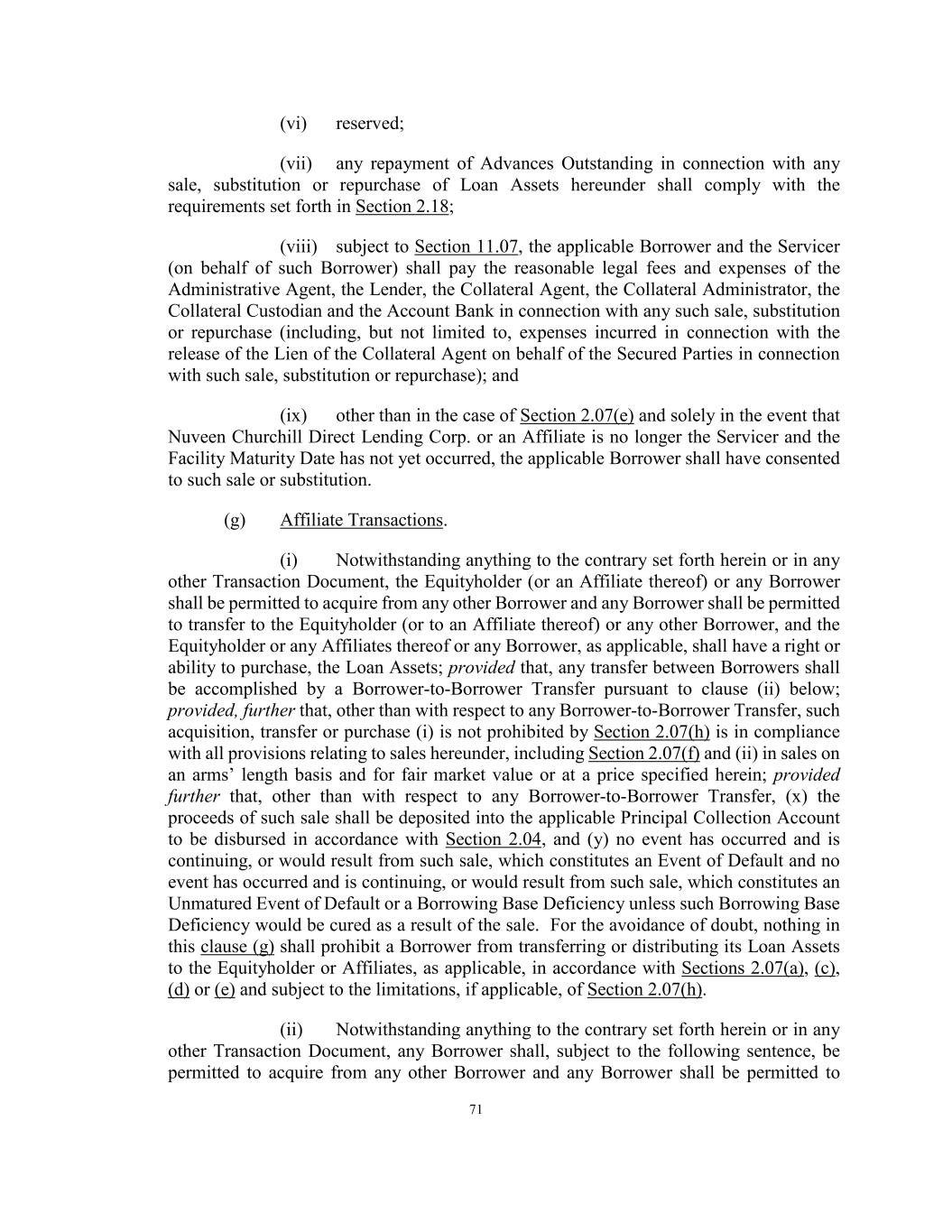 71 (vi) reserved; (vii) any repayment of Advances Outstanding in connection with any sale, substitution or repurchase of Loan Assets hereunder shall comply with the requirements set forth in Section 2.18; (viii) subject to Section 11.07, the applicable Borrower and the Servicer (on behalf of such Borrower) shall pay the reasonable legal fees and expenses of the Administrative Agent, the Lender, the Collateral Agent, the Collateral Administrator, the Collateral Custodian and the Account Bank in connection with any such sale, substitution or repurchase (including, but not limited to, expenses incurred in connection with the release of the Lien of the Collateral Agent on behalf of the Secured Parties in connection with such sale, substitution or repurchase); and (ix) other than in the case of Section 2.07(e) and solely in the event that Nuveen Churchill Direct Lending Corp. or an Affiliate is no longer the Servicer and the Facility Maturity Date has not yet occurred, the applicable Borrower shall have consented to such sale or substitution. (g) Affiliate Transactions. (i) Notwithstanding anything to the contrary set forth herein or in any other Transaction Document, the Equityholder (or an Affiliate thereof) or any Borrower shall be permitted to acquire from any other Borrower and any Borrower shall be permitted to transfer to the Equityholder (or to an Affiliate thereof) or any other Borrower, and the Equityholder or any Affiliates thereof or any Borrower, as applicable, shall have a right or ability to purchase, the Loan Assets; provided that, any transfer between Borrowers shall be accomplished by a Borrower-to-Borrower Transfer pursuant to clause (ii) below; provided, further that, other than with respect to any Borrower-to-Borrower Transfer, such acquisition, transfer or purchase (i) is not prohibited by Section 2.07(h) is in compliance with all provisions relating to sales hereunder, including Section 2.07(f) and (ii) in sales on an arms’ length basis and for fair market value or at a price specified herein; provided further that, other than with respect to any Borrower-to-Borrower Transfer, (x) the proceeds of such sale shall be deposited into the applicable Principal Collection Account to be disbursed in accordance with Section 2.04, and (y) no event has occurred and is continuing, or would result from such sale, which constitutes an Event of Default and no event has occurred and is continuing, or would result from such sale, which constitutes an Unmatured Event of Default or a Borrowing Base Deficiency unless such Borrowing Base Deficiency would be cured as a result of the sale. For the avoidance of doubt, nothing in this clause (g) shall prohibit a Borrower from transferring or distributing its Loan Assets to the Equityholder or Affiliates, as applicable, in accordance with Sections 2.07(a), (c), (d) or (e) and subject to the limitations, if applicable, of Section 2.07(h). (ii) Notwithstanding anything to the contrary set forth herein or in any other Transaction Document, any Borrower shall, subject to the following sentence, be permitted to acquire from any other Borrower and any Borrower shall be permitted to