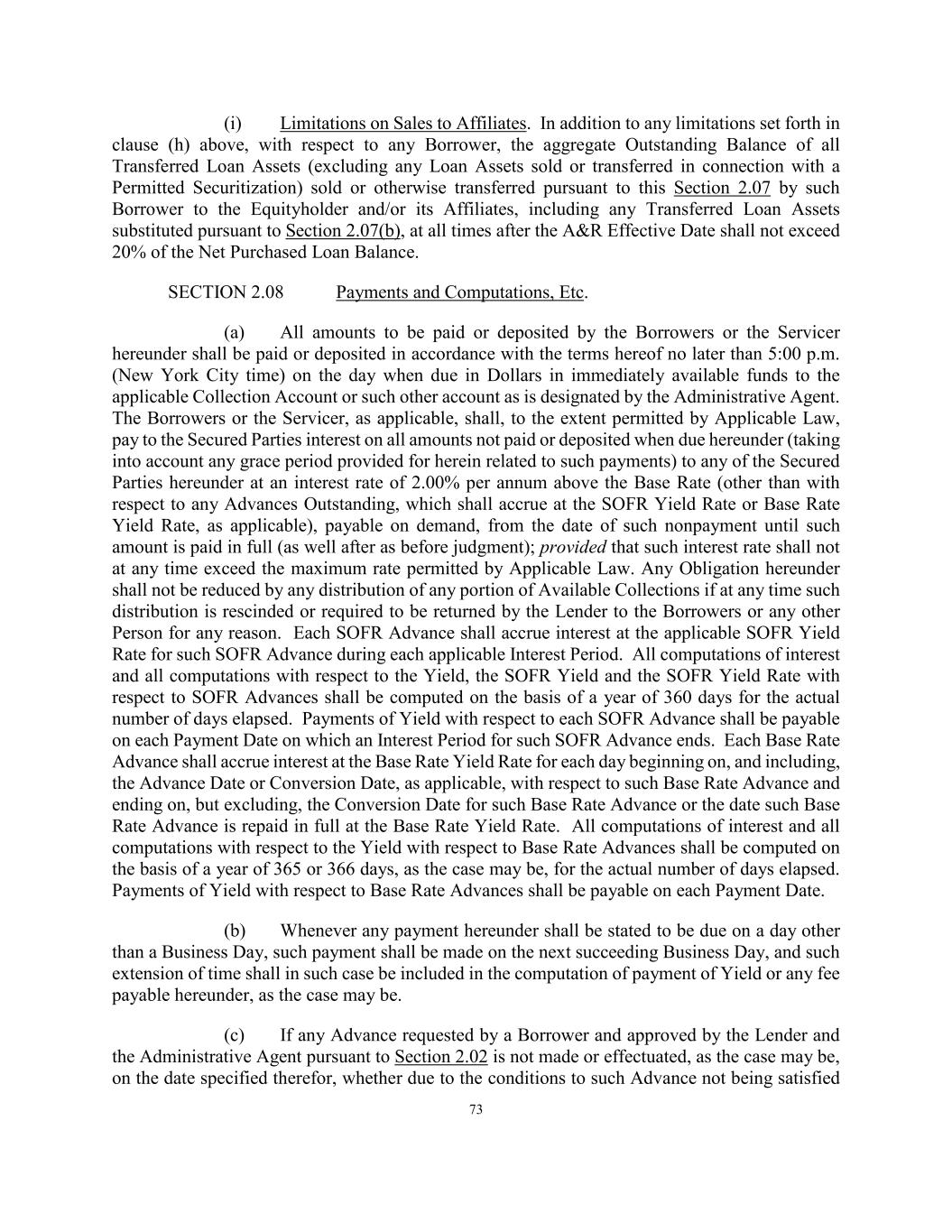 73 (i) Limitations on Sales to Affiliates. In addition to any limitations set forth in clause (h) above, with respect to any Borrower, the aggregate Outstanding Balance of all Transferred Loan Assets (excluding any Loan Assets sold or transferred in connection with a Permitted Securitization) sold or otherwise transferred pursuant to this Section 2.07 by such Borrower to the Equityholder and/or its Affiliates, including any Transferred Loan Assets substituted pursuant to Section 2.07(b), at all times after the A&R Effective Date shall not exceed 20% of the Net Purchased Loan Balance. SECTION 2.08 Payments and Computations, Etc. (a) All amounts to be paid or deposited by the Borrowers or the Servicer hereunder shall be paid or deposited in accordance with the terms hereof no later than 5:00 p.m. (New York City time) on the day when due in Dollars in immediately available funds to the applicable Collection Account or such other account as is designated by the Administrative Agent. The Borrowers or the Servicer, as applicable, shall, to the extent permitted by Applicable Law, pay to the Secured Parties interest on all amounts not paid or deposited when due hereunder (taking into account any grace period provided for herein related to such payments) to any of the Secured Parties hereunder at an interest rate of 2.00% per annum above the Base Rate (other than with respect to any Advances Outstanding, which shall accrue at the SOFR Yield Rate or Base Rate Yield Rate, as applicable), payable on demand, from the date of such nonpayment until such amount is paid in full (as well after as before judgment); provided that such interest rate shall not at any time exceed the maximum rate permitted by Applicable Law. Any Obligation hereunder shall not be reduced by any distribution of any portion of Available Collections if at any time such distribution is rescinded or required to be returned by the Lender to the Borrowers or any other Person for any reason. Each SOFR Advance shall accrue interest at the applicable SOFR Yield Rate for such SOFR Advance during each applicable Interest Period. All computations of interest and all computations with respect to the Yield, the SOFR Yield and the SOFR Yield Rate with respect to SOFR Advances shall be computed on the basis of a year of 360 days for the actual number of days elapsed. Payments of Yield with respect to each SOFR Advance shall be payable on each Payment Date on which an Interest Period for such SOFR Advance ends. Each Base Rate Advance shall accrue interest at the Base Rate Yield Rate for each day beginning on, and including, the Advance Date or Conversion Date, as applicable, with respect to such Base Rate Advance and ending on, but excluding, the Conversion Date for such Base Rate Advance or the date such Base Rate Advance is repaid in full at the Base Rate Yield Rate. All computations of interest and all computations with respect to the Yield with respect to Base Rate Advances shall be computed on the basis of a year of 365 or 366 days, as the case may be, for the actual number of days elapsed. Payments of Yield with respect to Base Rate Advances shall be payable on each Payment Date. (b) Whenever any payment hereunder shall be stated to be due on a day other than a Business Day, such payment shall be made on the next succeeding Business Day, and such extension of time shall in such case be included in the computation of payment of Yield or any fee payable hereunder, as the case may be. (c) If any Advance requested by a Borrower and approved by the Lender and the Administrative Agent pursuant to Section 2.02 is not made or effectuated, as the case may be, on the date specified therefor, whether due to the conditions to such Advance not being satisfied