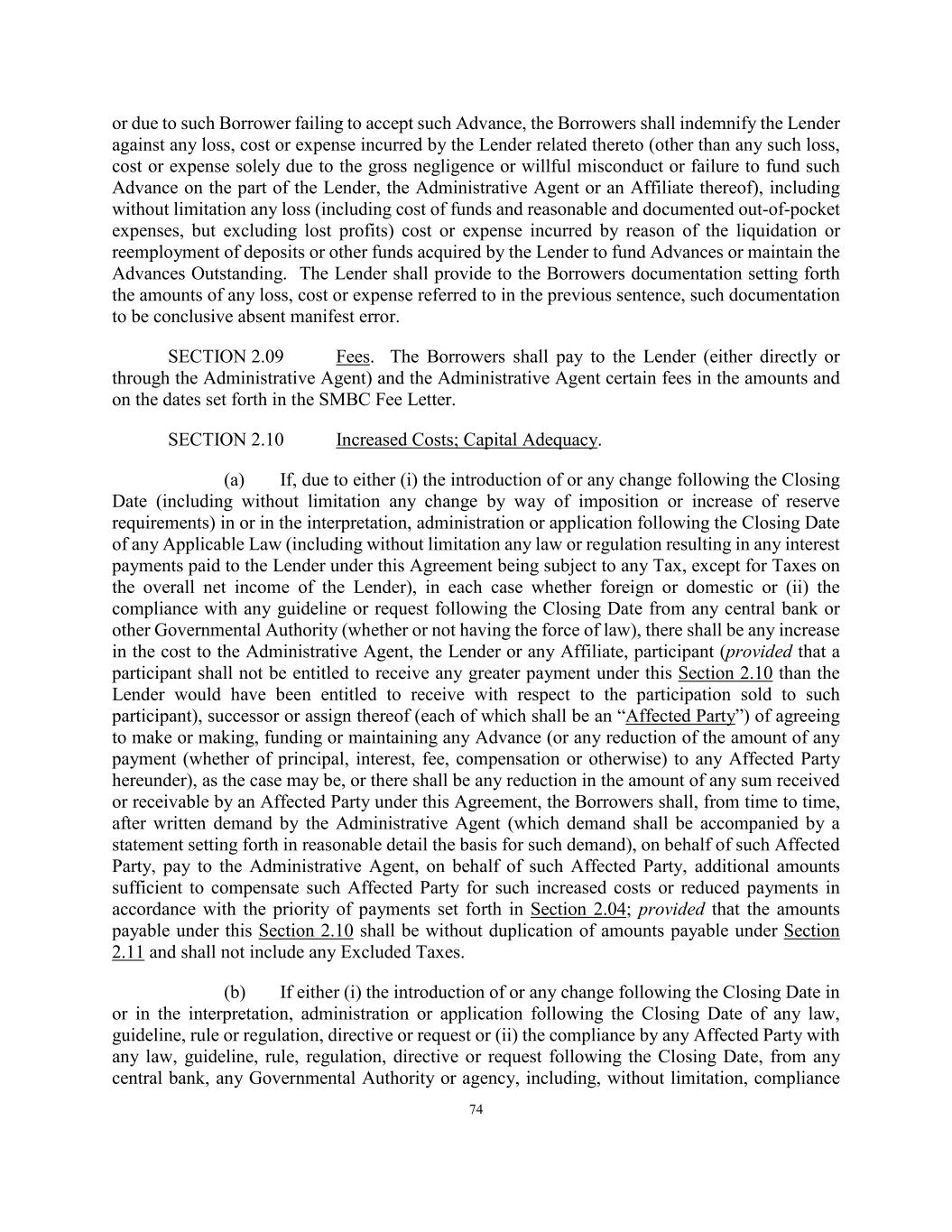 74 or due to such Borrower failing to accept such Advance, the Borrowers shall indemnify the Lender against any loss, cost or expense incurred by the Lender related thereto (other than any such loss, cost or expense solely due to the gross negligence or willful misconduct or failure to fund such Advance on the part of the Lender, the Administrative Agent or an Affiliate thereof), including without limitation any loss (including cost of funds and reasonable and documented out-of-pocket expenses, but excluding lost profits) cost or expense incurred by reason of the liquidation or reemployment of deposits or other funds acquired by the Lender to fund Advances or maintain the Advances Outstanding. The Lender shall provide to the Borrowers documentation setting forth the amounts of any loss, cost or expense referred to in the previous sentence, such documentation to be conclusive absent manifest error. SECTION 2.09 Fees. The Borrowers shall pay to the Lender (either directly or through the Administrative Agent) and the Administrative Agent certain fees in the amounts and on the dates set forth in the SMBC Fee Letter. SECTION 2.10 Increased Costs; Capital Adequacy. (a) If, due to either (i) the introduction of or any change following the Closing Date (including without limitation any change by way of imposition or increase of reserve requirements) in or in the interpretation, administration or application following the Closing Date of any Applicable Law (including without limitation any law or regulation resulting in any interest payments paid to the Lender under this Agreement being subject to any Tax, except for Taxes on the overall net income of the Lender), in each case whether foreign or domestic or (ii) the compliance with any guideline or request following the Closing Date from any central bank or other Governmental Authority (whether or not having the force of law), there shall be any increase in the cost to the Administrative Agent, the Lender or any Affiliate, participant (provided that a participant shall not be entitled to receive any greater payment under this Section 2.10 than the Lender would have been entitled to receive with respect to the participation sold to such participant), successor or assign thereof (each of which shall be an “Affected Party”) of agreeing to make or making, funding or maintaining any Advance (or any reduction of the amount of any payment (whether of principal, interest, fee, compensation or otherwise) to any Affected Party hereunder), as the case may be, or there shall be any reduction in the amount of any sum received or receivable by an Affected Party under this Agreement, the Borrowers shall, from time to time, after written demand by the Administrative Agent (which demand shall be accompanied by a statement setting forth in reasonable detail the basis for such demand), on behalf of such Affected Party, pay to the Administrative Agent, on behalf of such Affected Party, additional amounts sufficient to compensate such Affected Party for such increased costs or reduced payments in accordance with the priority of payments set forth in Section 2.04; provided that the amounts payable under this Section 2.10 shall be without duplication of amounts payable under Section 2.11 and shall not include any Excluded Taxes. (b) If either (i) the introduction of or any change following the Closing Date in or in the interpretation, administration or application following the Closing Date of any law, guideline, rule or regulation, directive or request or (ii) the compliance by any Affected Party with any law, guideline, rule, regulation, directive or request following the Closing Date, from any central bank, any Governmental Authority or agency, including, without limitation, compliance
