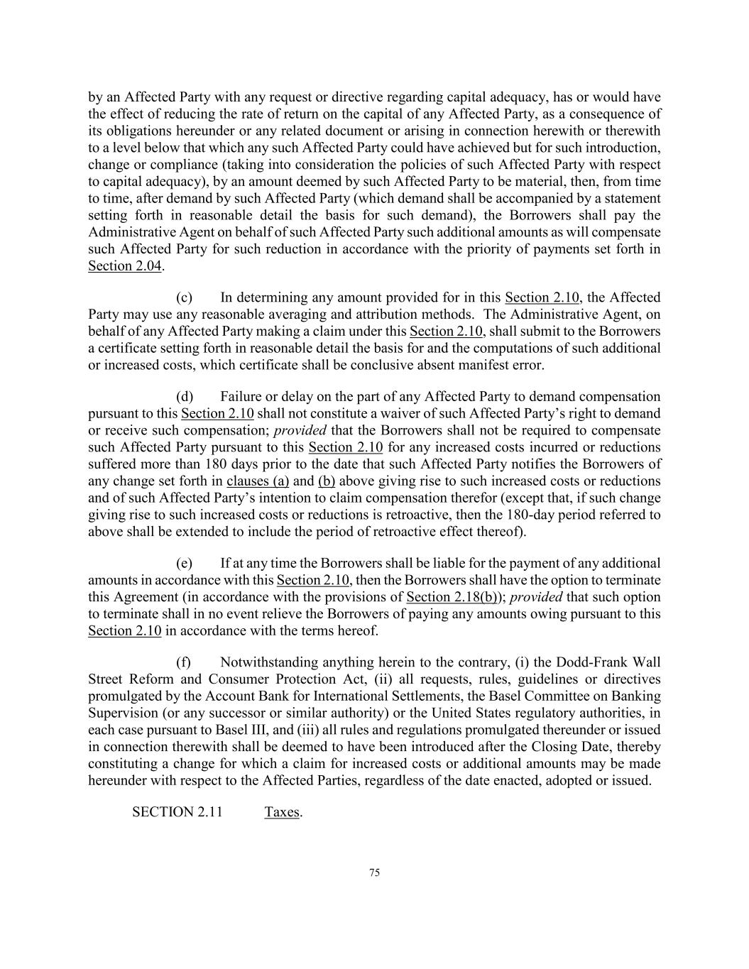 75 by an Affected Party with any request or directive regarding capital adequacy, has or would have the effect of reducing the rate of return on the capital of any Affected Party, as a consequence of its obligations hereunder or any related document or arising in connection herewith or therewith to a level below that which any such Affected Party could have achieved but for such introduction, change or compliance (taking into consideration the policies of such Affected Party with respect to capital adequacy), by an amount deemed by such Affected Party to be material, then, from time to time, after demand by such Affected Party (which demand shall be accompanied by a statement setting forth in reasonable detail the basis for such demand), the Borrowers shall pay the Administrative Agent on behalf of such Affected Party such additional amounts as will compensate such Affected Party for such reduction in accordance with the priority of payments set forth in Section 2.04. (c) In determining any amount provided for in this Section 2.10, the Affected Party may use any reasonable averaging and attribution methods. The Administrative Agent, on behalf of any Affected Party making a claim under this Section 2.10, shall submit to the Borrowers a certificate setting forth in reasonable detail the basis for and the computations of such additional or increased costs, which certificate shall be conclusive absent manifest error. (d) Failure or delay on the part of any Affected Party to demand compensation pursuant to this Section 2.10 shall not constitute a waiver of such Affected Party’s right to demand or receive such compensation; provided that the Borrowers shall not be required to compensate such Affected Party pursuant to this Section 2.10 for any increased costs incurred or reductions suffered more than 180 days prior to the date that such Affected Party notifies the Borrowers of any change set forth in clauses (a) and (b) above giving rise to such increased costs or reductions and of such Affected Party’s intention to claim compensation therefor (except that, if such change giving rise to such increased costs or reductions is retroactive, then the 180-day period referred to above shall be extended to include the period of retroactive effect thereof). (e) If at any time the Borrowers shall be liable for the payment of any additional amounts in accordance with this Section 2.10, then the Borrowers shall have the option to terminate this Agreement (in accordance with the provisions of Section 2.18(b)); provided that such option to terminate shall in no event relieve the Borrowers of paying any amounts owing pursuant to this Section 2.10 in accordance with the terms hereof. (f) Notwithstanding anything herein to the contrary, (i) the Dodd-Frank Wall Street Reform and Consumer Protection Act, (ii) all requests, rules, guidelines or directives promulgated by the Account Bank for International Settlements, the Basel Committee on Banking Supervision (or any successor or similar authority) or the United States regulatory authorities, in each case pursuant to Basel III, and (iii) all rules and regulations promulgated thereunder or issued in connection therewith shall be deemed to have been introduced after the Closing Date, thereby constituting a change for which a claim for increased costs or additional amounts may be made hereunder with respect to the Affected Parties, regardless of the date enacted, adopted or issued. SECTION 2.11 Taxes.