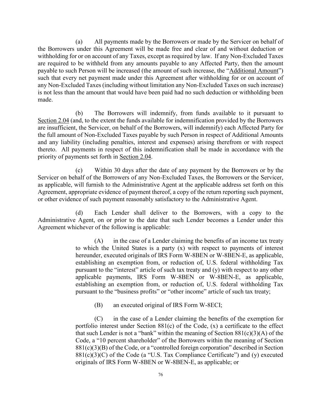 76 (a) All payments made by the Borrowers or made by the Servicer on behalf of the Borrowers under this Agreement will be made free and clear of and without deduction or withholding for or on account of any Taxes, except as required by law. If any Non-Excluded Taxes are required to be withheld from any amounts payable to any Affected Party, then the amount payable to such Person will be increased (the amount of such increase, the “Additional Amount”) such that every net payment made under this Agreement after withholding for or on account of any Non-Excluded Taxes (including without limitation any Non-Excluded Taxes on such increase) is not less than the amount that would have been paid had no such deduction or withholding been made. (b) The Borrowers will indemnify, from funds available to it pursuant to Section 2.04 (and, to the extent the funds available for indemnification provided by the Borrowers are insufficient, the Servicer, on behalf of the Borrowers, will indemnify) each Affected Party for the full amount of Non-Excluded Taxes payable by such Person in respect of Additional Amounts and any liability (including penalties, interest and expenses) arising therefrom or with respect thereto. All payments in respect of this indemnification shall be made in accordance with the priority of payments set forth in Section 2.04. (c) Within 30 days after the date of any payment by the Borrowers or by the Servicer on behalf of the Borrowers of any Non-Excluded Taxes, the Borrowers or the Servicer, as applicable, will furnish to the Administrative Agent at the applicable address set forth on this Agreement, appropriate evidence of payment thereof, a copy of the return reporting such payment, or other evidence of such payment reasonably satisfactory to the Administrative Agent. (d) Each Lender shall deliver to the Borrowers, with a copy to the Administrative Agent, on or prior to the date that such Lender becomes a Lender under this Agreement whichever of the following is applicable: (A) in the case of a Lender claiming the benefits of an income tax treaty to which the United States is a party (x) with respect to payments of interest hereunder, executed originals of IRS Form W-8BEN or W-8BEN-E, as applicable, establishing an exemption from, or reduction of, U.S. federal withholding Tax pursuant to the “interest” article of such tax treaty and (y) with respect to any other applicable payments, IRS Form W-8BEN or W-8BEN-E, as applicable, establishing an exemption from, or reduction of, U.S. federal withholding Tax pursuant to the “business profits” or “other income” article of such tax treaty; (B) an executed original of IRS Form W-8ECI; (C) in the case of a Lender claiming the benefits of the exemption for portfolio interest under Section 881(c) of the Code, (x) a certificate to the effect that such Lender is not a “bank” within the meaning of Section 881(c)(3)(A) of the Code, a “10 percent shareholder” of the Borrowers within the meaning of Section 881(c)(3)(B) of the Code, or a “controlled foreign corporation” described in Section 881(c)(3)(C) of the Code (a “U.S. Tax Compliance Certificate”) and (y) executed originals of IRS Form W-8BEN or W-8BEN-E, as applicable; or