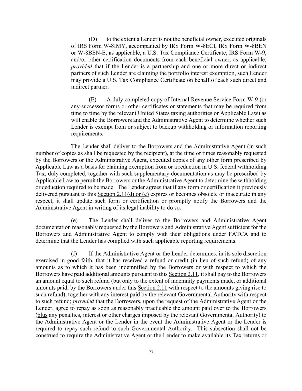 77 (D) to the extent a Lender is not the beneficial owner, executed originals of IRS Form W-8IMY, accompanied by IRS Form W-8ECI, IRS Form W-8BEN or W-8BEN-E, as applicable, a U.S. Tax Compliance Certificate, IRS Form W-9, and/or other certification documents from each beneficial owner, as applicable; provided that if the Lender is a partnership and one or more direct or indirect partners of such Lender are claiming the portfolio interest exemption, such Lender may provide a U.S. Tax Compliance Certificate on behalf of each such direct and indirect partner. (E) A duly completed copy of Internal Revenue Service Form W-9 (or any successor forms or other certificates or statements that may be required from time to time by the relevant United States taxing authorities or Applicable Law) as will enable the Borrowers and the Administrative Agent to determine whether such Lender is exempt from or subject to backup withholding or information reporting requirements. The Lender shall deliver to the Borrowers and the Administrative Agent (in such number of copies as shall be requested by the recipient), at the time or times reasonably requested by the Borrowers or the Administrative Agent, executed copies of any other form prescribed by Applicable Law as a basis for claiming exemption from or a reduction in U.S. federal withholding Tax, duly completed, together with such supplementary documentation as may be prescribed by Applicable Law to permit the Borrowers or the Administrative Agent to determine the withholding or deduction required to be made. The Lender agrees that if any form or certification it previously delivered pursuant to this Section 2.11(d) or (e) expires or becomes obsolete or inaccurate in any respect, it shall update such form or certification or promptly notify the Borrowers and the Administrative Agent in writing of its legal inability to do so. (e) The Lender shall deliver to the Borrowers and Administrative Agent documentation reasonably requested by the Borrowers and Administrative Agent sufficient for the Borrowers and Administrative Agent to comply with their obligations under FATCA and to determine that the Lender has complied with such applicable reporting requirements. (f) If the Administrative Agent or the Lender determines, in its sole discretion exercised in good faith, that it has received a refund or credit (in lieu of such refund) of any amounts as to which it has been indemnified by the Borrowers or with respect to which the Borrowers have paid additional amounts pursuant to this Section 2.11, it shall pay to the Borrowers an amount equal to such refund (but only to the extent of indemnity payments made, or additional amounts paid, by the Borrowers under this Section 2.11 with respect to the amounts giving rise to such refund), together with any interest paid by the relevant Governmental Authority with respect to such refund; provided that the Borrowers, upon the request of the Administrative Agent or the Lender, agree to repay as soon as reasonably practicable the amount paid over to the Borrowers (plus any penalties, interest or other charges imposed by the relevant Governmental Authority) to the Administrative Agent or the Lender in the event the Administrative Agent or the Lender is required to repay such refund to such Governmental Authority. This subsection shall not be construed to require the Administrative Agent or the Lender to make available its Tax returns or