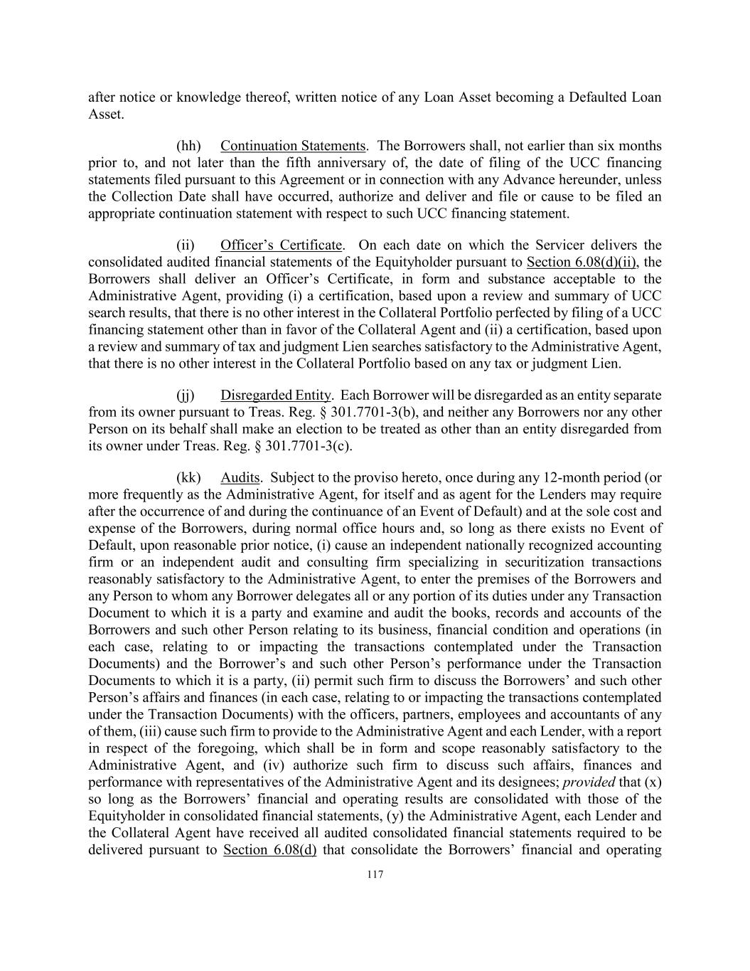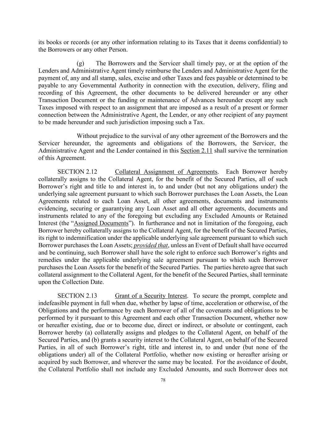 78 its books or records (or any other information relating to its Taxes that it deems confidential) to the Borrowers or any other Person. (g) The Borrowers and the Servicer shall timely pay, or at the option of the Lenders and Administrative Agent timely reimburse the Lenders and Administrative Agent for the payment of, any and all stamp, sales, excise and other Taxes and fees payable or determined to be payable to any Governmental Authority in connection with the execution, delivery, filing and recording of this Agreement, the other documents to be delivered hereunder or any other Transaction Document or the funding or maintenance of Advances hereunder except any such Taxes imposed with respect to an assignment that are imposed as a result of a present or former connection between the Administrative Agent, the Lender, or any other recipient of any payment to be made hereunder and such jurisdiction imposing such a Tax. Without prejudice to the survival of any other agreement of the Borrowers and the Servicer hereunder, the agreements and obligations of the Borrowers, the Servicer, the Administrative Agent and the Lender contained in this Section 2.11 shall survive the termination of this Agreement. SECTION 2.12 Collateral Assignment of Agreements. Each Borrower hereby collaterally assigns to the Collateral Agent, for the benefit of the Secured Parties, all of such Borrower’s right and title to and interest in, to and under (but not any obligations under) the underlying sale agreement pursuant to which such Borrower purchases the Loan Assets, the Loan Agreements related to each Loan Asset, all other agreements, documents and instruments evidencing, securing or guarantying any Loan Asset and all other agreements, documents and instruments related to any of the foregoing but excluding any Excluded Amounts or Retained Interest (the “Assigned Documents”). In furtherance and not in limitation of the foregoing, each Borrower hereby collaterally assigns to the Collateral Agent, for the benefit of the Secured Parties, its right to indemnification under the applicable underlying sale agreement pursuant to which such Borrower purchases the Loan Assets; provided that, unless an Event of Default shall have occurred and be continuing, such Borrower shall have the sole right to enforce such Borrower’s rights and remedies under the applicable underlying sale agreement pursuant to which such Borrower purchases the Loan Assets for the benefit of the Secured Parties. The parties hereto agree that such collateral assignment to the Collateral Agent, for the benefit of the Secured Parties, shall terminate upon the Collection Date. SECTION 2.13 Grant of a Security Interest. To secure the prompt, complete and indefeasible payment in full when due, whether by lapse of time, acceleration or otherwise, of the Obligations and the performance by each Borrower of all of the covenants and obligations to be performed by it pursuant to this Agreement and each other Transaction Document, whether now or hereafter existing, due or to become due, direct or indirect, or absolute or contingent, each Borrower hereby (a) collaterally assigns and pledges to the Collateral Agent, on behalf of the Secured Parties, and (b) grants a security interest to the Collateral Agent, on behalf of the Secured Parties, in all of such Borrower’s right, title and interest in, to and under (but none of the obligations under) all of the Collateral Portfolio, whether now existing or hereafter arising or acquired by such Borrower, and wherever the same may be located. For the avoidance of doubt, the Collateral Portfolio shall not include any Excluded Amounts, and such Borrower does not