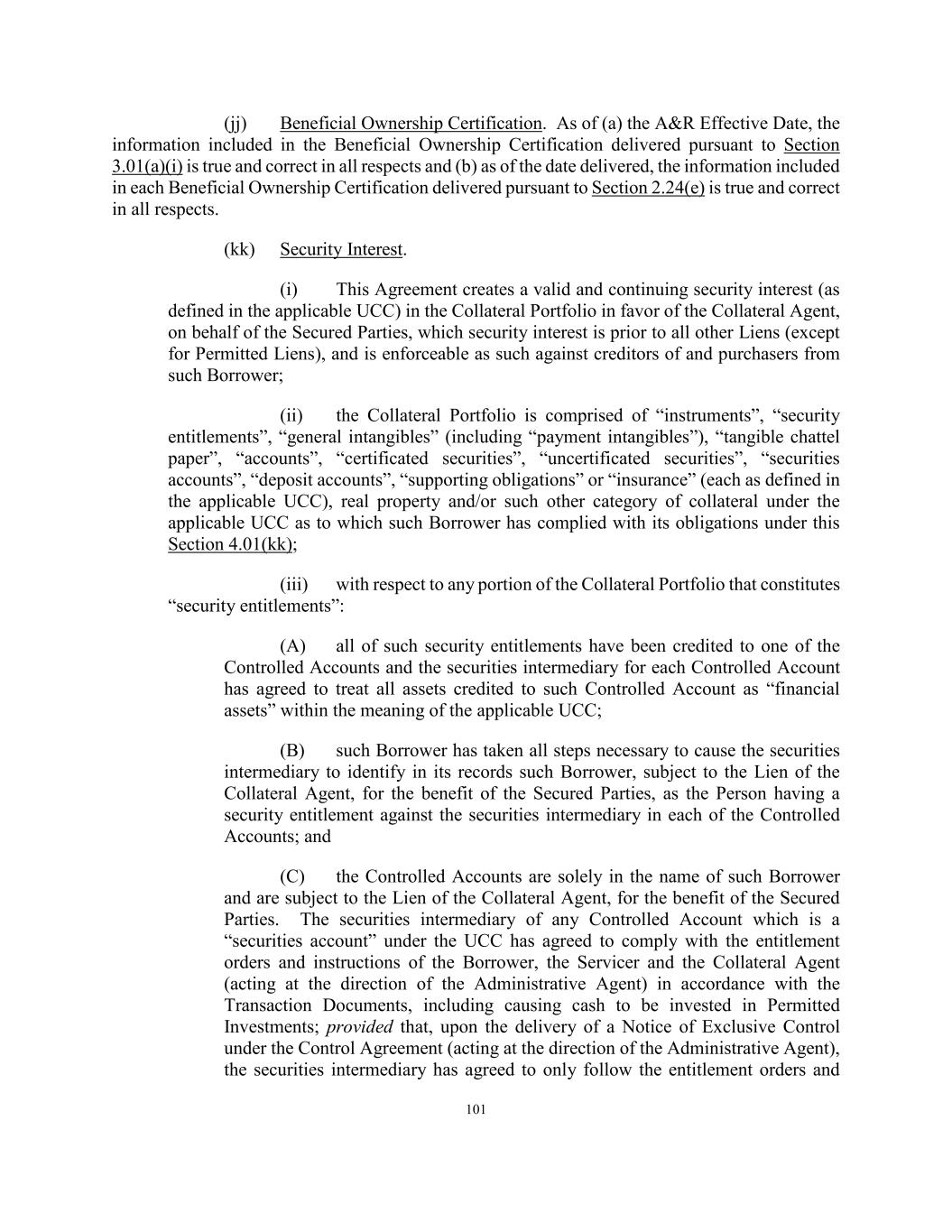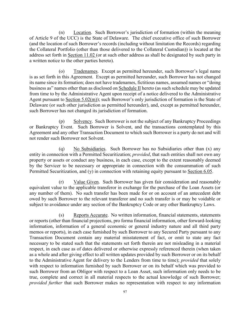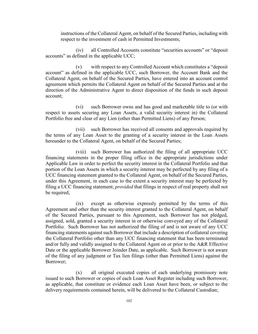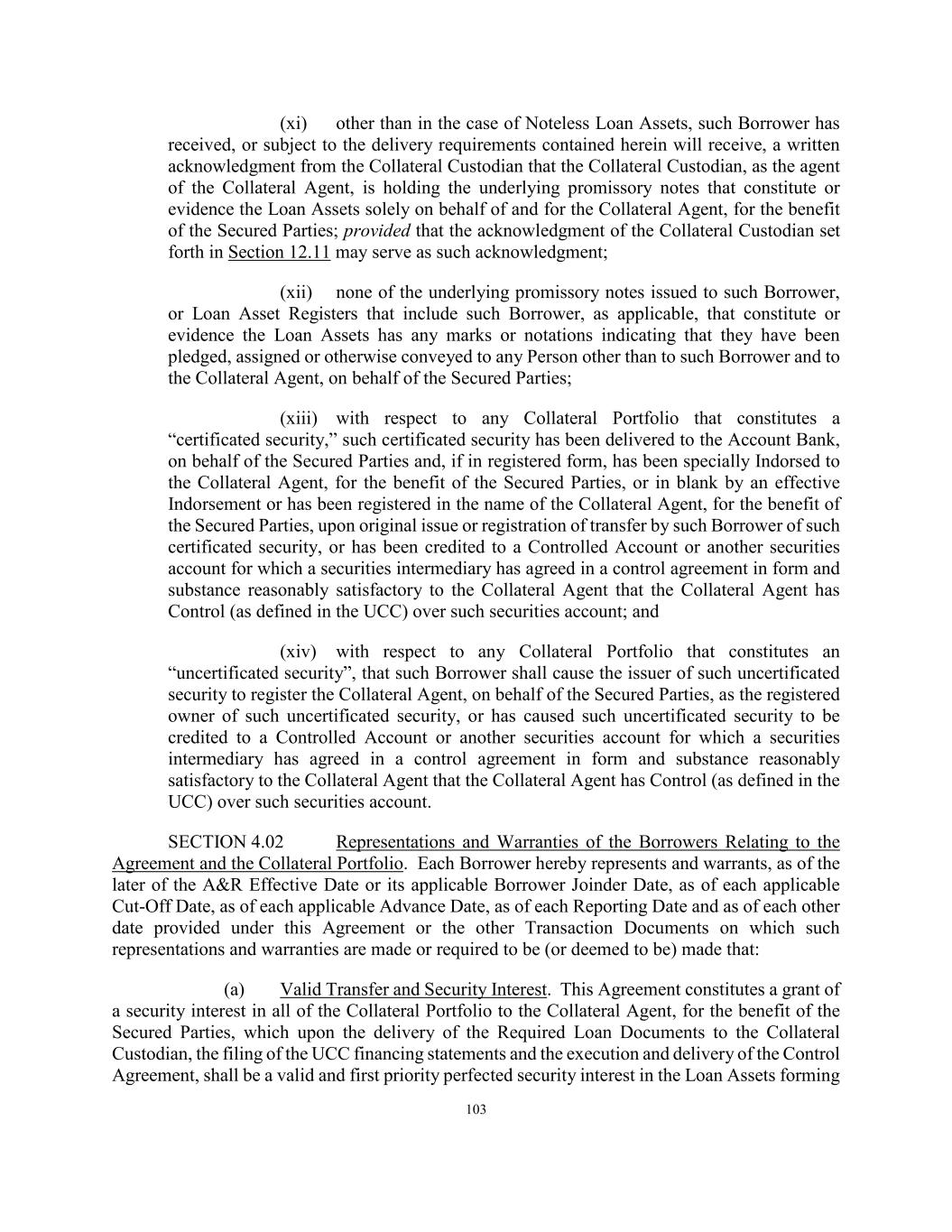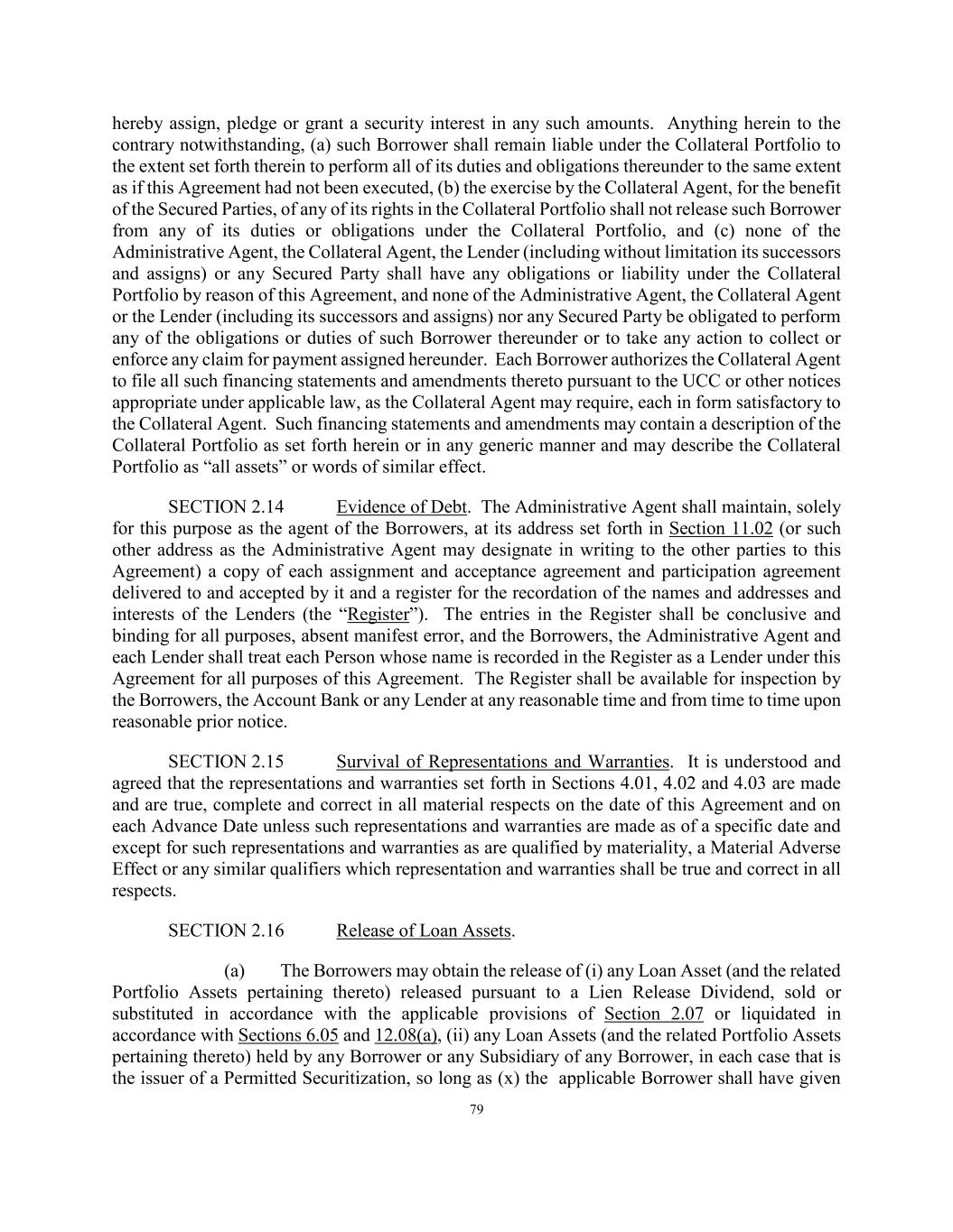 79 hereby assign, pledge or grant a security interest in any such amounts. Anything herein to the contrary notwithstanding, (a) such Borrower shall remain liable under the Collateral Portfolio to the extent set forth therein to perform all of its duties and obligations thereunder to the same extent as if this Agreement had not been executed, (b) the exercise by the Collateral Agent, for the benefit of the Secured Parties, of any of its rights in the Collateral Portfolio shall not release such Borrower from any of its duties or obligations under the Collateral Portfolio, and (c) none of the Administrative Agent, the Collateral Agent, the Lender (including without limitation its successors and assigns) or any Secured Party shall have any obligations or liability under the Collateral Portfolio by reason of this Agreement, and none of the Administrative Agent, the Collateral Agent or the Lender (including its successors and assigns) nor any Secured Party be obligated to perform any of the obligations or duties of such Borrower thereunder or to take any action to collect or enforce any claim for payment assigned hereunder. Each Borrower authorizes the Collateral Agent to file all such financing statements and amendments thereto pursuant to the UCC or other notices appropriate under applicable law, as the Collateral Agent may require, each in form satisfactory to the Collateral Agent. Such financing statements and amendments may contain a description of the Collateral Portfolio as set forth herein or in any generic manner and may describe the Collateral Portfolio as “all assets” or words of similar effect. SECTION 2.14 Evidence of Debt. The Administrative Agent shall maintain, solely for this purpose as the agent of the Borrowers, at its address set forth in Section 11.02 (or such other address as the Administrative Agent may designate in writing to the other parties to this Agreement) a copy of each assignment and acceptance agreement and participation agreement delivered to and accepted by it and a register for the recordation of the names and addresses and interests of the Lenders (the “Register”). The entries in the Register shall be conclusive and binding for all purposes, absent manifest error, and the Borrowers, the Administrative Agent and each Lender shall treat each Person whose name is recorded in the Register as a Lender under this Agreement for all purposes of this Agreement. The Register shall be available for inspection by the Borrowers, the Account Bank or any Lender at any reasonable time and from time to time upon reasonable prior notice. SECTION 2.15 Survival of Representations and Warranties. It is understood and agreed that the representations and warranties set forth in Sections 4.01, 4.02 and 4.03 are made and are true, complete and correct in all material respects on the date of this Agreement and on each Advance Date unless such representations and warranties are made as of a specific date and except for such representations and warranties as are qualified by materiality, a Material Adverse Effect or any similar qualifiers which representation and warranties shall be true and correct in all respects. SECTION 2.16 Release of Loan Assets. (a) The Borrowers may obtain the release of (i) any Loan Asset (and the related Portfolio Assets pertaining thereto) released pursuant to a Lien Release Dividend, sold or substituted in accordance with the applicable provisions of Section 2.07 or liquidated in accordance with Sections 6.05 and 12.08(a), (ii) any Loan Assets (and the related Portfolio Assets pertaining thereto) held by any Borrower or any Subsidiary of any Borrower, in each case that is the issuer of a Permitted Securitization, so long as (x) the applicable Borrower shall have given