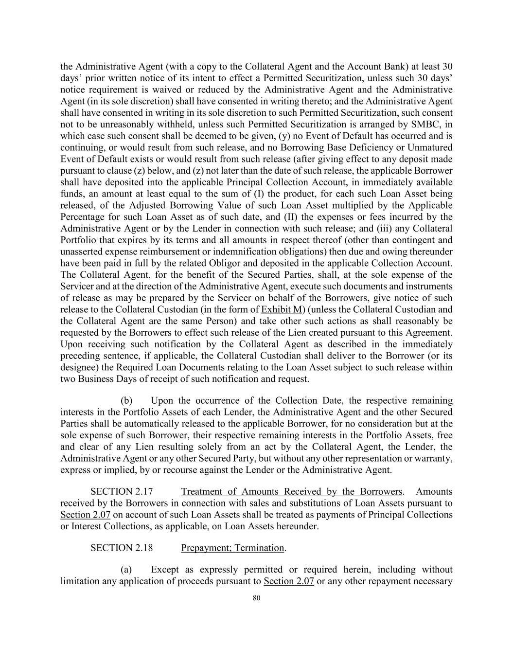 80 the Administrative Agent (with a copy to the Collateral Agent and the Account Bank) at least 30 days’ prior written notice of its intent to effect a Permitted Securitization, unless such 30 days’ notice requirement is waived or reduced by the Administrative Agent and the Administrative Agent (in its sole discretion) shall have consented in writing thereto; and the Administrative Agent shall have consented in writing in its sole discretion to such Permitted Securitization, such consent not to be unreasonably withheld, unless such Permitted Securitization is arranged by SMBC, in which case such consent shall be deemed to be given, (y) no Event of Default has occurred and is continuing, or would result from such release, and no Borrowing Base Deficiency or Unmatured Event of Default exists or would result from such release (after giving effect to any deposit made pursuant to clause (z) below, and (z) not later than the date of such release, the applicable Borrower shall have deposited into the applicable Principal Collection Account, in immediately available funds, an amount at least equal to the sum of (I) the product, for each such Loan Asset being released, of the Adjusted Borrowing Value of such Loan Asset multiplied by the Applicable Percentage for such Loan Asset as of such date, and (II) the expenses or fees incurred by the Administrative Agent or by the Lender in connection with such release; and (iii) any Collateral Portfolio that expires by its terms and all amounts in respect thereof (other than contingent and unasserted expense reimbursement or indemnification obligations) then due and owing thereunder have been paid in full by the related Obligor and deposited in the applicable Collection Account. The Collateral Agent, for the benefit of the Secured Parties, shall, at the sole expense of the Servicer and at the direction of the Administrative Agent, execute such documents and instruments of release as may be prepared by the Servicer on behalf of the Borrowers, give notice of such release to the Collateral Custodian (in the form of Exhibit M) (unless the Collateral Custodian and the Collateral Agent are the same Person) and take other such actions as shall reasonably be requested by the Borrowers to effect such release of the Lien created pursuant to this Agreement. Upon receiving such notification by the Collateral Agent as described in the immediately preceding sentence, if applicable, the Collateral Custodian shall deliver to the Borrower (or its designee) the Required Loan Documents relating to the Loan Asset subject to such release within two Business Days of receipt of such notification and request. (b) Upon the occurrence of the Collection Date, the respective remaining interests in the Portfolio Assets of each Lender, the Administrative Agent and the other Secured Parties shall be automatically released to the applicable Borrower, for no consideration but at the sole expense of such Borrower, their respective remaining interests in the Portfolio Assets, free and clear of any Lien resulting solely from an act by the Collateral Agent, the Lender, the Administrative Agent or any other Secured Party, but without any other representation or warranty, express or implied, by or recourse against the Lender or the Administrative Agent. SECTION 2.17 Treatment of Amounts Received by the Borrowers. Amounts received by the Borrowers in connection with sales and substitutions of Loan Assets pursuant to Section 2.07 on account of such Loan Assets shall be treated as payments of Principal Collections or Interest Collections, as applicable, on Loan Assets hereunder. SECTION 2.18 Prepayment; Termination. (a) Except as expressly permitted or required herein, including without limitation any application of proceeds pursuant to Section 2.07 or any other repayment necessary
