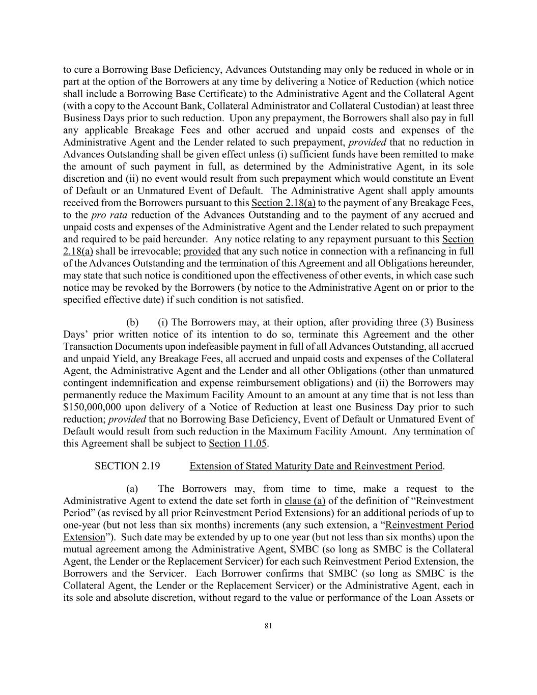 81 to cure a Borrowing Base Deficiency, Advances Outstanding may only be reduced in whole or in part at the option of the Borrowers at any time by delivering a Notice of Reduction (which notice shall include a Borrowing Base Certificate) to the Administrative Agent and the Collateral Agent (with a copy to the Account Bank, Collateral Administrator and Collateral Custodian) at least three Business Days prior to such reduction. Upon any prepayment, the Borrowers shall also pay in full any applicable Breakage Fees and other accrued and unpaid costs and expenses of the Administrative Agent and the Lender related to such prepayment, provided that no reduction in Advances Outstanding shall be given effect unless (i) sufficient funds have been remitted to make the amount of such payment in full, as determined by the Administrative Agent, in its sole discretion and (ii) no event would result from such prepayment which would constitute an Event of Default or an Unmatured Event of Default. The Administrative Agent shall apply amounts received from the Borrowers pursuant to this Section 2.18(a) to the payment of any Breakage Fees, to the pro rata reduction of the Advances Outstanding and to the payment of any accrued and unpaid costs and expenses of the Administrative Agent and the Lender related to such prepayment and required to be paid hereunder. Any notice relating to any repayment pursuant to this Section 2.18(a) shall be irrevocable; provided that any such notice in connection with a refinancing in full of the Advances Outstanding and the termination of this Agreement and all Obligations hereunder, may state that such notice is conditioned upon the effectiveness of other events, in which case such notice may be revoked by the Borrowers (by notice to the Administrative Agent on or prior to the specified effective date) if such condition is not satisfied. (b) (i) The Borrowers may, at their option, after providing three (3) Business Days’ prior written notice of its intention to do so, terminate this Agreement and the other Transaction Documents upon indefeasible payment in full of all Advances Outstanding, all accrued and unpaid Yield, any Breakage Fees, all accrued and unpaid costs and expenses of the Collateral Agent, the Administrative Agent and the Lender and all other Obligations (other than unmatured contingent indemnification and expense reimbursement obligations) and (ii) the Borrowers may permanently reduce the Maximum Facility Amount to an amount at any time that is not less than $150,000,000 upon delivery of a Notice of Reduction at least one Business Day prior to such reduction; provided that no Borrowing Base Deficiency, Event of Default or Unmatured Event of Default would result from such reduction in the Maximum Facility Amount. Any termination of this Agreement shall be subject to Section 11.05. SECTION 2.19 Extension of Stated Maturity Date and Reinvestment Period. (a) The Borrowers may, from time to time, make a request to the Administrative Agent to extend the date set forth in clause (a) of the definition of “Reinvestment Period” (as revised by all prior Reinvestment Period Extensions) for an additional periods of up to one-year (but not less than six months) increments (any such extension, a “Reinvestment Period Extension”). Such date may be extended by up to one year (but not less than six months) upon the mutual agreement among the Administrative Agent, SMBC (so long as SMBC is the Collateral Agent, the Lender or the Replacement Servicer) for each such Reinvestment Period Extension, the Borrowers and the Servicer. Each Borrower confirms that SMBC (so long as SMBC is the Collateral Agent, the Lender or the Replacement Servicer) or the Administrative Agent, each in its sole and absolute discretion, without regard to the value or performance of the Loan Assets or