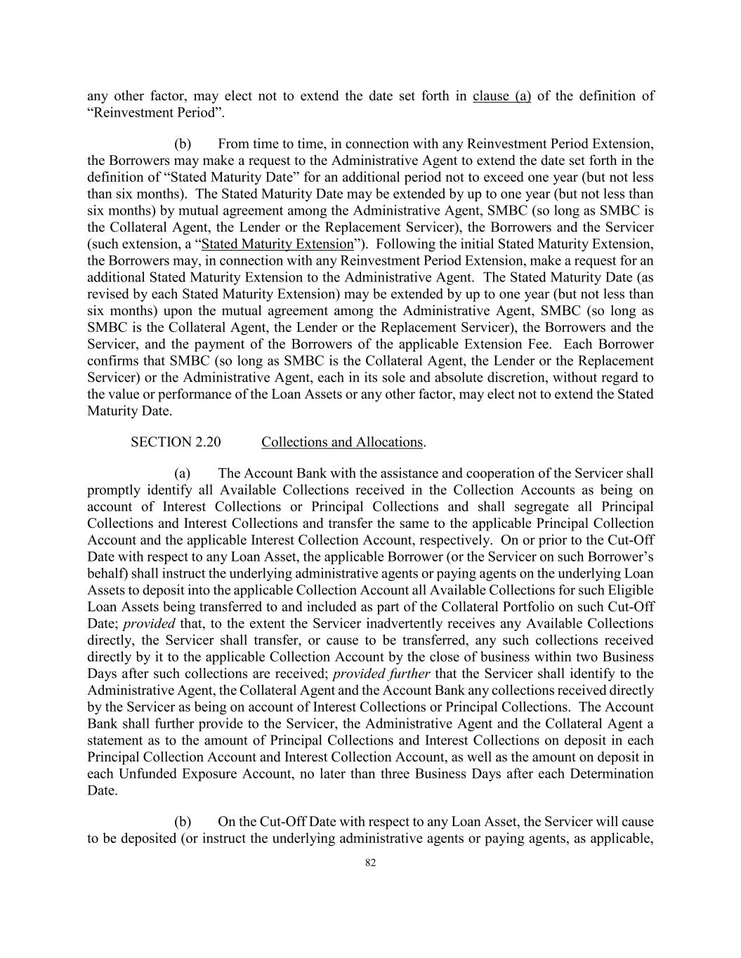 82 any other factor, may elect not to extend the date set forth in clause (a) of the definition of “Reinvestment Period”. (b) From time to time, in connection with any Reinvestment Period Extension, the Borrowers may make a request to the Administrative Agent to extend the date set forth in the definition of “Stated Maturity Date” for an additional period not to exceed one year (but not less than six months). The Stated Maturity Date may be extended by up to one year (but not less than six months) by mutual agreement among the Administrative Agent, SMBC (so long as SMBC is the Collateral Agent, the Lender or the Replacement Servicer), the Borrowers and the Servicer (such extension, a “Stated Maturity Extension”). Following the initial Stated Maturity Extension, the Borrowers may, in connection with any Reinvestment Period Extension, make a request for an additional Stated Maturity Extension to the Administrative Agent. The Stated Maturity Date (as revised by each Stated Maturity Extension) may be extended by up to one year (but not less than six months) upon the mutual agreement among the Administrative Agent, SMBC (so long as SMBC is the Collateral Agent, the Lender or the Replacement Servicer), the Borrowers and the Servicer, and the payment of the Borrowers of the applicable Extension Fee. Each Borrower confirms that SMBC (so long as SMBC is the Collateral Agent, the Lender or the Replacement Servicer) or the Administrative Agent, each in its sole and absolute discretion, without regard to the value or performance of the Loan Assets or any other factor, may elect not to extend the Stated Maturity Date. SECTION 2.20 Collections and Allocations. (a) The Account Bank with the assistance and cooperation of the Servicer shall promptly identify all Available Collections received in the Collection Accounts as being on account of Interest Collections or Principal Collections and shall segregate all Principal Collections and Interest Collections and transfer the same to the applicable Principal Collection Account and the applicable Interest Collection Account, respectively. On or prior to the Cut-Off Date with respect to any Loan Asset, the applicable Borrower (or the Servicer on such Borrower’s behalf) shall instruct the underlying administrative agents or paying agents on the underlying Loan Assets to deposit into the applicable Collection Account all Available Collections for such Eligible Loan Assets being transferred to and included as part of the Collateral Portfolio on such Cut-Off Date; provided that, to the extent the Servicer inadvertently receives any Available Collections directly, the Servicer shall transfer, or cause to be transferred, any such collections received directly by it to the applicable Collection Account by the close of business within two Business Days after such collections are received; provided further that the Servicer shall identify to the Administrative Agent, the Collateral Agent and the Account Bank any collections received directly by the Servicer as being on account of Interest Collections or Principal Collections. The Account Bank shall further provide to the Servicer, the Administrative Agent and the Collateral Agent a statement as to the amount of Principal Collections and Interest Collections on deposit in each Principal Collection Account and Interest Collection Account, as well as the amount on deposit in each Unfunded Exposure Account, no later than three Business Days after each Determination Date. (b) On the Cut-Off Date with respect to any Loan Asset, the Servicer will cause to be deposited (or instruct the underlying administrative agents or paying agents, as applicable,