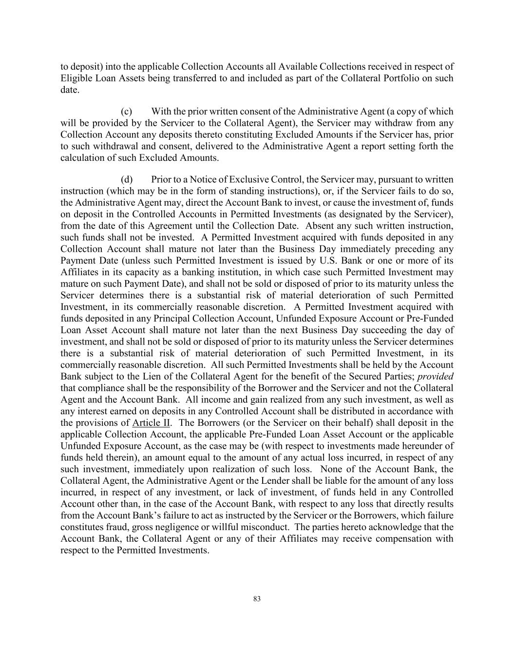 83 to deposit) into the applicable Collection Accounts all Available Collections received in respect of Eligible Loan Assets being transferred to and included as part of the Collateral Portfolio on such date. (c) With the prior written consent of the Administrative Agent (a copy of which will be provided by the Servicer to the Collateral Agent), the Servicer may withdraw from any Collection Account any deposits thereto constituting Excluded Amounts if the Servicer has, prior to such withdrawal and consent, delivered to the Administrative Agent a report setting forth the calculation of such Excluded Amounts. (d) Prior to a Notice of Exclusive Control, the Servicer may, pursuant to written instruction (which may be in the form of standing instructions), or, if the Servicer fails to do so, the Administrative Agent may, direct the Account Bank to invest, or cause the investment of, funds on deposit in the Controlled Accounts in Permitted Investments (as designated by the Servicer), from the date of this Agreement until the Collection Date. Absent any such written instruction, such funds shall not be invested. A Permitted Investment acquired with funds deposited in any Collection Account shall mature not later than the Business Day immediately preceding any Payment Date (unless such Permitted Investment is issued by U.S. Bank or one or more of its Affiliates in its capacity as a banking institution, in which case such Permitted Investment may mature on such Payment Date), and shall not be sold or disposed of prior to its maturity unless the Servicer determines there is a substantial risk of material deterioration of such Permitted Investment, in its commercially reasonable discretion. A Permitted Investment acquired with funds deposited in any Principal Collection Account, Unfunded Exposure Account or Pre-Funded Loan Asset Account shall mature not later than the next Business Day succeeding the day of investment, and shall not be sold or disposed of prior to its maturity unless the Servicer determines there is a substantial risk of material deterioration of such Permitted Investment, in its commercially reasonable discretion. All such Permitted Investments shall be held by the Account Bank subject to the Lien of the Collateral Agent for the benefit of the Secured Parties; provided that compliance shall be the responsibility of the Borrower and the Servicer and not the Collateral Agent and the Account Bank. All income and gain realized from any such investment, as well as any interest earned on deposits in any Controlled Account shall be distributed in accordance with the provisions of Article II. The Borrowers (or the Servicer on their behalf) shall deposit in the applicable Collection Account, the applicable Pre-Funded Loan Asset Account or the applicable Unfunded Exposure Account, as the case may be (with respect to investments made hereunder of funds held therein), an amount equal to the amount of any actual loss incurred, in respect of any such investment, immediately upon realization of such loss. None of the Account Bank, the Collateral Agent, the Administrative Agent or the Lender shall be liable for the amount of any loss incurred, in respect of any investment, or lack of investment, of funds held in any Controlled Account other than, in the case of the Account Bank, with respect to any loss that directly results from the Account Bank’s failure to act as instructed by the Servicer or the Borrowers, which failure constitutes fraud, gross negligence or willful misconduct. The parties hereto acknowledge that the Account Bank, the Collateral Agent or any of their Affiliates may receive compensation with respect to the Permitted Investments.
