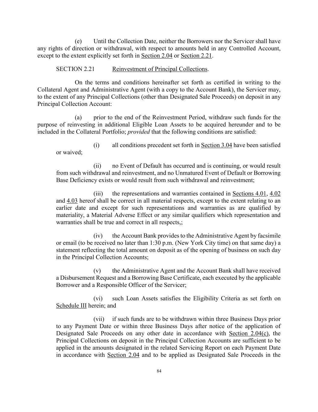 84 (e) Until the Collection Date, neither the Borrowers nor the Servicer shall have any rights of direction or withdrawal, with respect to amounts held in any Controlled Account, except to the extent explicitly set forth in Section 2.04 or Section 2.21. SECTION 2.21 Reinvestment of Principal Collections. On the terms and conditions hereinafter set forth as certified in writing to the Collateral Agent and Administrative Agent (with a copy to the Account Bank), the Servicer may, to the extent of any Principal Collections (other than Designated Sale Proceeds) on deposit in any Principal Collection Account: (a) prior to the end of the Reinvestment Period, withdraw such funds for the purpose of reinvesting in additional Eligible Loan Assets to be acquired hereunder and to be included in the Collateral Portfolio; provided that the following conditions are satisfied: (i) all conditions precedent set forth in Section 3.04 have been satisfied or waived; (ii) no Event of Default has occurred and is continuing, or would result from such withdrawal and reinvestment, and no Unmatured Event of Default or Borrowing Base Deficiency exists or would result from such withdrawal and reinvestment; (iii) the representations and warranties contained in Sections 4.01, 4.02 and 4.03 hereof shall be correct in all material respects, except to the extent relating to an earlier date and except for such representations and warranties as are qualified by materiality, a Material Adverse Effect or any similar qualifiers which representation and warranties shall be true and correct in all respects,; (iv) the Account Bank provides to the Administrative Agent by facsimile or email (to be received no later than 1:30 p.m. (New York City time) on that same day) a statement reflecting the total amount on deposit as of the opening of business on such day in the Principal Collection Accounts; (v) the Administrative Agent and the Account Bank shall have received a Disbursement Request and a Borrowing Base Certificate, each executed by the applicable Borrower and a Responsible Officer of the Servicer; (vi) such Loan Assets satisfies the Eligibility Criteria as set forth on Schedule III herein; and (vii) if such funds are to be withdrawn within three Business Days prior to any Payment Date or within three Business Days after notice of the application of Designated Sale Proceeds on any other date in accordance with Section 2.04(c), the Principal Collections on deposit in the Principal Collection Accounts are sufficient to be applied in the amounts designated in the related Servicing Report on each Payment Date in accordance with Section 2.04 and to be applied as Designated Sale Proceeds in the
