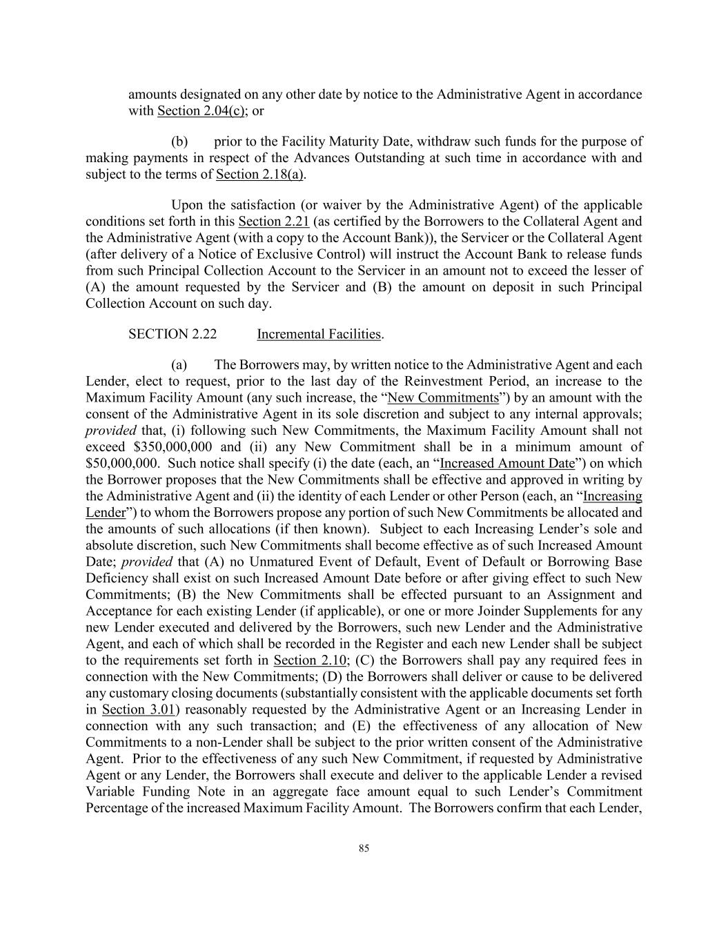 85 amounts designated on any other date by notice to the Administrative Agent in accordance with Section 2.04(c); or (b) prior to the Facility Maturity Date, withdraw such funds for the purpose of making payments in respect of the Advances Outstanding at such time in accordance with and subject to the terms of Section 2.18(a). Upon the satisfaction (or waiver by the Administrative Agent) of the applicable conditions set forth in this Section 2.21 (as certified by the Borrowers to the Collateral Agent and the Administrative Agent (with a copy to the Account Bank)), the Servicer or the Collateral Agent (after delivery of a Notice of Exclusive Control) will instruct the Account Bank to release funds from such Principal Collection Account to the Servicer in an amount not to exceed the lesser of (A) the amount requested by the Servicer and (B) the amount on deposit in such Principal Collection Account on such day. SECTION 2.22 Incremental Facilities. (a) The Borrowers may, by written notice to the Administrative Agent and each Lender, elect to request, prior to the last day of the Reinvestment Period, an increase to the Maximum Facility Amount (any such increase, the “New Commitments”) by an amount with the consent of the Administrative Agent in its sole discretion and subject to any internal approvals; provided that, (i) following such New Commitments, the Maximum Facility Amount shall not exceed $350,000,000 and (ii) any New Commitment shall be in a minimum amount of $50,000,000. Such notice shall specify (i) the date (each, an “Increased Amount Date”) on which the Borrower proposes that the New Commitments shall be effective and approved in writing by the Administrative Agent and (ii) the identity of each Lender or other Person (each, an “Increasing Lender”) to whom the Borrowers propose any portion of such New Commitments be allocated and the amounts of such allocations (if then known). Subject to each Increasing Lender’s sole and absolute discretion, such New Commitments shall become effective as of such Increased Amount Date; provided that (A) no Unmatured Event of Default, Event of Default or Borrowing Base Deficiency shall exist on such Increased Amount Date before or after giving effect to such New Commitments; (B) the New Commitments shall be effected pursuant to an Assignment and Acceptance for each existing Lender (if applicable), or one or more Joinder Supplements for any new Lender executed and delivered by the Borrowers, such new Lender and the Administrative Agent, and each of which shall be recorded in the Register and each new Lender shall be subject to the requirements set forth in Section 2.10; (C) the Borrowers shall pay any required fees in connection with the New Commitments; (D) the Borrowers shall deliver or cause to be delivered any customary closing documents (substantially consistent with the applicable documents set forth in Section 3.01) reasonably requested by the Administrative Agent or an Increasing Lender in connection with any such transaction; and (E) the effectiveness of any allocation of New Commitments to a non-Lender shall be subject to the prior written consent of the Administrative Agent. Prior to the effectiveness of any such New Commitment, if requested by Administrative Agent or any Lender, the Borrowers shall execute and deliver to the applicable Lender a revised Variable Funding Note in an aggregate face amount equal to such Lender’s Commitment Percentage of the increased Maximum Facility Amount. The Borrowers confirm that each Lender,